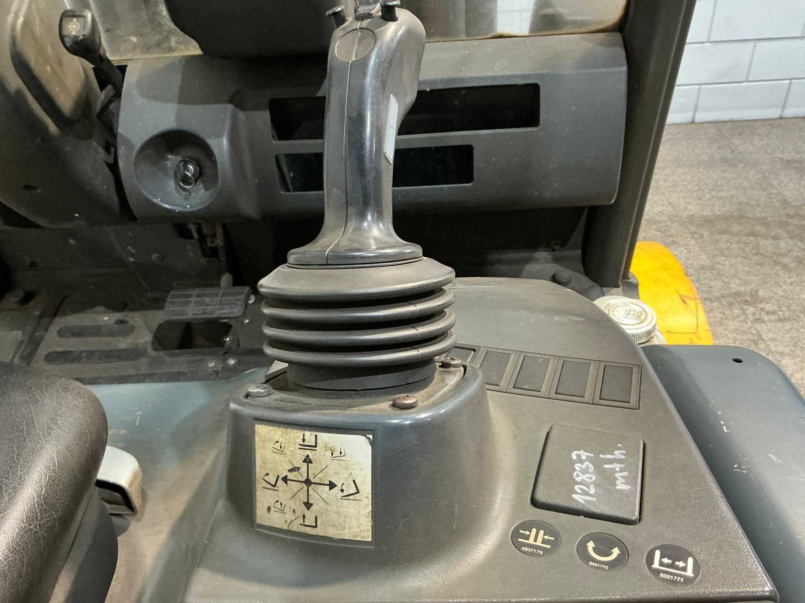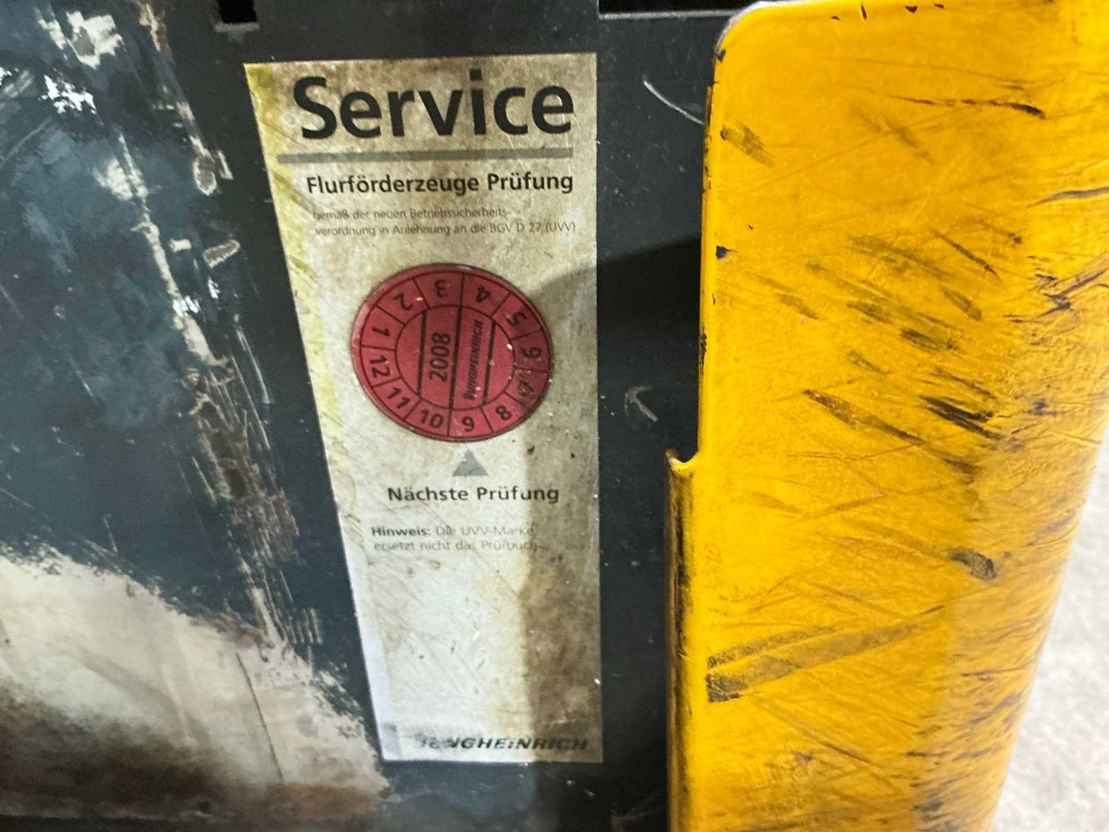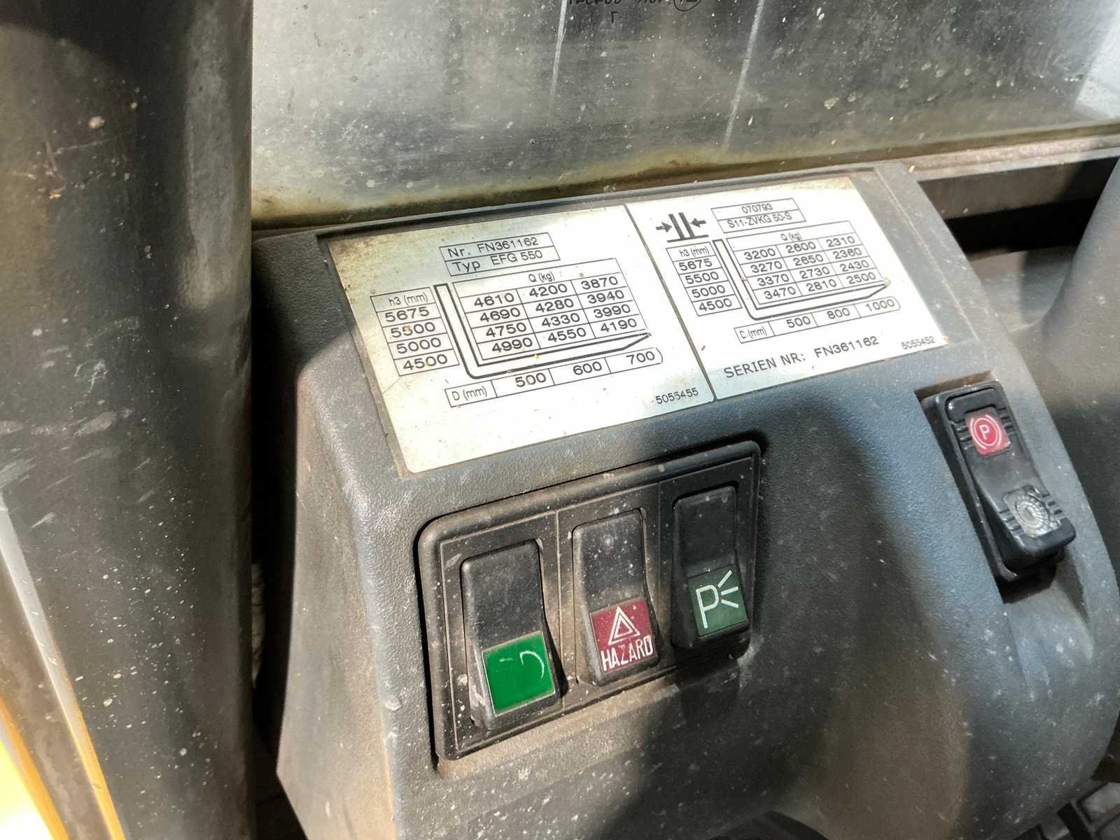 Batterij 2018 3de+4de ventiel tot vorkenbord No Merk: Jungheinrich Type: EFG550 Bouwjaar: 2007 Brandstof: Elektrisch Aantal wielen: 4 Afgelezen urenstand: 12034 Accu lader: true Free-lift: true Side-shift: false Triple mast: true Eigen gewicht: 7300kg Hefvermogen: 5000kg Lepellengte: 1200mm Hefhoogte: 5670mm Vol rubber banden: true Minimale doorrijhoogte: 2500mm Totale afmeting L: 3980mm Totale afmeting Breedte: 1480mm Totale afmeting Hoogte: 2680mm