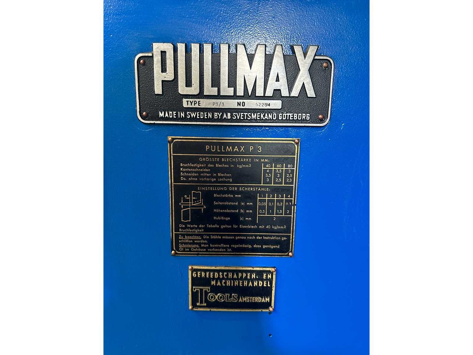 No Merk: Pullmax Type: P3/3 Max. plaatdikte: 4mm Voetbediening: true Aansluiting: 400V Machinegewicht: 500kg Afmeting l: 1850mm Afmeting b: 750mm Afmeting h: 1750mm