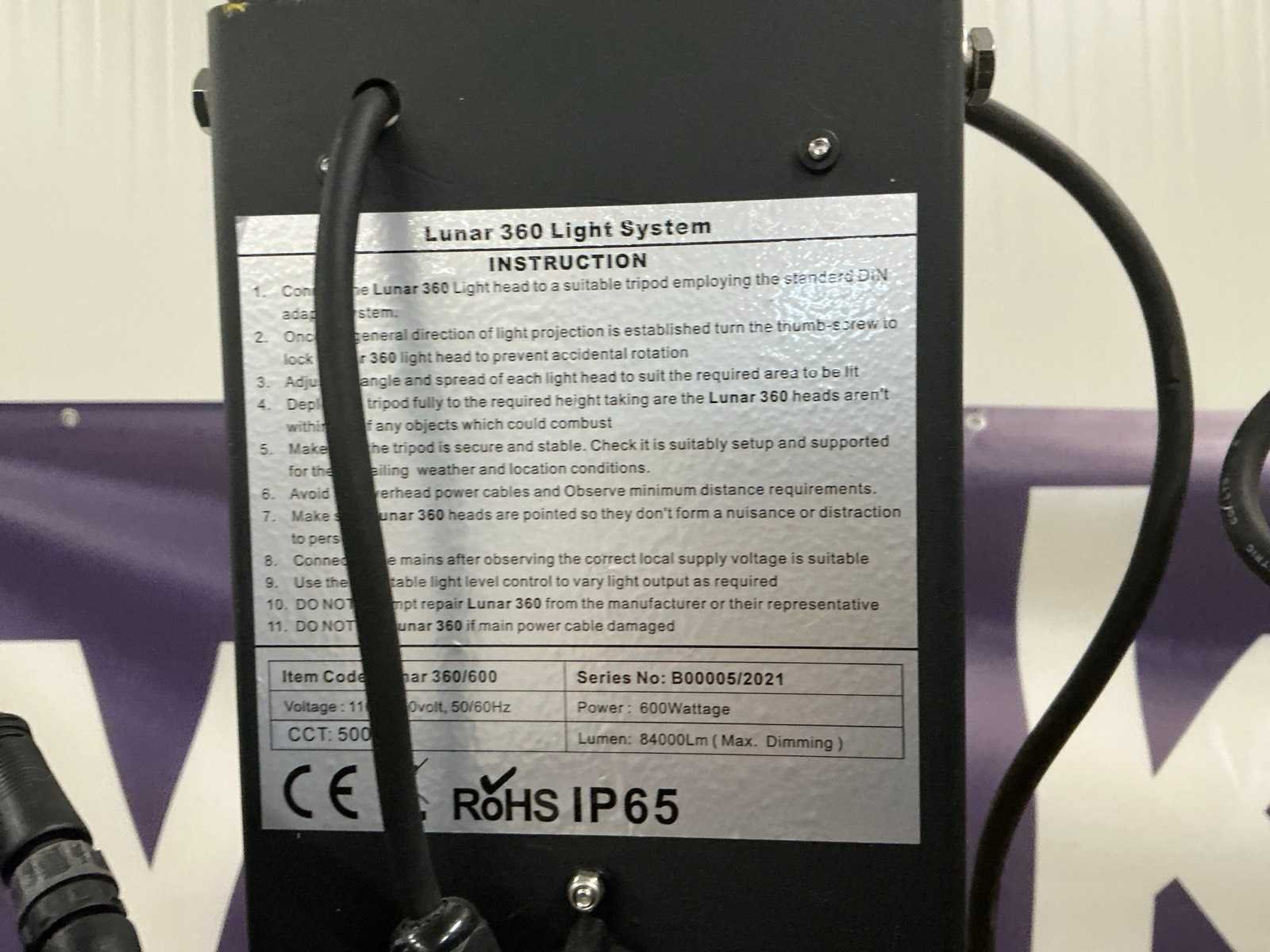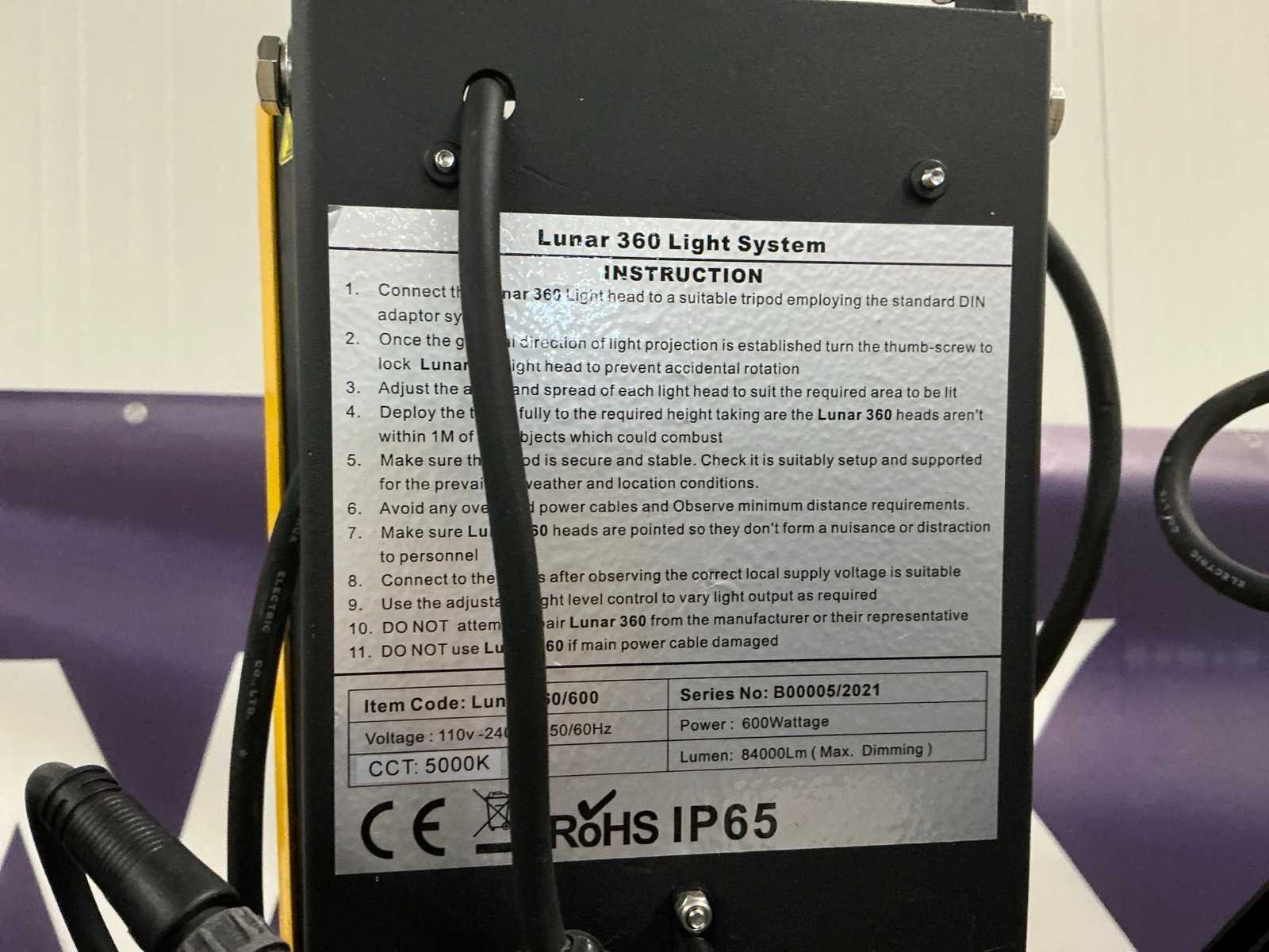 Voorzien van 6 verstelbare armaturen, 5000k, max 84000lumen, inclusief opbergtas voor lampen Nee Type: Lunar 360 Bouwjaar: 2021 LED: true Vermogen: 600W Statief: true Beschermingsgraad (ip): 65 Aansluiting: 230V
