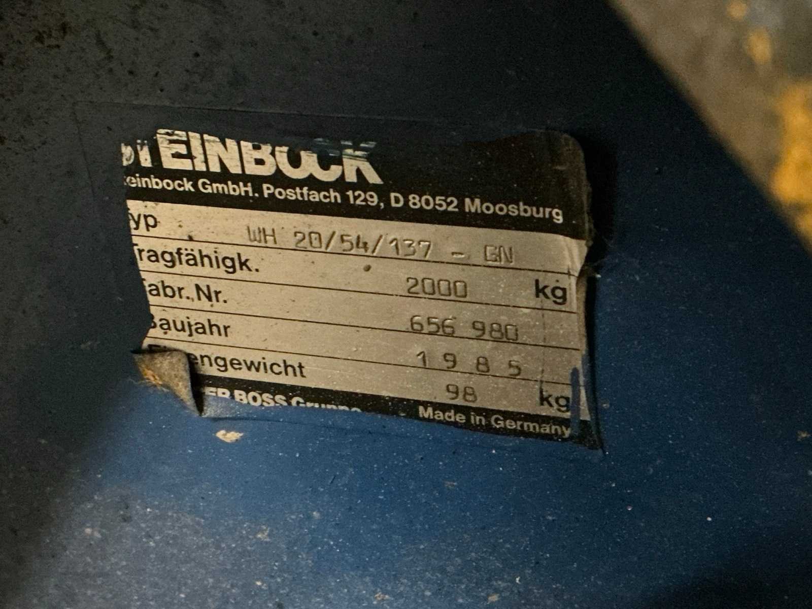 Nee Merk: Steinbock Type: WH 20/54/137GN Hefvermogen: 2000kg Lepellengte: 1370mm Totale afmeting L: 1700mm Totale afmeting Breedte: 540mm Totale afmeting Hoogte: 1300mm