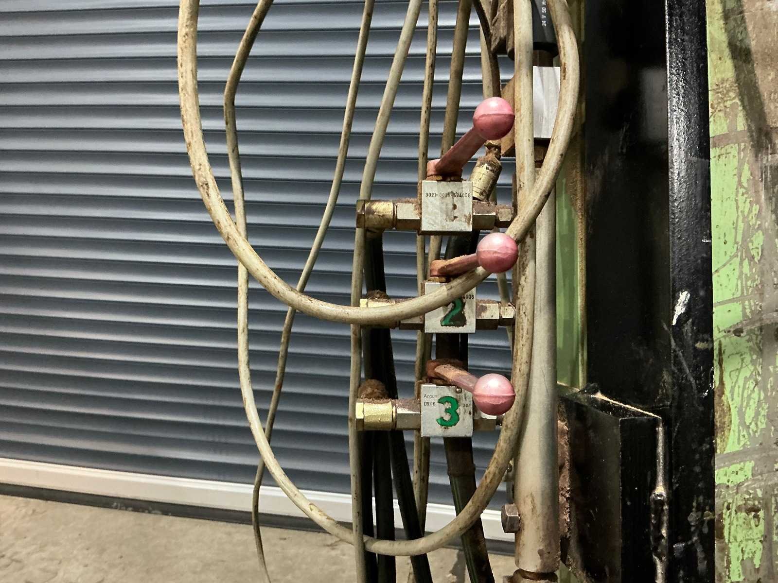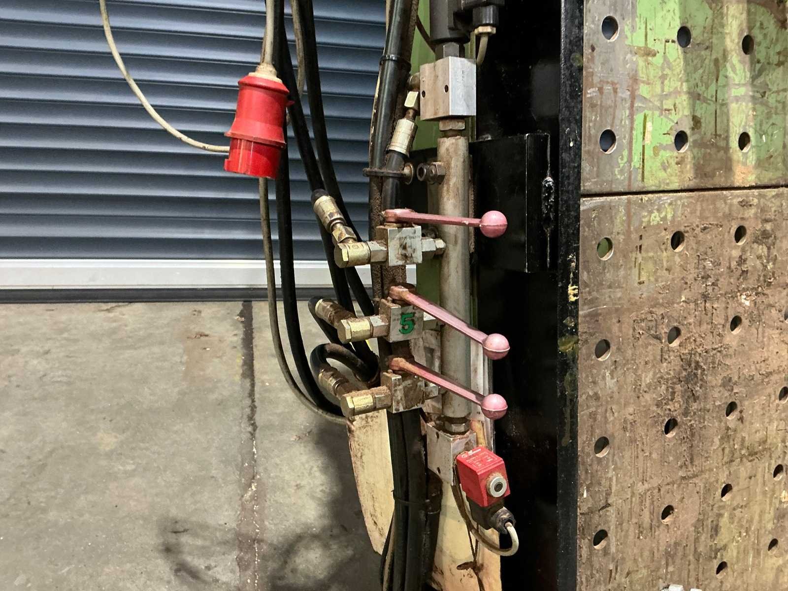 Netto opsluitmaat: 3680*2700mm 6 hydraulische stempels in twee groepen Elektrische bediening Afmeting module 980x980 mm Opstellingshoek 70-81° of horizontaal Diameter gaten 25 mm Steek van de gaten 122,5 mm Hoogte aanslaglijst 130 mm Max werkstuk breedte: 140mm Max werkstuk lengte: 3400mm Max werkstuk hoogte: 2500mm Nee Merk: Trabo Type: WSB43 Serienummer: 104790/0007 Aansluiting: 400V