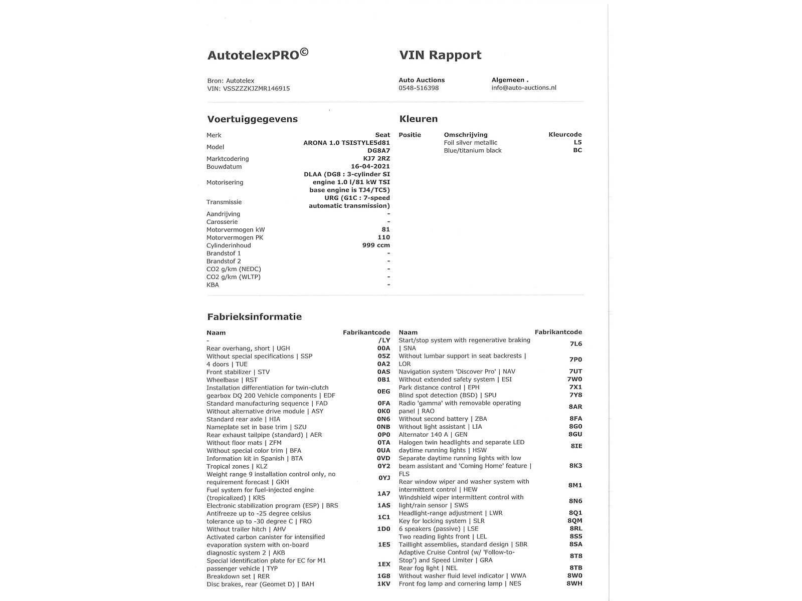 Voor vragen kunt u mailen naar info@auto-auctions.nl Chassisnummer/Vin: VSSZZZKJZMR146915 No Kenteken: HZP-54-B Merk: Seat Model: Arona Type: 1.0 TSI Style Business Intense Plus Afgelezen kilometerstand: 97138km Cilinderinhoud: 999cc Vermogen (kW): 81kW Brandstof: Benzine Chassisnummer: VSSZZZKJZMR146915 NAP status: Geen oordeel Datum eerste toelating: 2021-05-26 APK vervaldatum: 2025-05-26 Vermogen (pk): 109hp Aantal zitplaatsen: 5 Maximaal trekgewicht ongeremd: 1100kg Maximaal trekgewicht geremd: 600kg Kleur: grijs Transmissie: Automaat Emissieklasse: 6 Aantal deuren: 5 Aantal sleutels: 2 Ledig gewicht: 1110kg Bruto BPM (NL): 503€ Aantal cilinders: 3 Carrosserie: Hatchback Carfax Link: https://was.carfax.eu/v0/api/ccdid/5100016408/svc/201/vinreg/HZP54B/checksum/eyJhbGciOiJIUzI1NiIsInR5cCI6IkpXVCJ9.eyJleHAiOjE3NzM0OTQxNTh9.qSuayaQDR25FT-tWG7P79-qdbfG1ZZxXS_0iNz9iUVE Start en rijdt: Ja