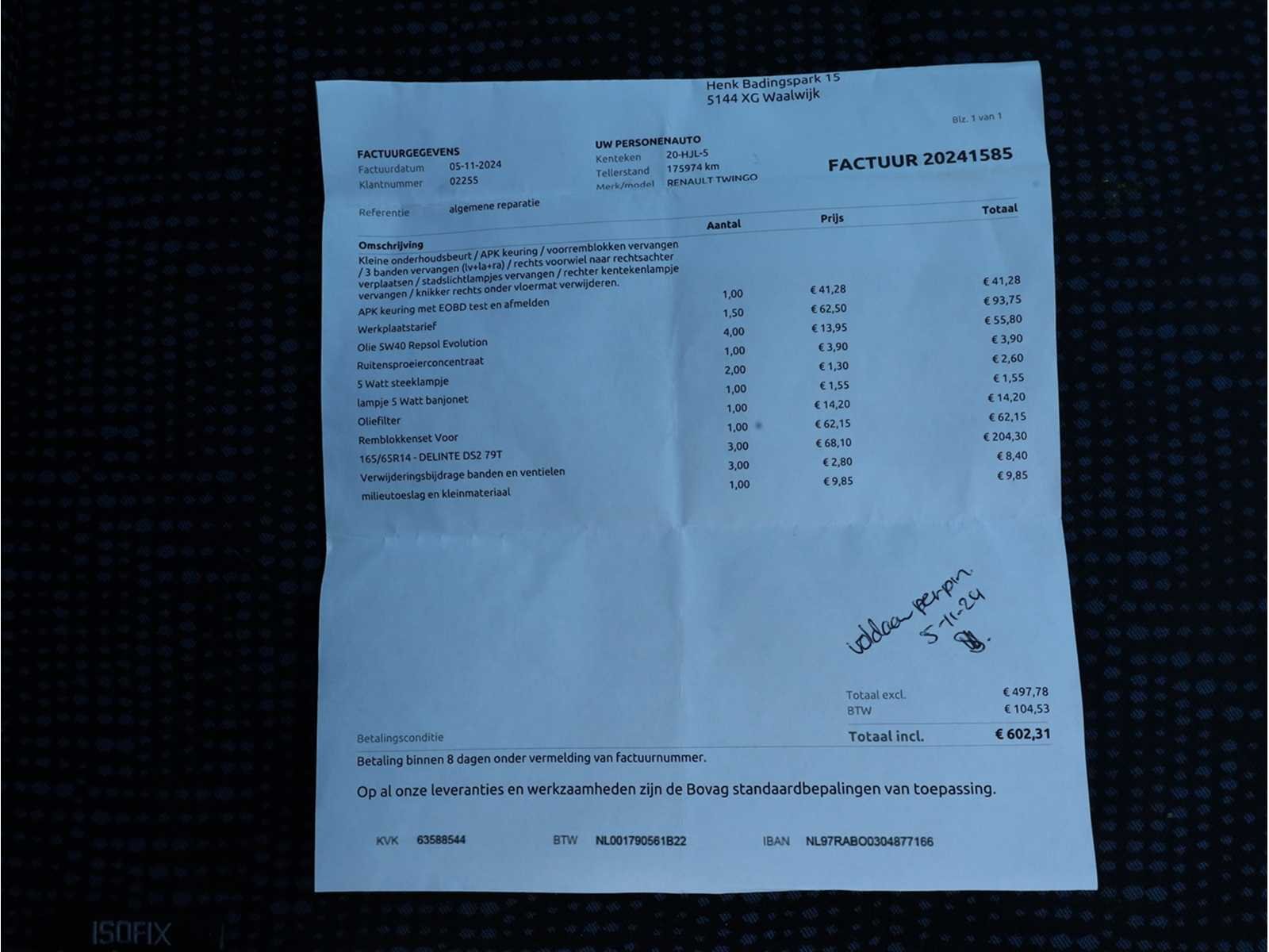 Voor vragen kunt u mailen naar info@auto-auctions.nl Chassisnummer/Vin: VF1CN0D0540725502 No Kenteken: 20-HJL-5 Merk: Renault Model: Twingo Type: 1.2 Authentique Afgelezen kilometerstand: 198875km Cilinderinhoud: 1149cc Vermogen (kW): 43kW Brandstof: Benzine Chassisnummer: VF1CN0D0540725502 NAP status: Logisch Datum eerste toelating: 2008-12-19 Datum eerste toelating (NL): 2008-12-19 APK vervaldatum: 2027-01-06 Vermogen (pk): 58hp Aantal zitplaatsen: 4 Maximaal trekgewicht geremd: 350kg Kleur: zwart Transmissie: Handgeschakeld Emissieklasse: 4 Aantal deuren: 2 Aantal sleutels: 1 Ledig gewicht: 900kg Bruto BPM (NL): 924€ Aantal cilinders: 4 Carrosserie: Hatchback Onderhoudshistorie: Gedeeltelijk Aanwezig Carfax Link: https://was.carfax.eu/v0/api/ccdid/5100016408/svc/201/vinreg/20HJL5/checksum/eyJhbGciOiJIUzI1NiIsInR5cCI6IkpXVCJ9.eyJleHAiOjE3NzM2NTEwMzZ9._JDhvoXCqFSVGyucWNTFhEy9insr4VouvFU9QMDyhJI Start en rijdt: Ja