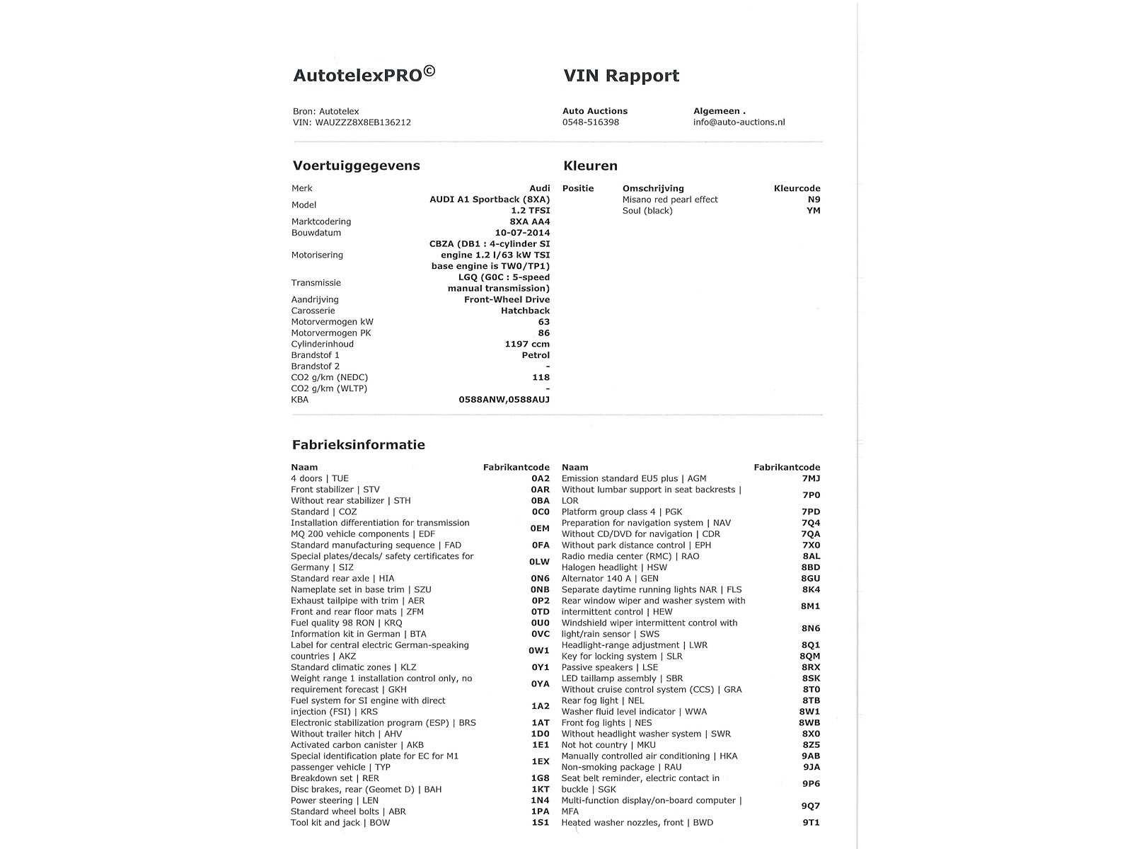 Voor vragen kunt u mailen naar info@auto-auctions.nl Nee Kenteken: Duitse Kenteken Papieren Merk: Audi Model: A1 Sportback Type: 1.2 TFSI S-line Afgelezen kilometerstand: 96477km Cilinderinhoud: 1197cc Vermogen (kW): 63kW Brandstof: Benzine Chassisnummer: WAUZZZ8X8EB136212 Datum eerste toelating: 29-07-2014 APK vervaldatum: 6-2027 Vermogen (pk): 86hp Aantal zitplaatsen: 5 Kleur: Rood Transmissie: Handgeschakeld Aantal deuren: 5 Aantal sleutels: 2 Aantal cilinders: 4 Carrosserie: Hatchback Nationaliteit documenten: Duitse Kenteken Papieren Onderhoudshistorie: Volledig Aanwezig Start en rijdt: Ja