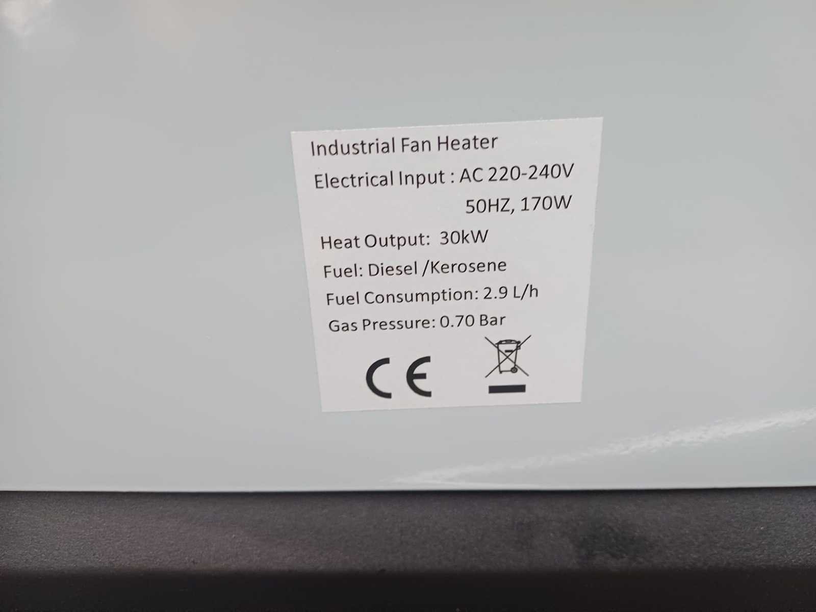 Model: LXC30 Voeding: 230V/50Hz wisselstroom Vermogen: 30 kW (105.000 BTU/h of 25.800 kcal/h) Luchtstroom: 750 m³/h Brandstoftank: 18 liter Brandstof: Diesel of lichte brandolie Brandstofverbruik: 2,9 liter per uur Motorvermogen: 170 Watt Brandstofpompdruk: 0,7 bar Bedrijfsduur: 6,2 uur Gewicht: 18,5 kg Afmetingen: 850 x 420 x 480 mm No