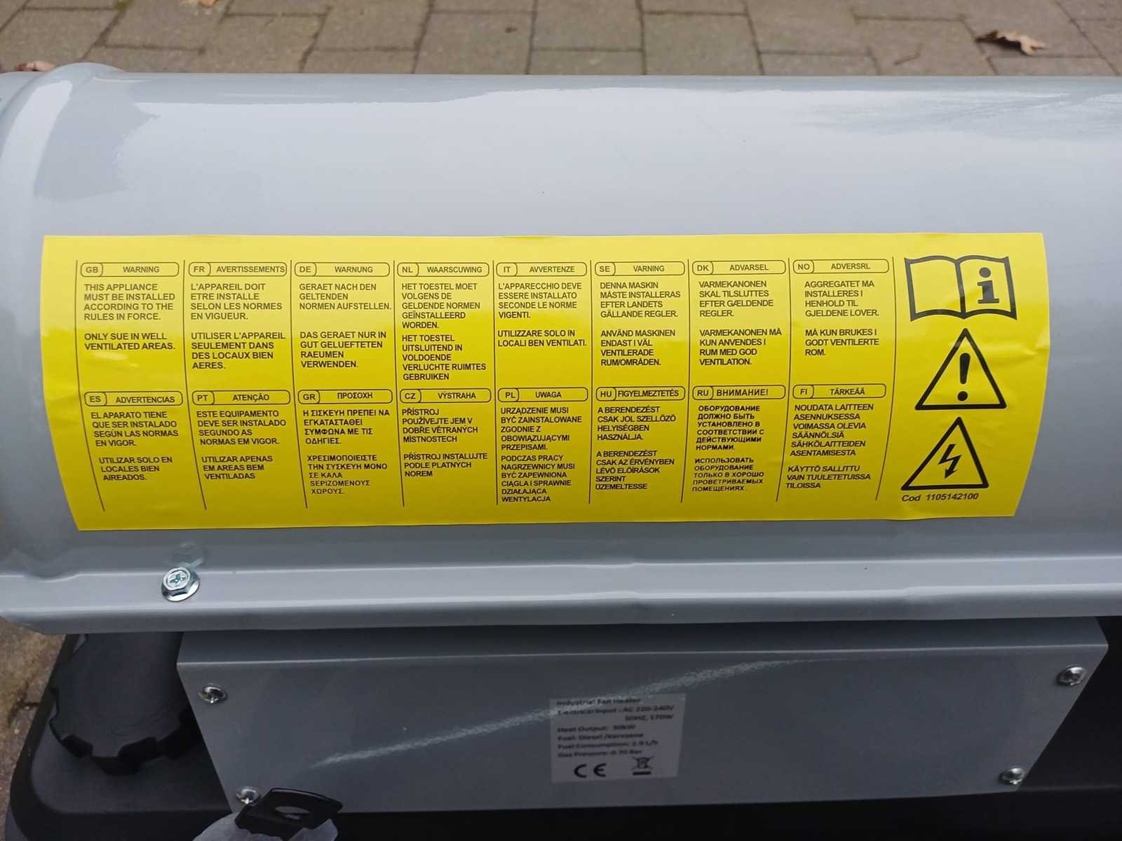 Model: LXC30 Voeding: 230V/50Hz wisselstroom Vermogen: 30 kW (105.000 BTU/h of 25.800 kcal/h) Luchtstroom: 750 m³/h Brandstoftank: 18 liter Brandstof: Diesel of lichte brandolie Brandstofverbruik: 2,9 liter per uur Motorvermogen: 170 Watt Brandstofpompdruk: 0,7 bar Bedrijfsduur: 6,2 uur Gewicht: 18,5 kg Afmetingen: 850 x 420 x 480 mm No