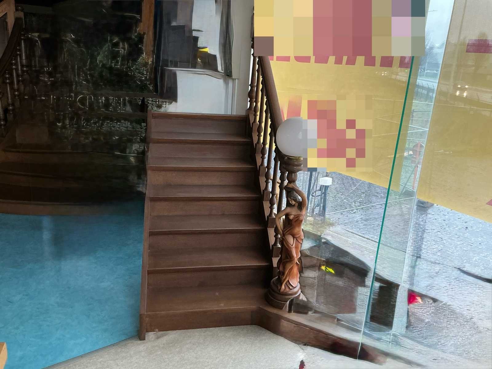 Nieuwe volle eiken trap met 7 treden en gesculpteerde leuning. Verkoop toonzaal model wegens stopzetting bedrijf. No Merk: Houten trap eigen handwerk
