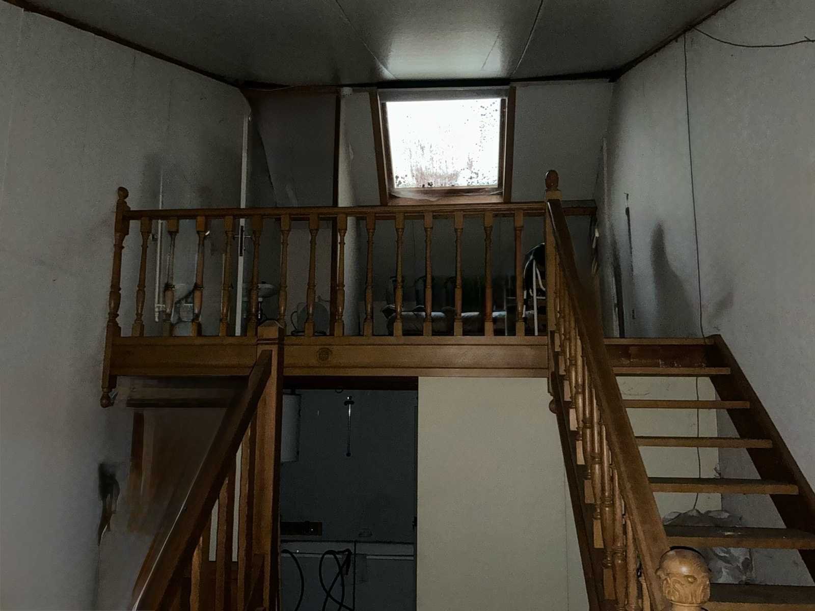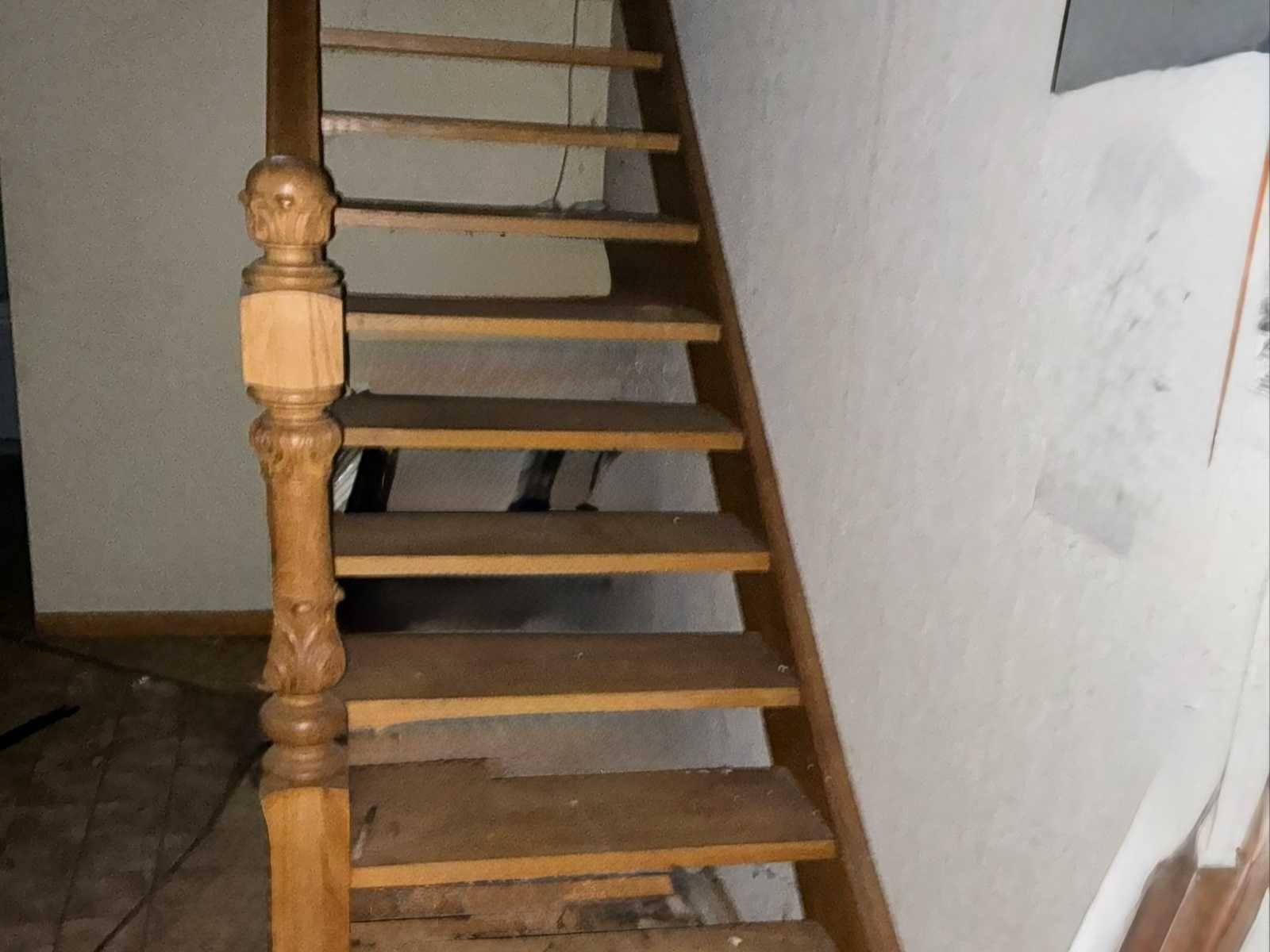 Volle eiken trap met 13 treden en leuning, verkoop wegens overlijden en stopzetting bedrijf. No Merk: Handwerk Type: Vol eiken trap