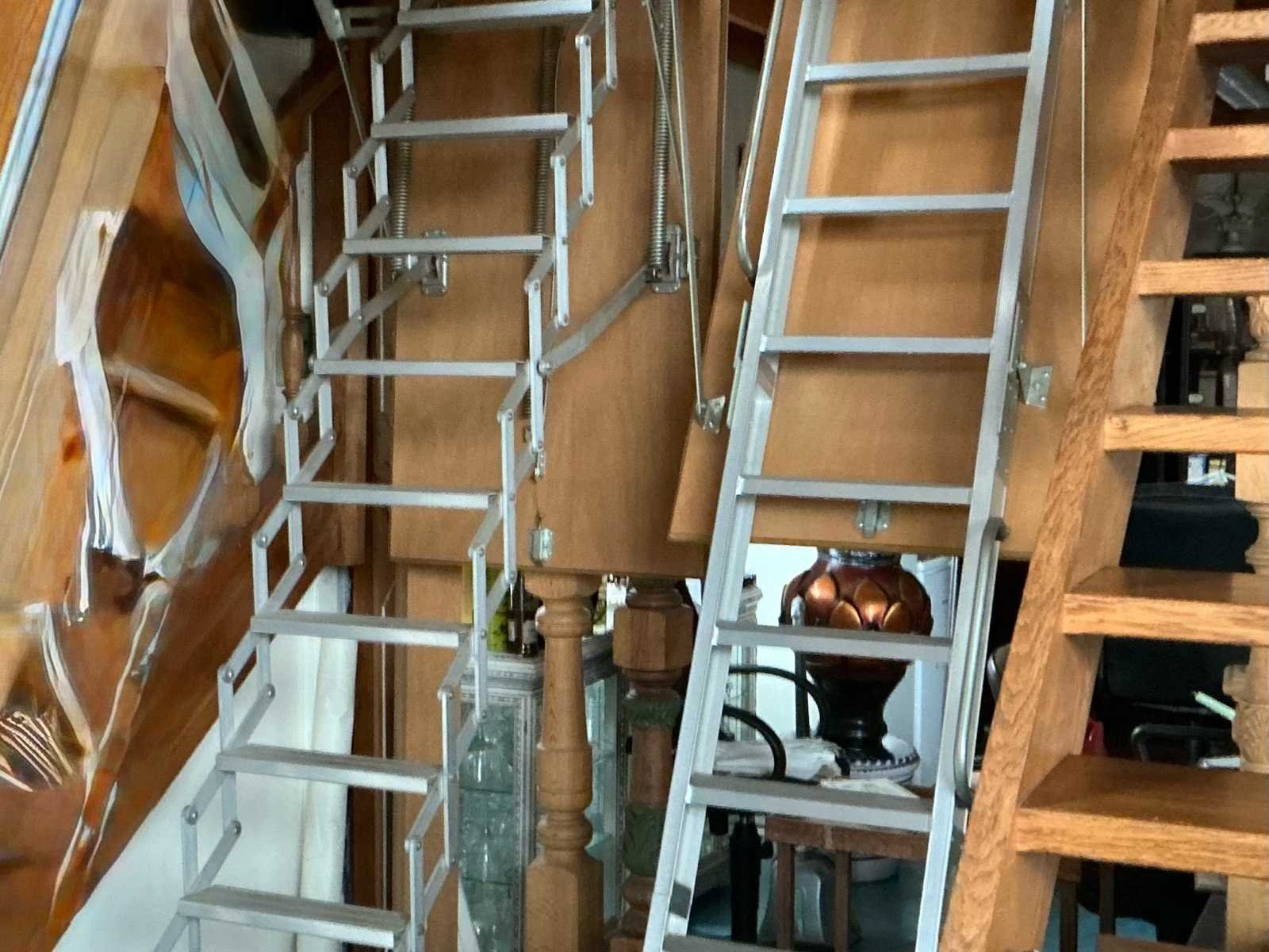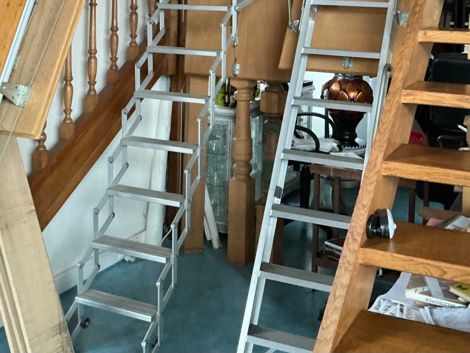 Nieuwe aluminium (toonzaal modellen) inklapbare zoldertrappen, verkoop wegens overlijden en stopzetting bedrijf. No Bestaande uit: 2 inklapbare aluminium zoldertrappen 1e: Accordeon systeem 2e: Rechte treden opstap