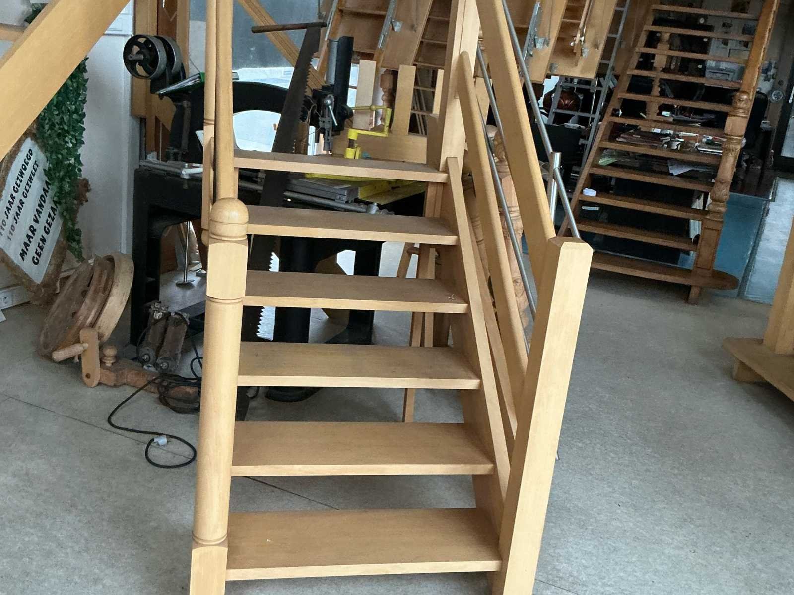 Nieuwe showroom 6 treden trap in beuk met leuning. Verkoop wegens overlijden en stopzetting bedrijf. No Merk: Nieuwe Beuken 6 tredige trap
