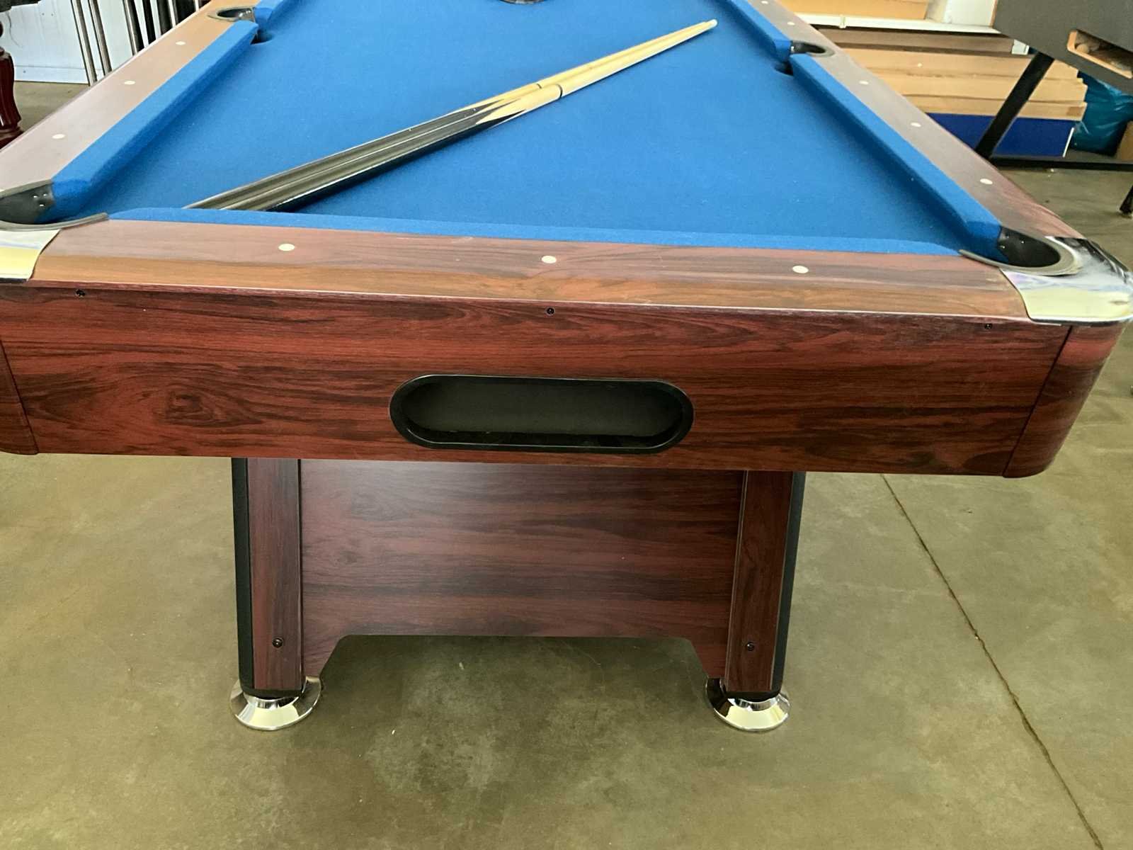 Metalen chrome regelpoten. deze zijn demonteerbaar. hoeken bovenaan afgewerkt met chroomaccenten. meubel is donkerbruin mahonie generfd met blauw laken. Ballencollector: ja, automatisch systeem. afmetingen verpakking 2180x1270x235. ongebruikt. geleverd in verpakking en makkelijk te monteren Nee Gewicht: 105
