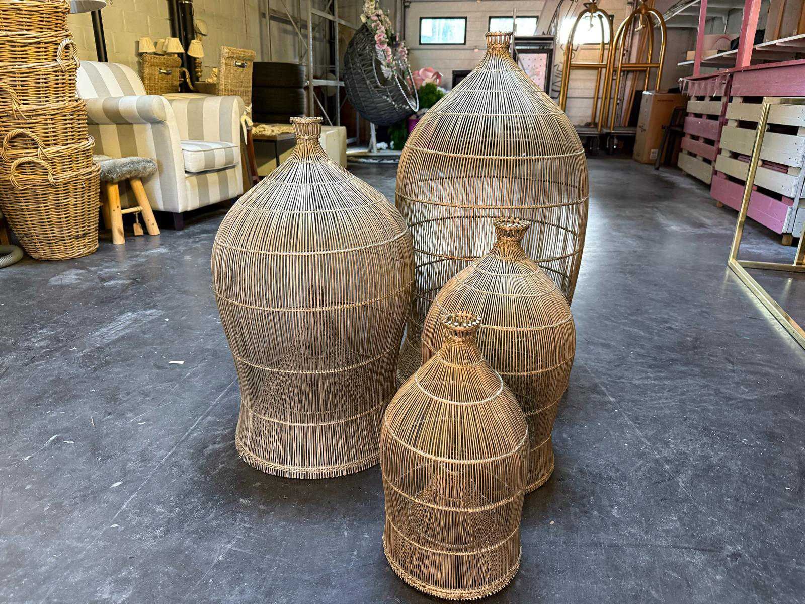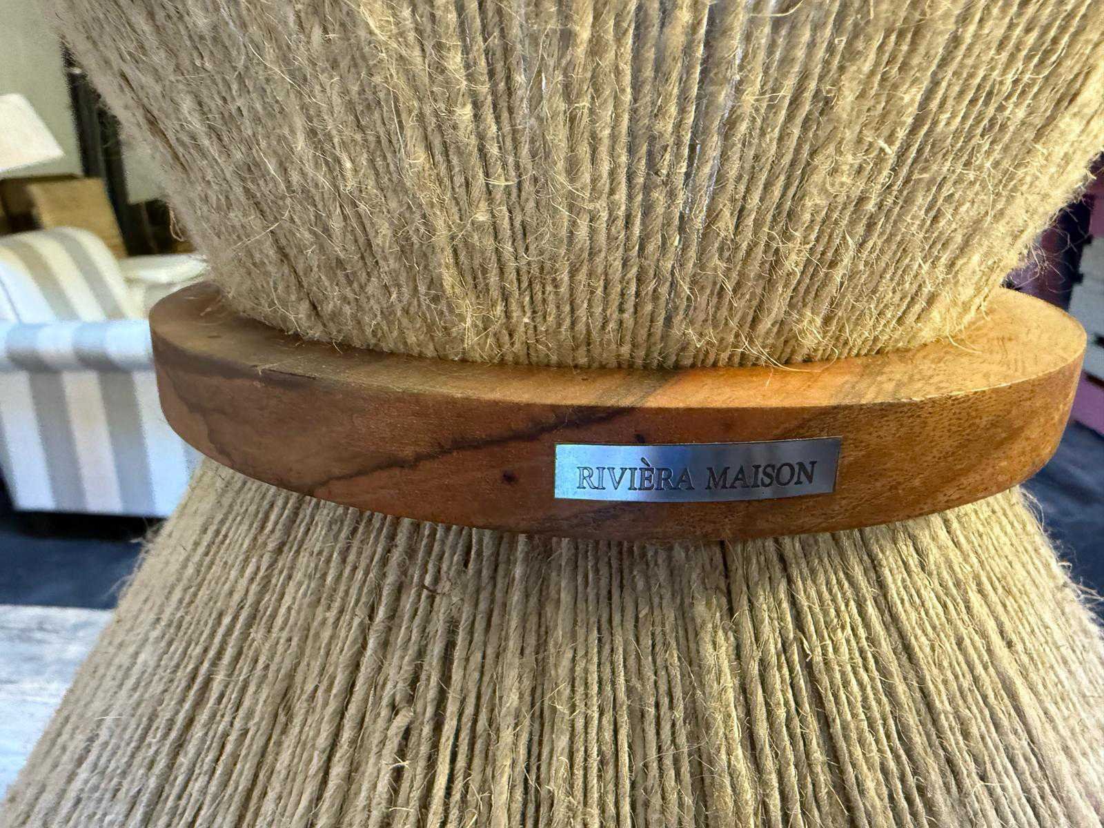 Diverse meubelen en verlichting: Commode Riviera Maison 180x50x80, 2 barkrukken Riviera Maison, Pendels 4 stuks van groot naar klein, luster Riviera Maison met touw, Staanlamp Judeco inclusief kap, Tafellamp Judeco, Tafellamp 5kapjes(Pieter Porters), bijzettafel, salontafel 120x60x40, bijzetstoeltjes, 6x rieten mandje, douchewand 100x200, wastafel en kraan Grohe Nee Merk: Riviera Maison