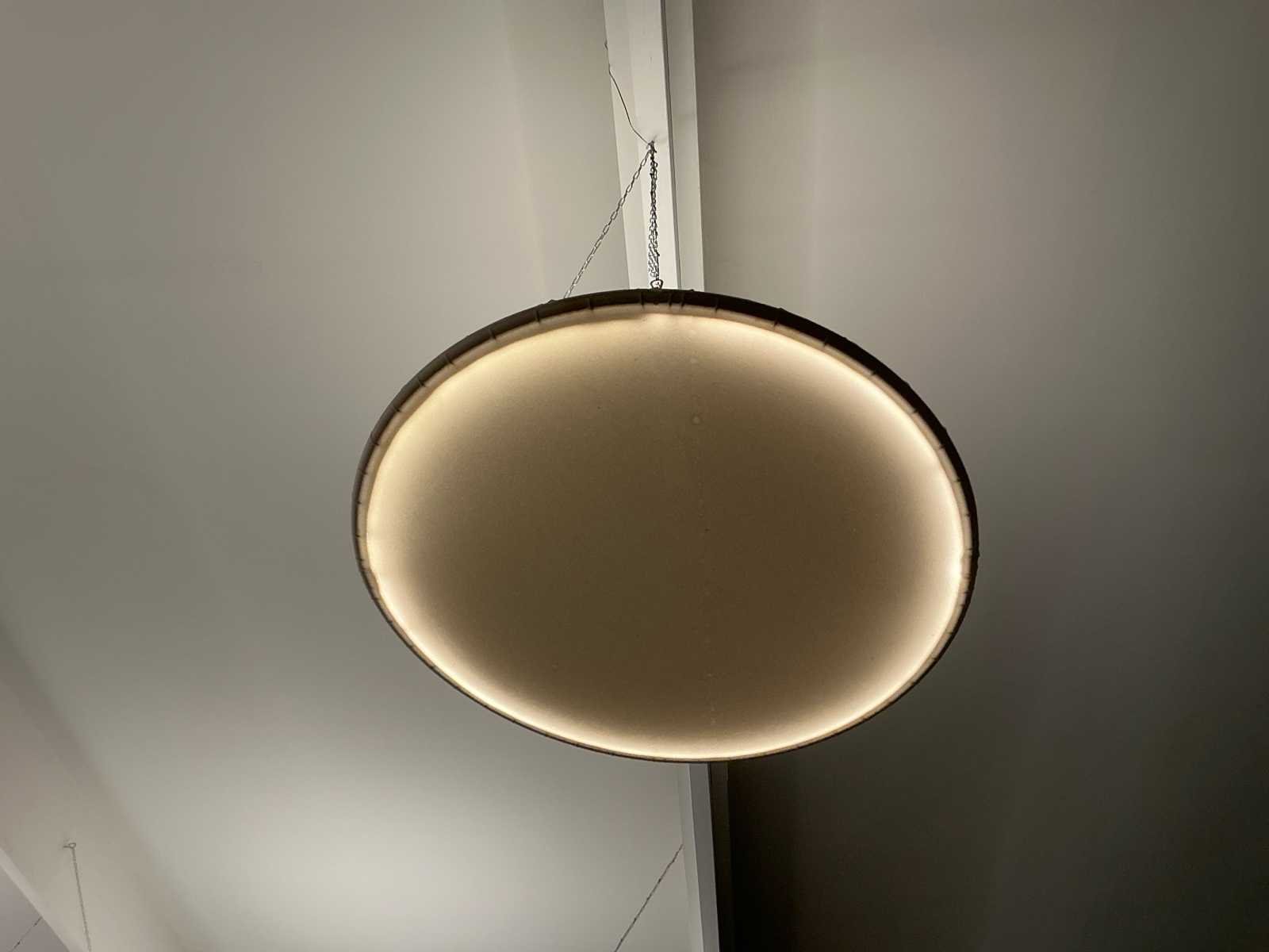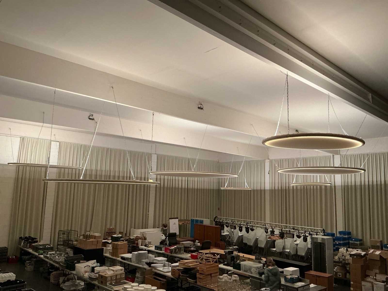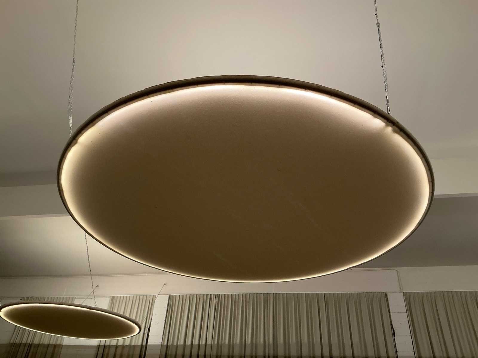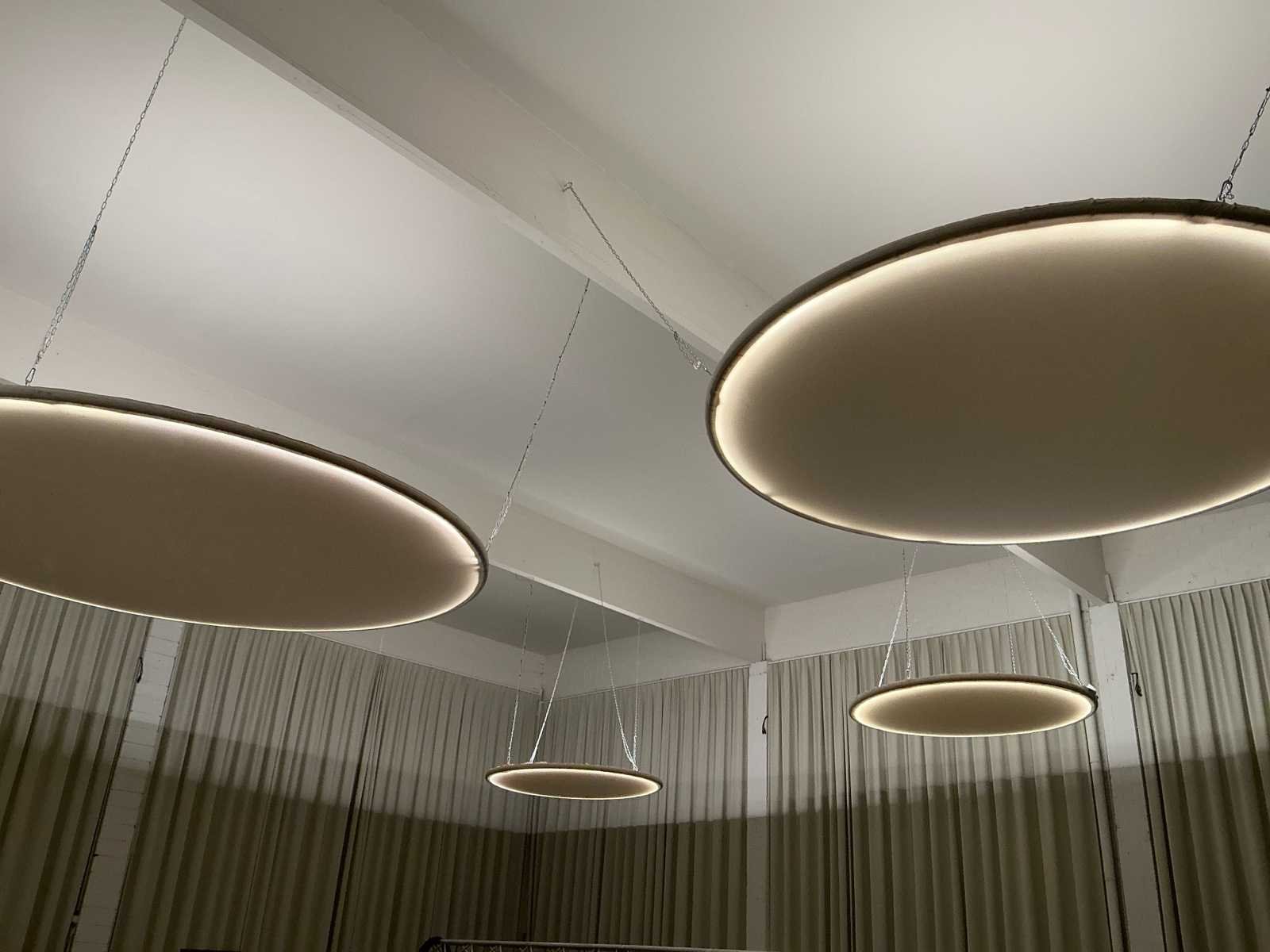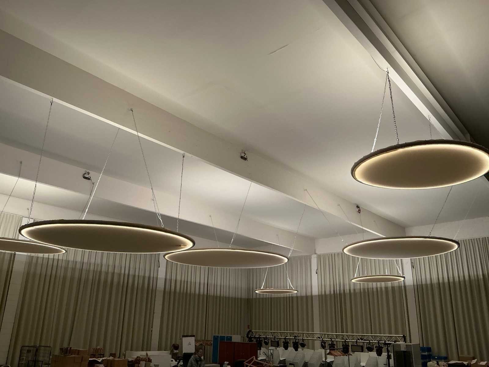 Set van 7 grote koepels met verlichting. Stoffen bekleding met LED verlichting. Wordt gedemonteerd. 3 kleine 200cm, 3 medium 300cm en 1 grote 400cm. Met ophang kettingen. No