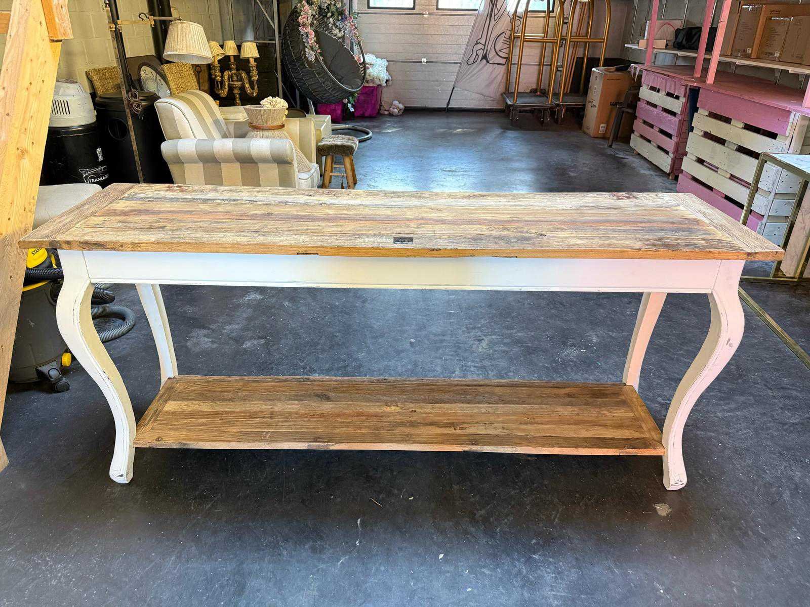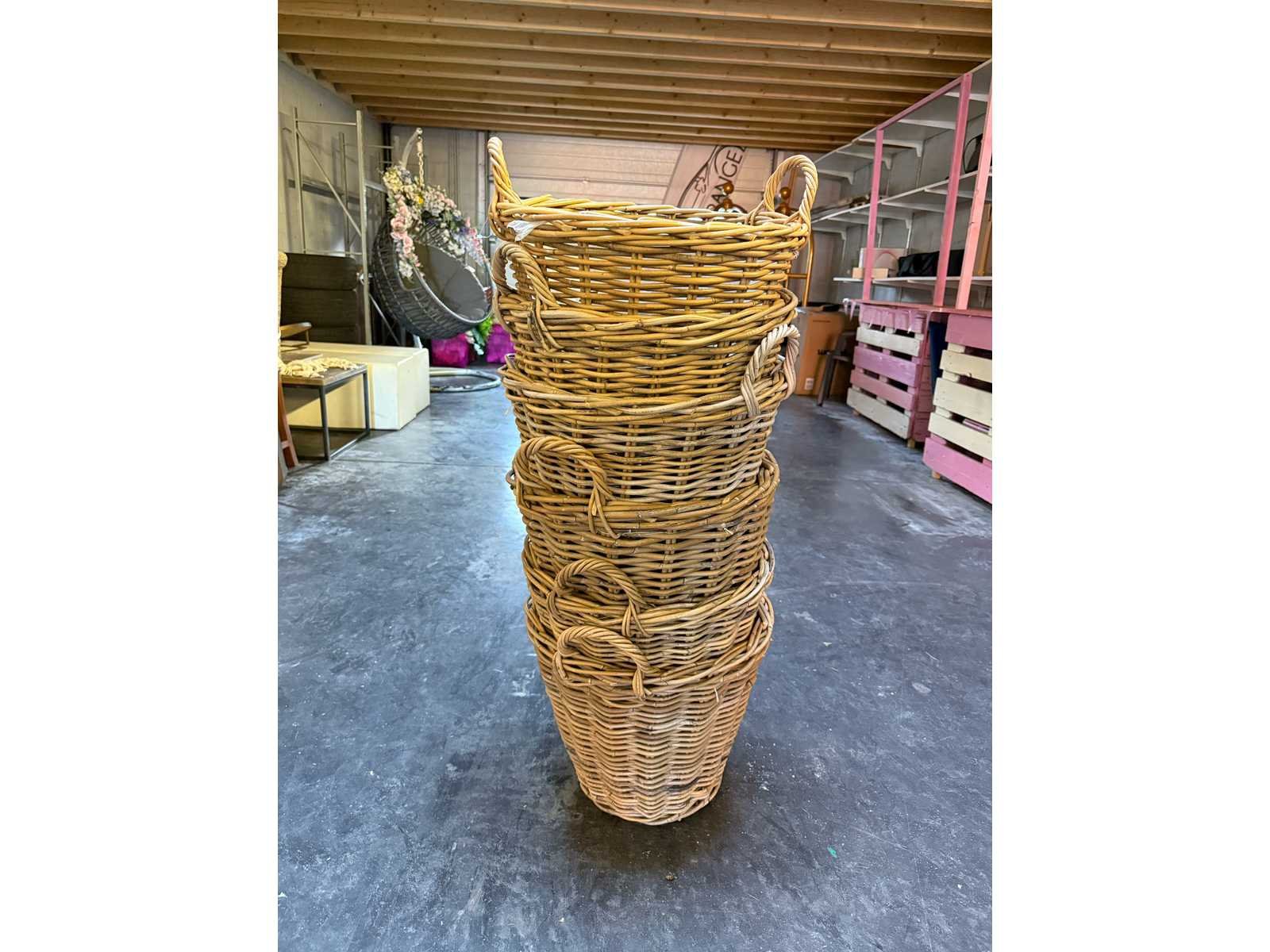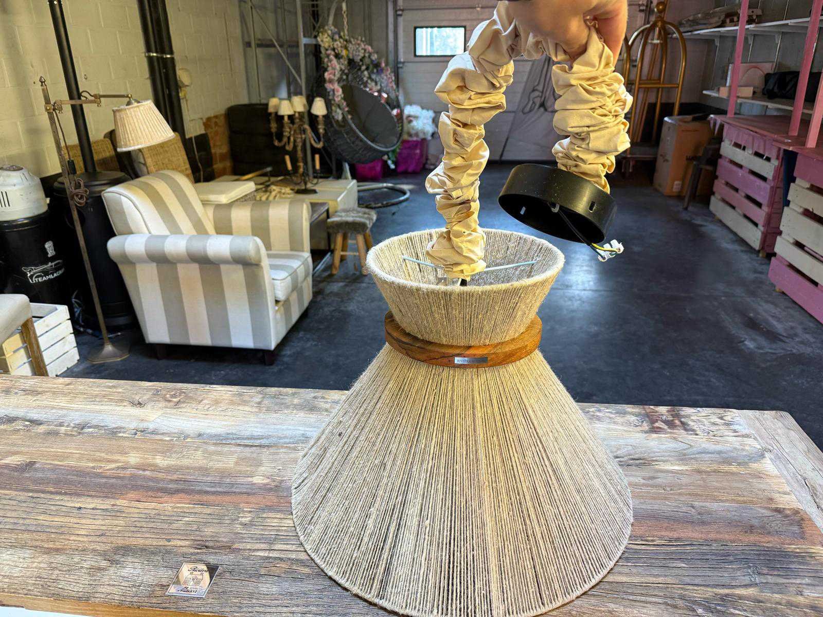 Diverse meubelen en verlichting: Commode Riviera Maison 180x50x80, 2 barkrukken Riviera Maison, Pendels 4 stuks van groot naar klein, luster Riviera Maison met touw, Staanlamp Judeco inclusief kap, Tafellamp Judeco, Tafellamp 5kapjes(Pieter Porters), bijzettafel, salontafel 120x60x40, bijzetstoeltjes, 6x rieten mandje, douchewand 100x200, wastafel en kraan Grohe Nee