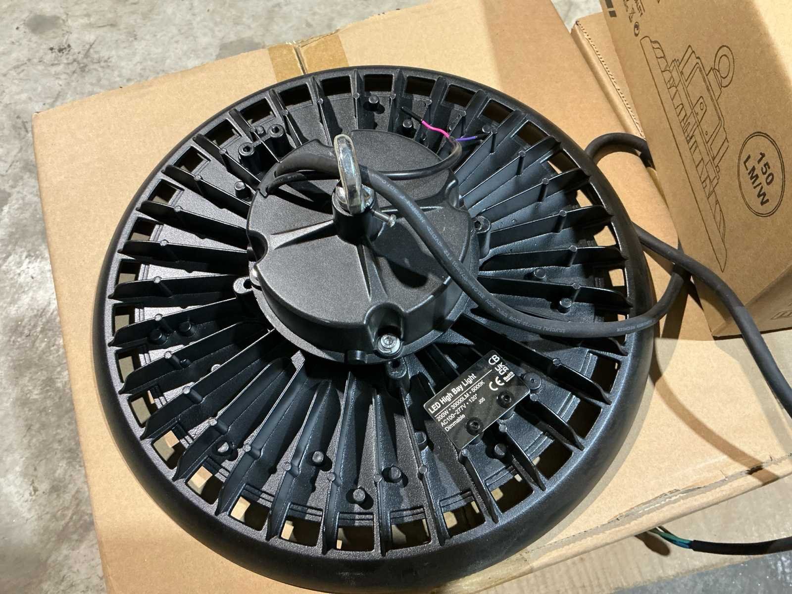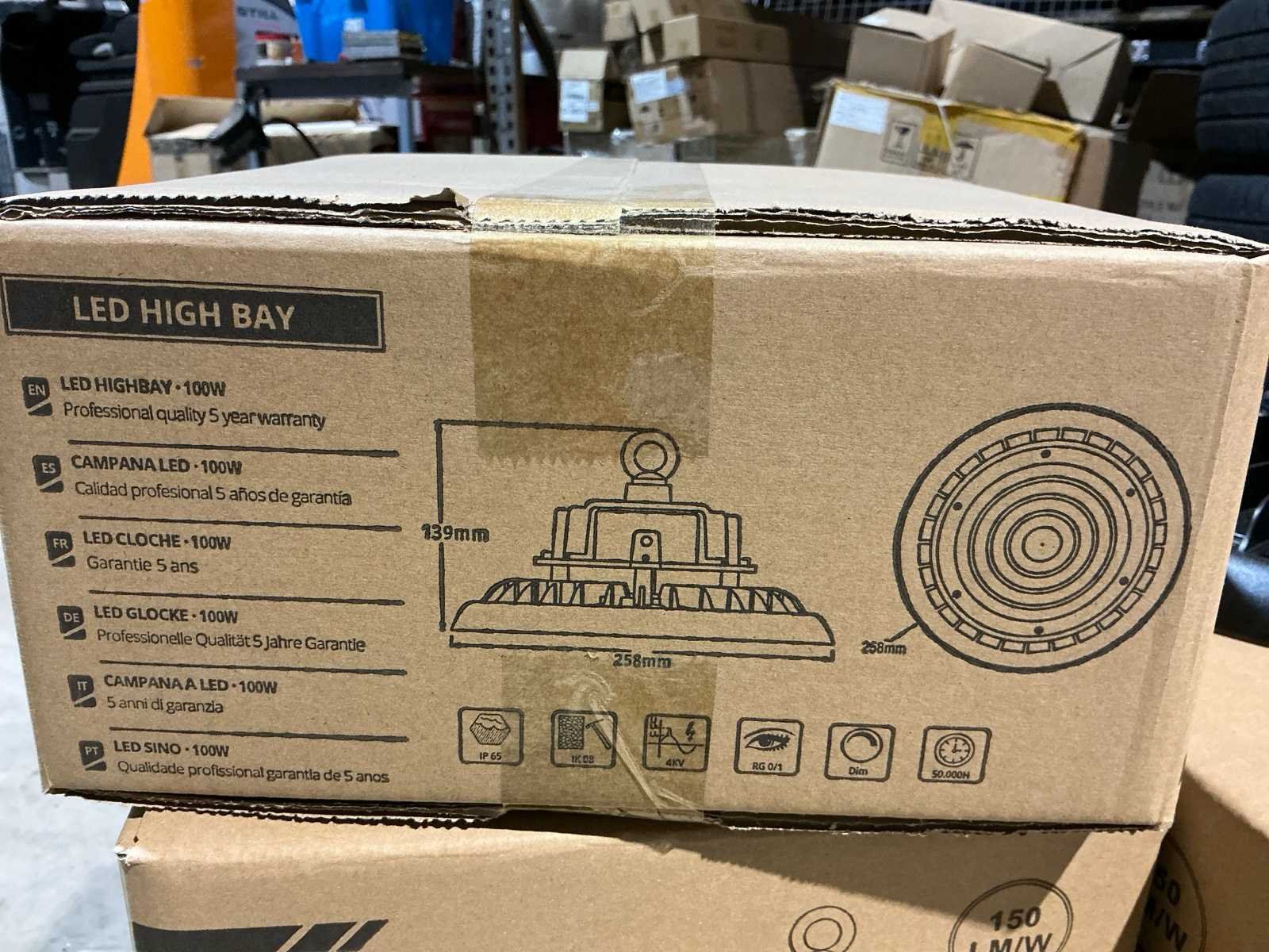 Dit lot bestaande uit 4 stuks led high bay lampen 2 stuks van 100w 258mm en 2 stuks van 200w 347mm. No