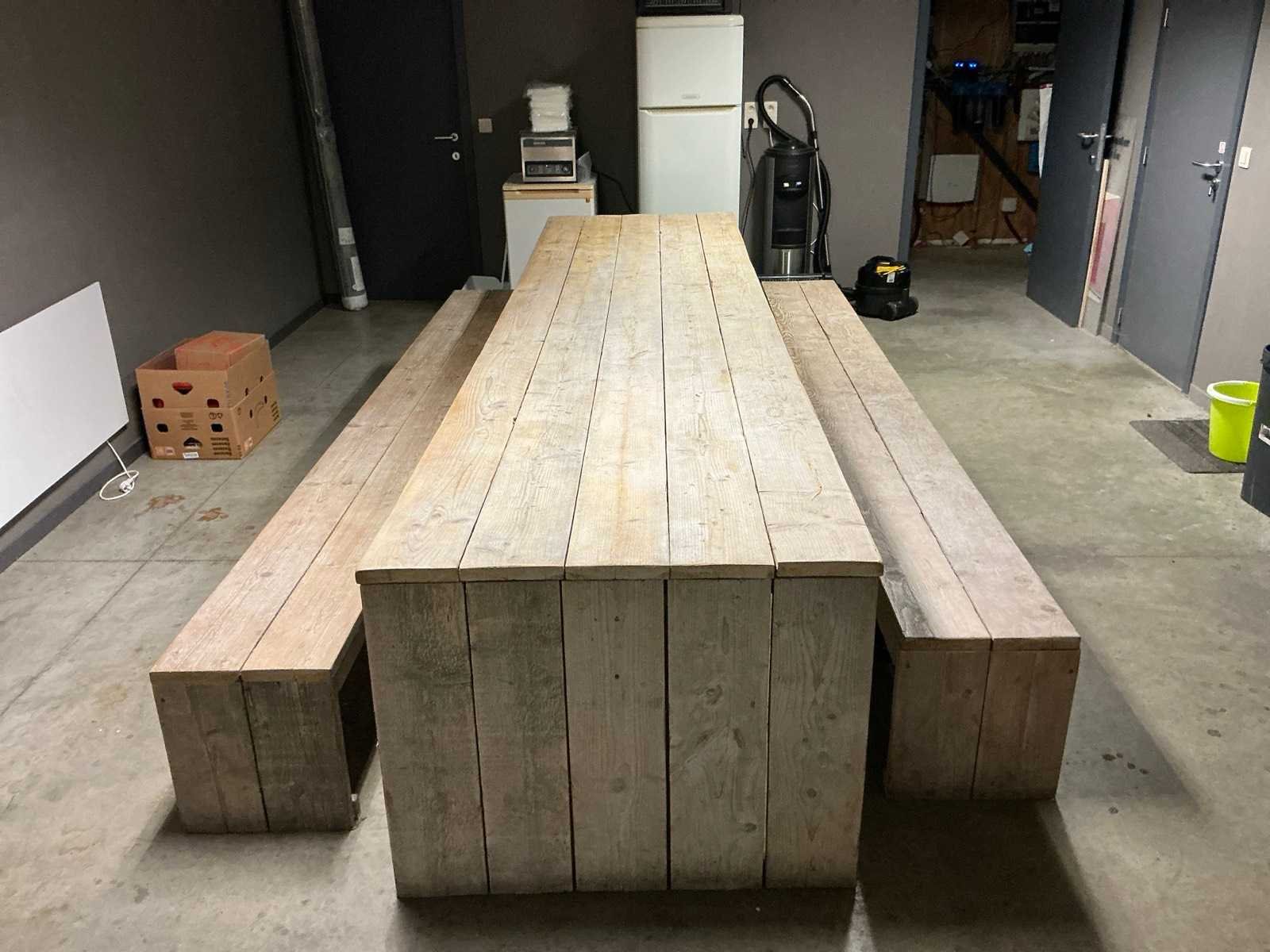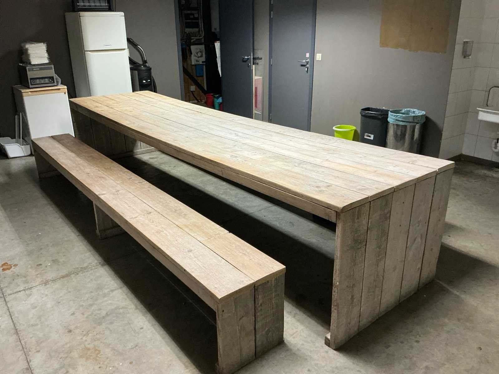 Volhouten tafel met banken Geïmpregneerd White wash finish Nee Merk: Volhout Vorm: Rechtoekig Stoelen: 2 Kleur: Hout Lengte: 400cm Breedte: 100cm Hoogte: 78cm Materiaal: Steigerhout