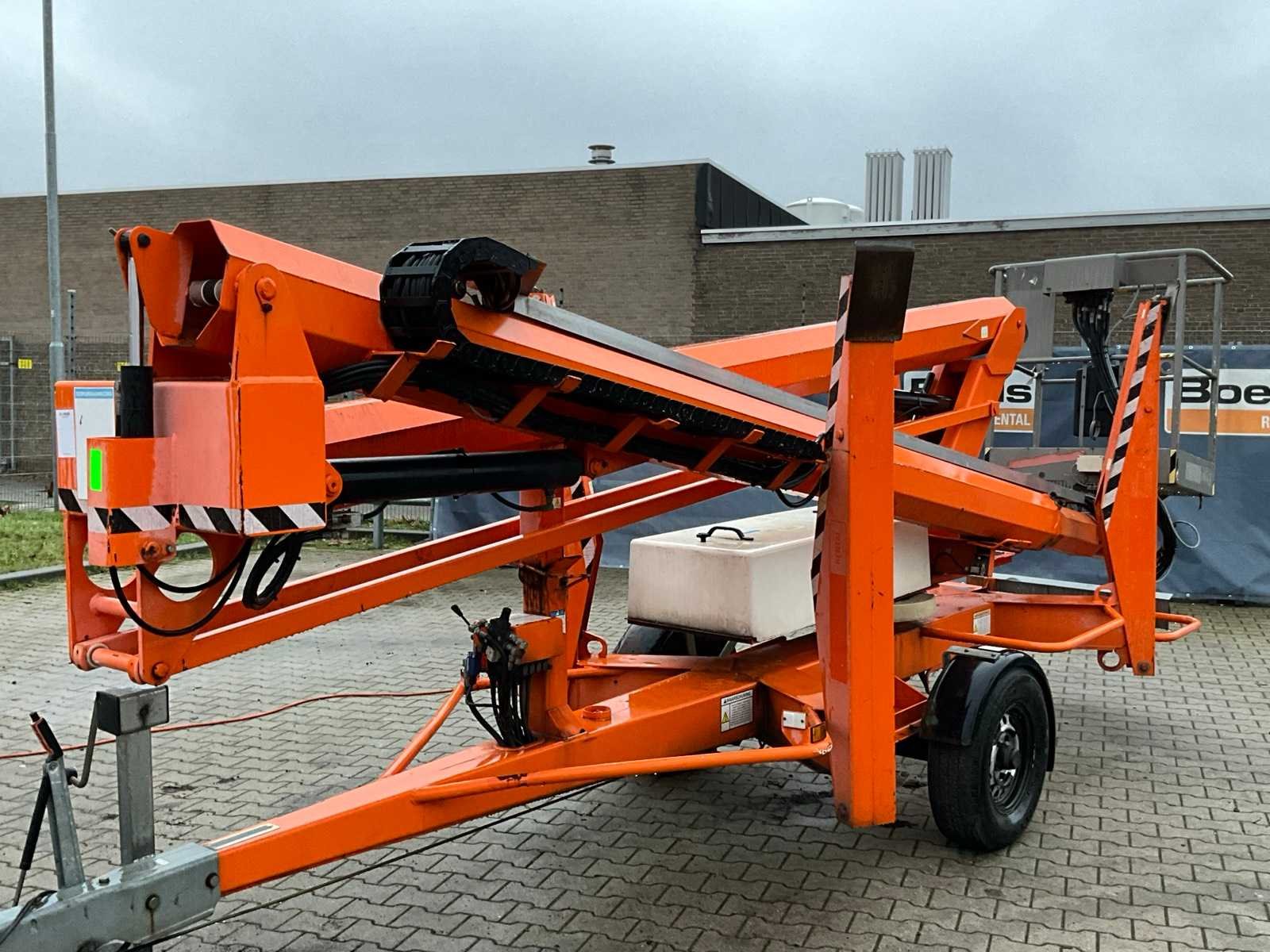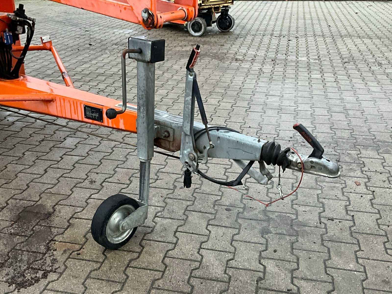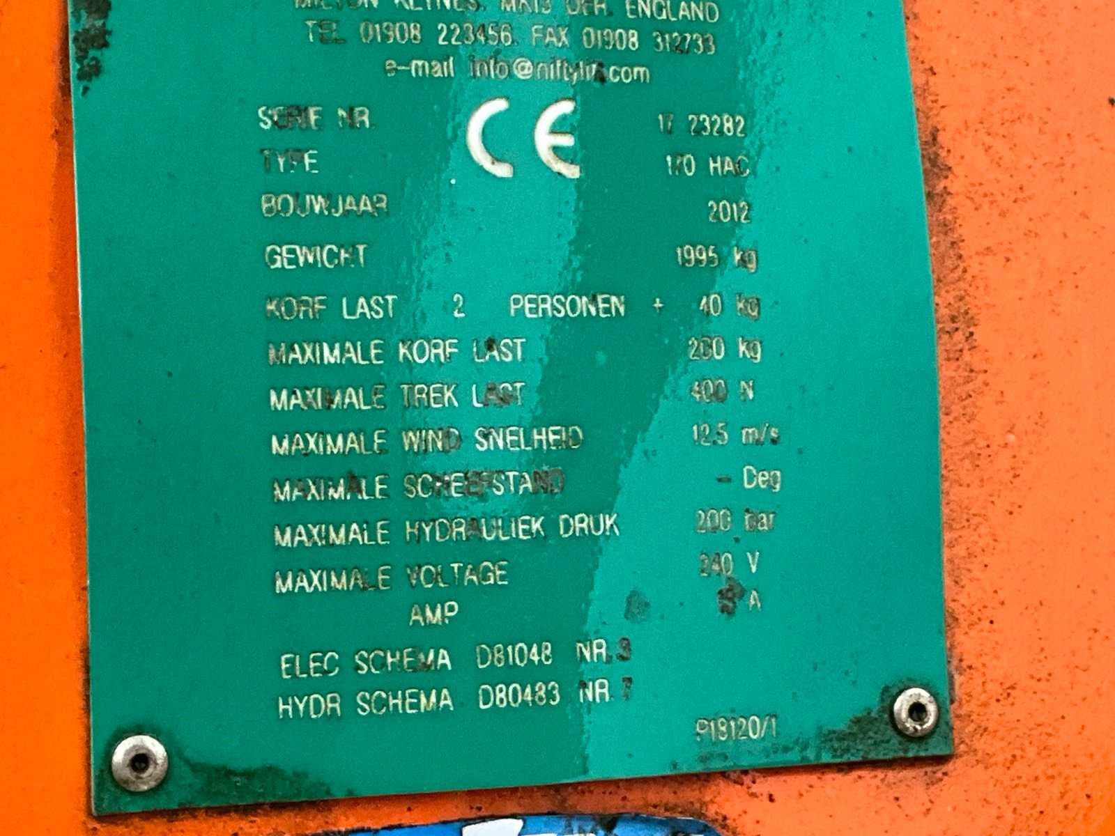 Knik telescoop aanhangwagen hoogwerker; enkel assige aanhangwagen; 230 Volt elektrische bediening; kooibediening; platform vloerhoogte 15100 mm; zonder uurregistratie aflezing; 4x hydraulische neerklapbare stempelvoet; afstempelvlak 4400x4400 mm; oplooprem; neuswiel; chassisnummer SLN170HACCM023282; working condition; (de koper dient bij transport over de weg zelf te voorzien in een geldig kenteken; een 7 of 9 polige aansluitstekker of verloopstuk met kabel (verlengsnoer kan ter plaatse tegen betaling aangekocht worden); eventueel extra lichtbalk; Belgische kentekenpapieren; gelijkvormigheidsattest; (1-QDB-163) Nee Merk: Niftylift Type: Nifty 170 HAC Bouwjaar: 2012 Serienummer: 17-23282 Elektrisch: true Telescoop hoogwerker: true Knikarm hoogwerker: true Werkhoogte: 17100mm Horizontale rijkwijdte: 8700mm Plateau afm. l: 900mm Plateau afm. b: 600mm Platform capaciteit: 200kg Eigen gewicht: 2000kg Totale afmeting L: 6200mm Totale afmeting Breedte: 1650mm Totale afmeting Hoogte: 2150mm