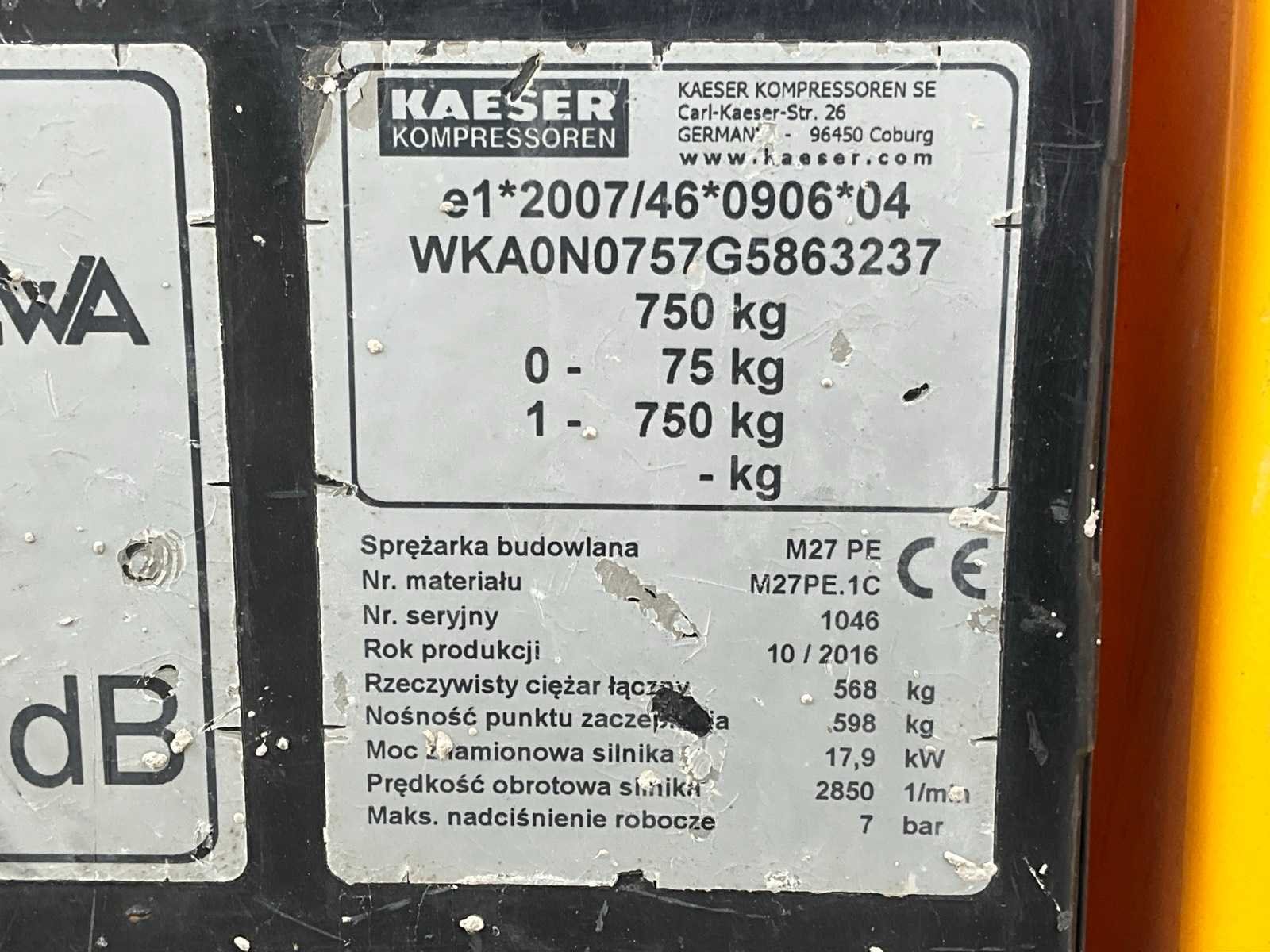 Lengte 3200 mm; breedte 1350 mm; hoogte 1350 mm; afgelezen urenstand 770 uren; Kubota 3 cilinder dieselmotor; opklapbare trekboom; neussteun; working condition; (de koper dient bij transport over de weg zelf te voorzien in een geldig kenteken; een 7 of 9 polige aansluitstekker of verloopstuk met kabel (verlengsnoer kan ter plaatse tegen betaling aangekocht worden); eventueel extra lichtbalk); buitenlandse kentekenpapieren; zonder gelijkvormigheidsattest; (WN-727-AL) Nee Merk: Kaeser Type: M27 PE Bouwjaar: 2016 Chassisnummer: WKA0N0757G5863237 Aantal assen: 1