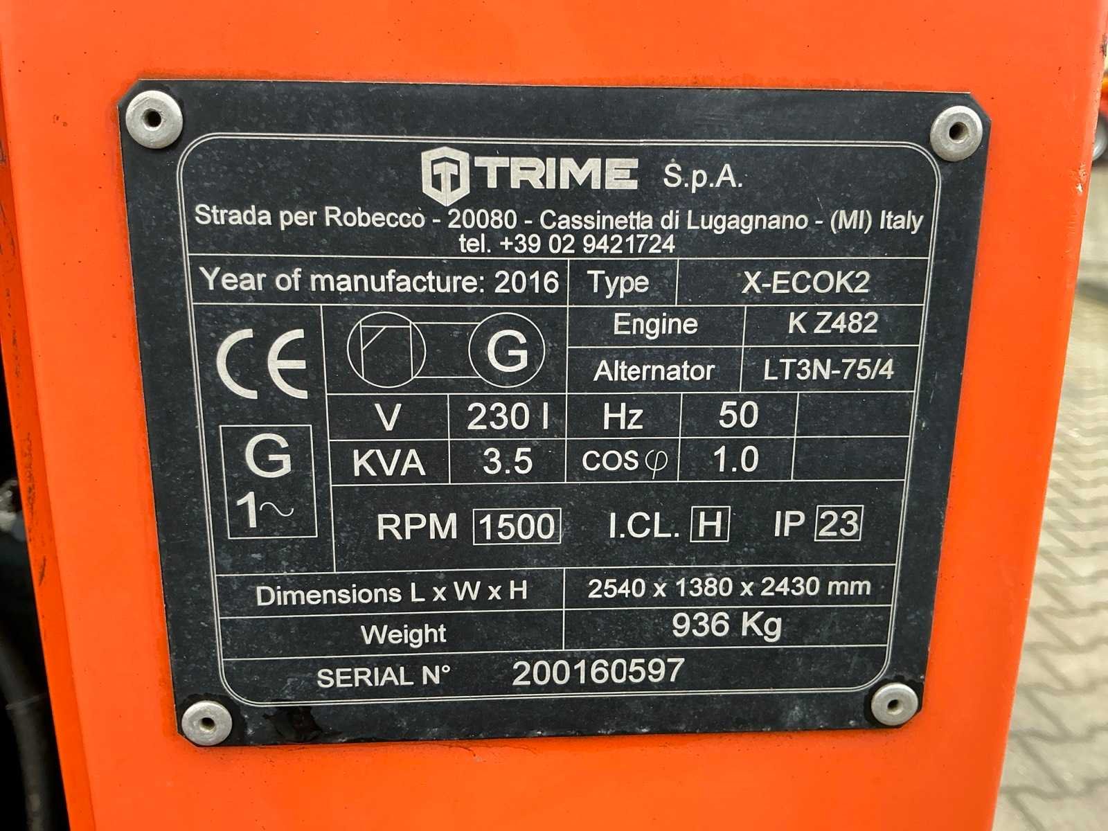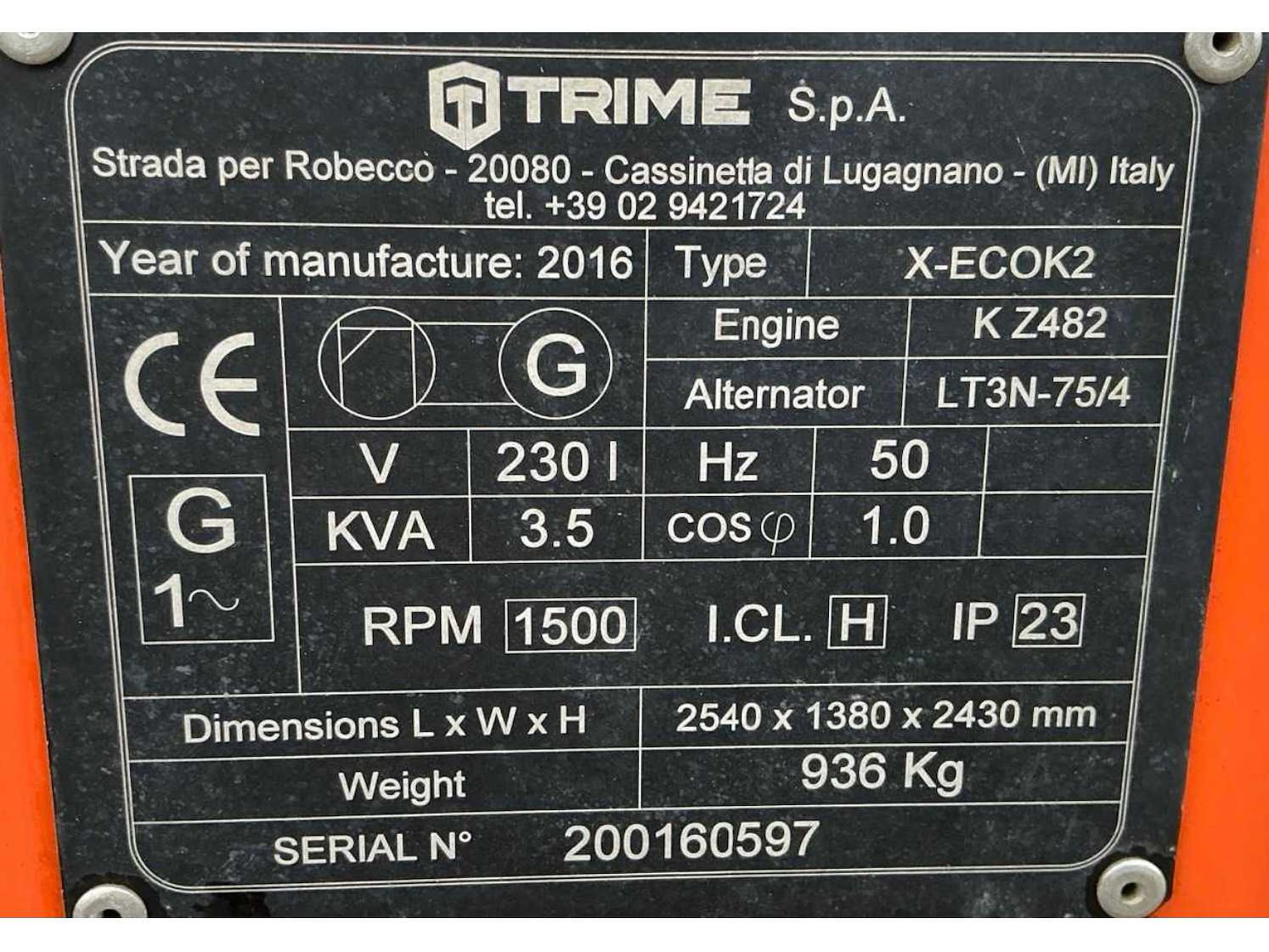 Kubota diesel motor; Alumen alternator; 6x LED; 230 Volt; 3,5 kVA; brandstoftank 110 liter; 2545 draaiuren; hydraulische mast; maximale masthoogte circa 8,5 meter; 2x stelvoet; hijsoog; working condition; (de koper dient bij transport over de weg zelf te voorzien in een geldig kenteken; een 7 of 9 polige aansluitstekker of verloopstuk met kabel (verlengsnoer kan ter plaatse tegen betaling aangekocht worden); eventueel extra lichtbalk; Nederlandse kentekenpapieren; zonder gelijkvormigheidsattest; Nee Merk: Trime Type: X-ECOK2 Bouwjaar: 2016 Chassisnummer: ZPGXE110C16000595 Aantal assen: 1 Ledig gewicht: 936kg Laadvermogen: 164kg Datum eerste toelating: 2016-10-31 Datum eerste toelating (NL): 2016-10-31 Kenteken: 38-WP-NT Hoogte: 235cm Lengte: 255cm Breedte: 184cm