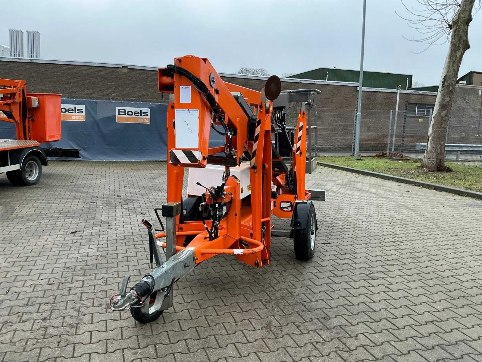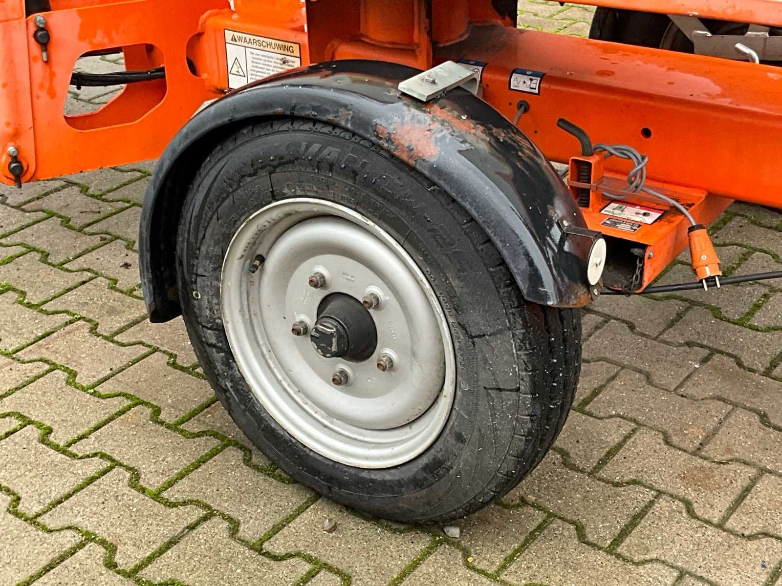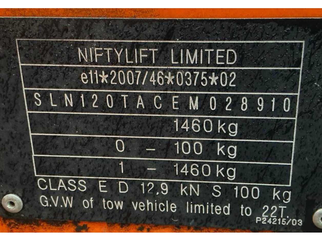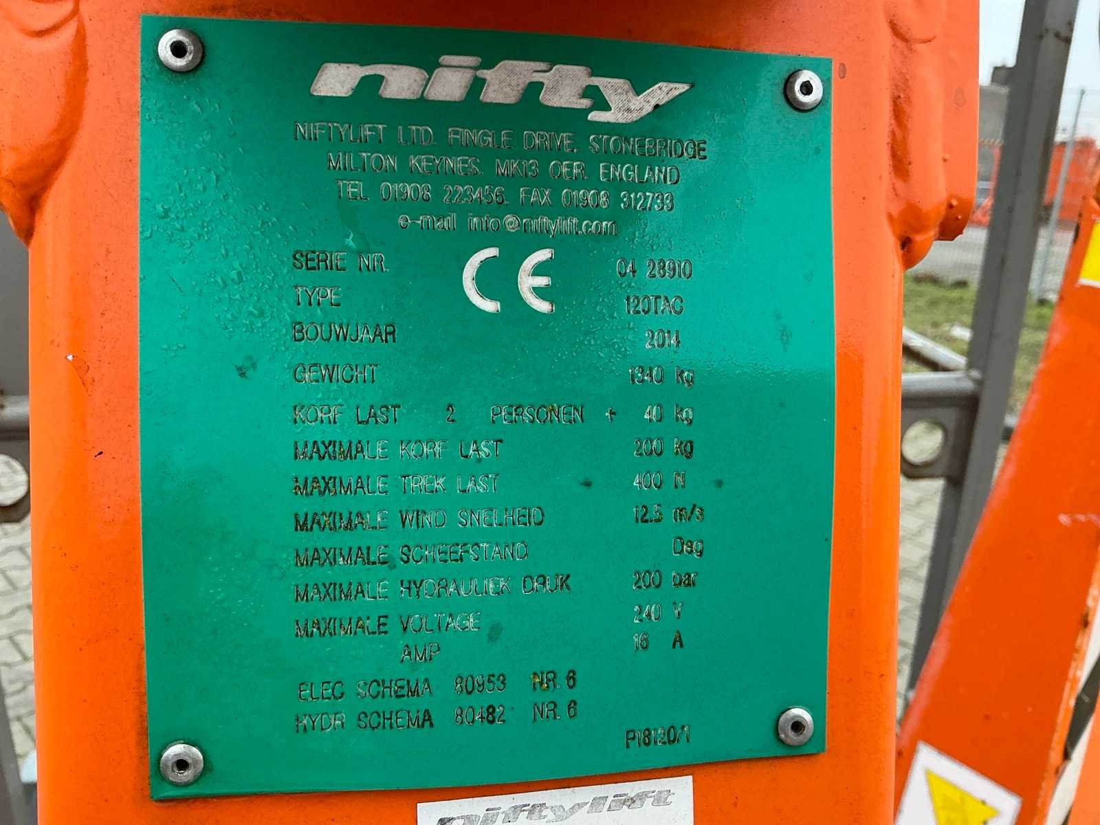 Knik telescoop hoogwerker aanhangwagen; enkel assige aanhangwagen; wielas in breedte verstelbaar; platform vloerhoogte 10200 mm; 230 Volt elektrische bediening; kooibediening; 4x hydraulische neerklapbare stempelvoet; afstempelvlak 3550x3550 mm; oplooprem; neuswiel; chassisnummer SLN120TACEM028910; working condition; (de koper dient bij transport over de weg zelf te voorzien in een geldig kenteken; een 7 of 9 polige aansluitstekker of verloopstuk met kabel (verlengsnoer kan ter plaatse tegen betaling aangekocht worden); eventueel extra lichtbalk); Belgische kentekenpapieren; gelijkvormigheidsattest; (1-QFE-687) Nee Merk: Niftylift Type: Nifty 120 TAC Bouwjaar: 2014 Elektrisch: true Telescoop hoogwerker: true Knikarm hoogwerker: true Werkhoogte: 12200mm Horizontale rijkwijdte: 5000mm Plateau afm. l: 900mm Plateau afm. b: 600mm Platform capaciteit: 200kg Eigen gewicht: 1400kg Totale afmeting L: 4500mm Totale afmeting Breedte: 1500mm Totale afmeting Hoogte: 1900mm
