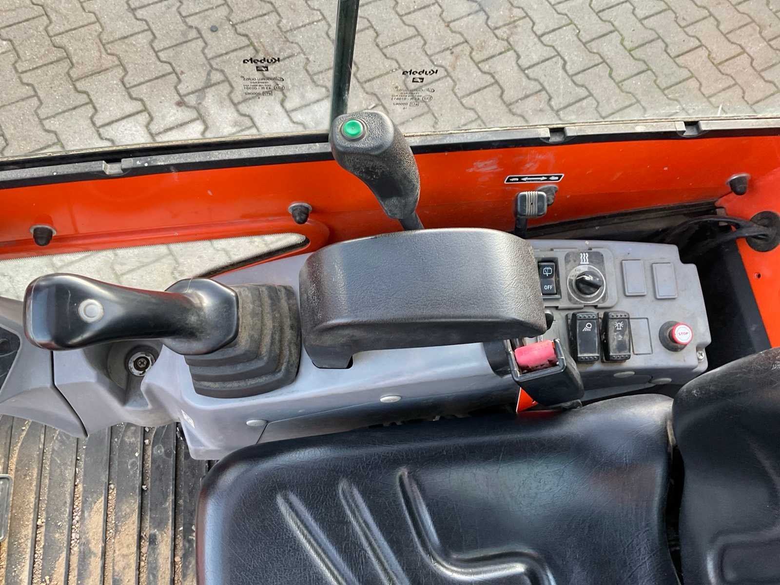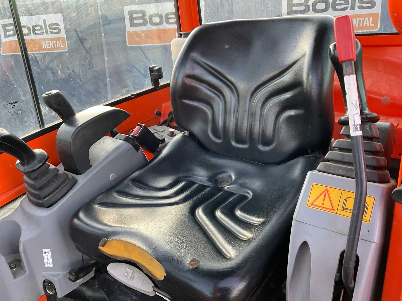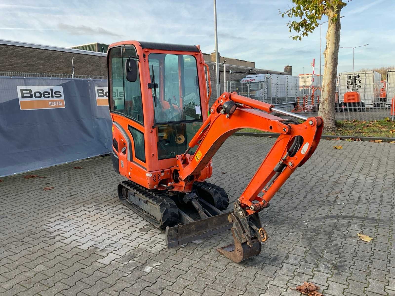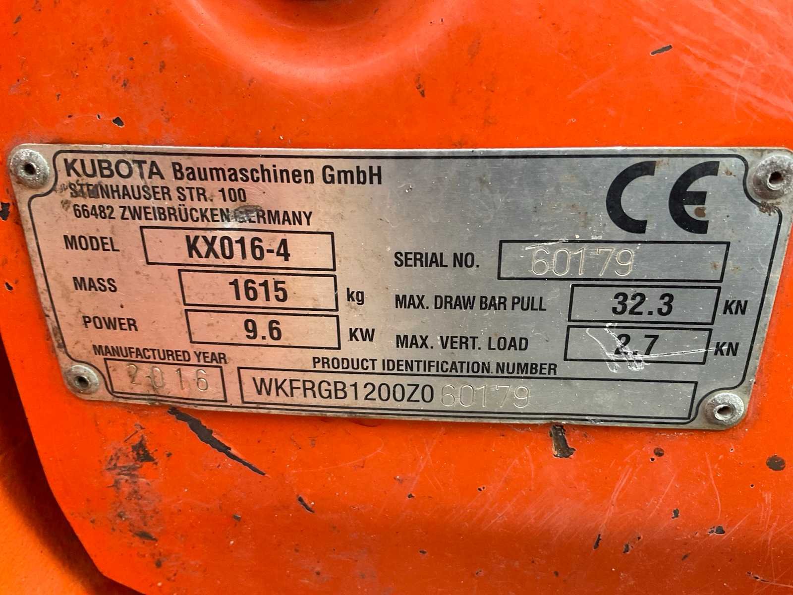 Gesloten cabine; rubber rupsbanden; rupsen hydraulisch in breedte verstelbaar 990 - 1240 mm; maximale uitstorthoogte 2250 mm; extra hydraulische functie; snelwissel; dozerblad breedte 1230 mm inclusief verlengstuk; working condition; Nee Merk: Kubota Type: KX016-4G Bouwjaar: 2016 Serienummer: WKFRGB1200Z060179 Merk motor: Kubota Motorvermogen (kW): 9.6kW Aantal cilinders: 3 Brandstof: Diesel Max. werkbereik: 3730mm Max. graafdiepte: 2250mm Inclusief graafbak: Yes Graafbak afm. l: 400mm Graafbak afm. b: 220mm Graafbak afm. h: 400mm Rups breedte: 230mm Afgelezen urenstand: 1924 Eigen gewicht: 1625kg Totale afmeting L: 3750mm Totale afmeting Breedte: 1250mm Totale afmeting Hoogte: 2350mm