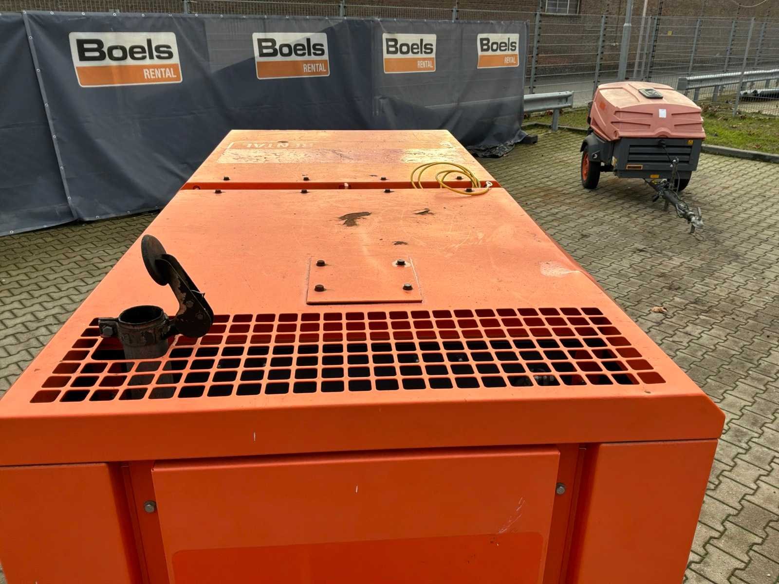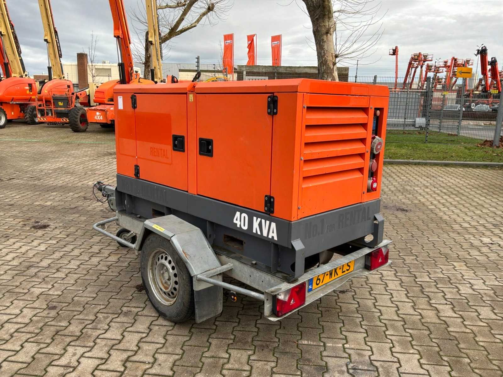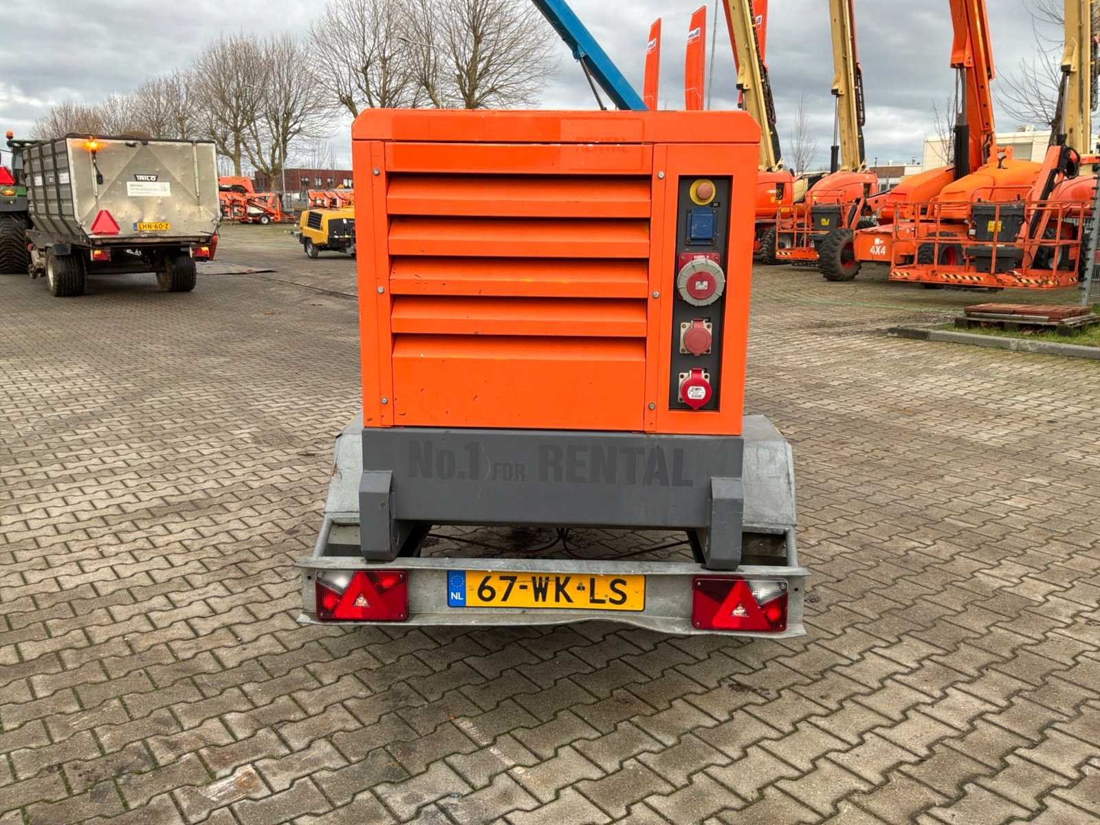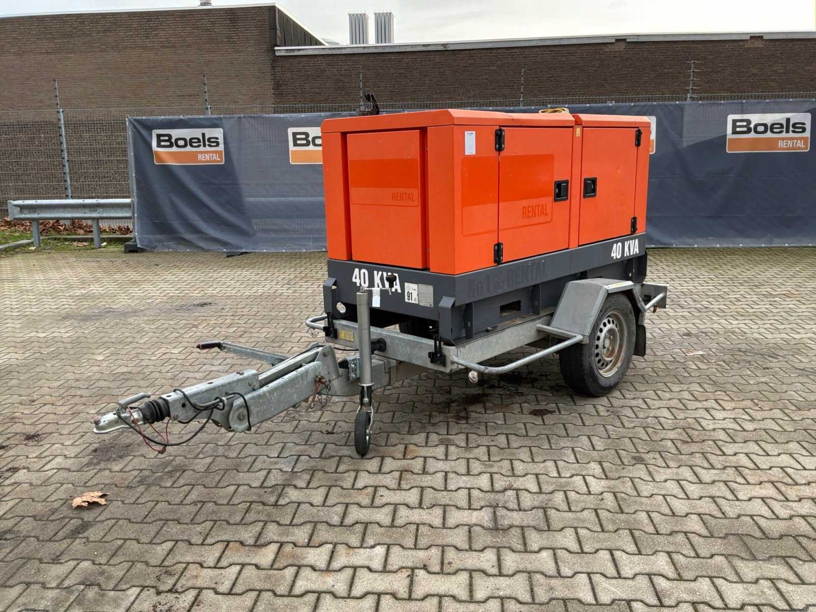 Gemonteerd op staal onderstel; geluidgedempt; aansluiting: 1x 230 Volt - 16 Ampère; 1x 400 Volt - 16 Ampère; 1x 400 Volt - 32 Ampère; 1x 400 Volt - 63 Ampère; inhoud brandstoftank 257 liter; aansluiting externe brandstoftank; verbruik bij maximale belasting 8,4 liter / uur; working condition; chassisnummer VV4152109DMG40081 ; neuswiel / neussteun; (de koper dient bij transport over de weg zelf te voorzien in een geldig kenteken; een 7 of 9 polige aansluitstekker of verloopstuk met kabel (verlengsnoer kan ter plaatse tegen betaling aangekocht worden); eventueel extra lichtbalk; Nederlandse kentekenpapieren; zonder gelijkvormigheidsattest; (67-WK-LS); afgelezen urenstand vanaf 15-10-2024, hiervoor urenstand 10813; Nee Merk: Atlas Copco Type: QAS 40 Bouwjaar: 2013 Serienummer: ESF334627 Capaciteit.: 40kVA Motor merk: Kubota Generator merk: Leroy-Somer Generator capaciteit: 57A Afgelezen urenstand: 11076 Machinegewicht: 1050kg Totale afmeting L: 2100mm Totale afmeting Breedte: 950mm Totale afmeting Hoogte: 1400mm