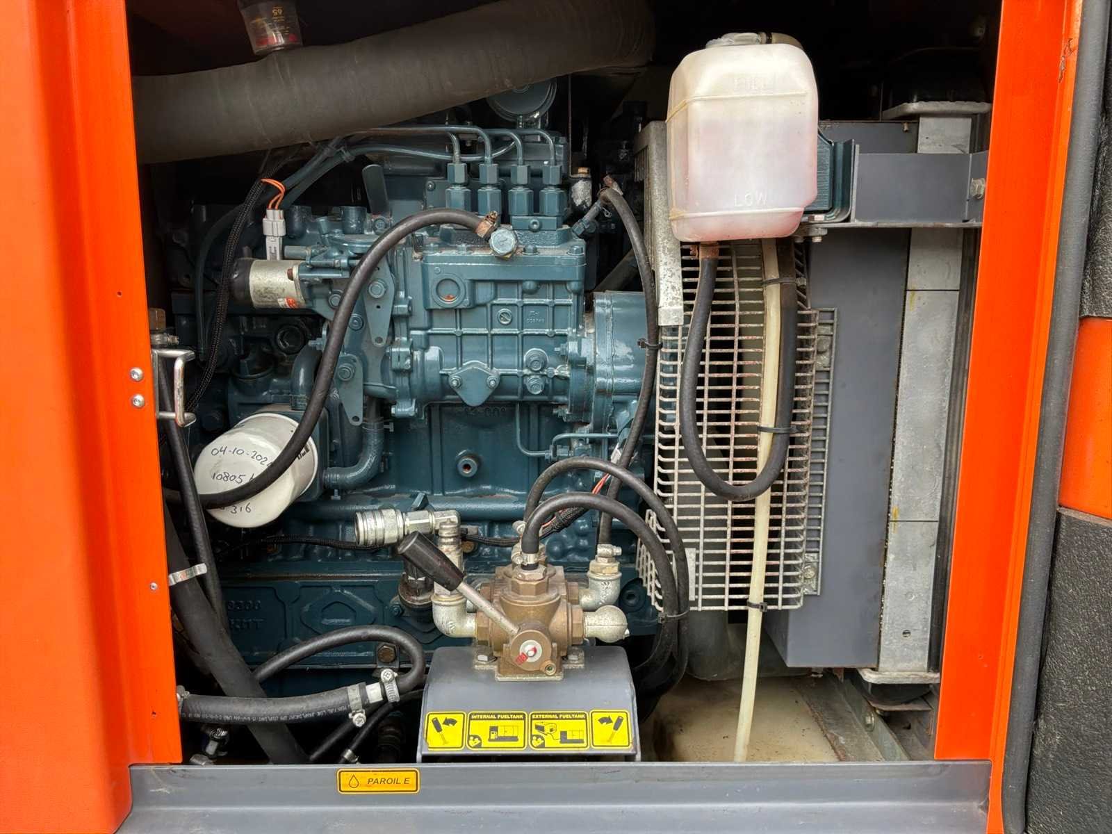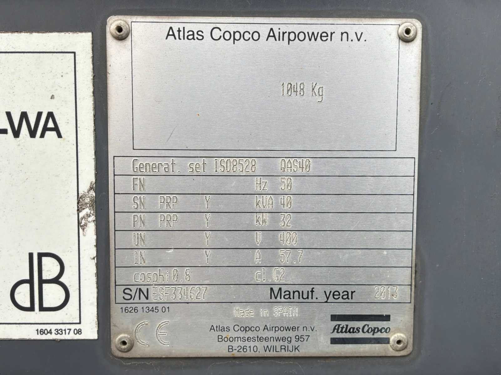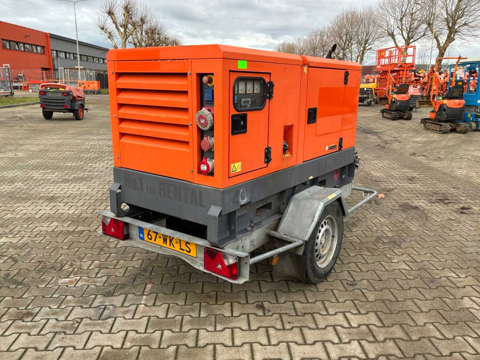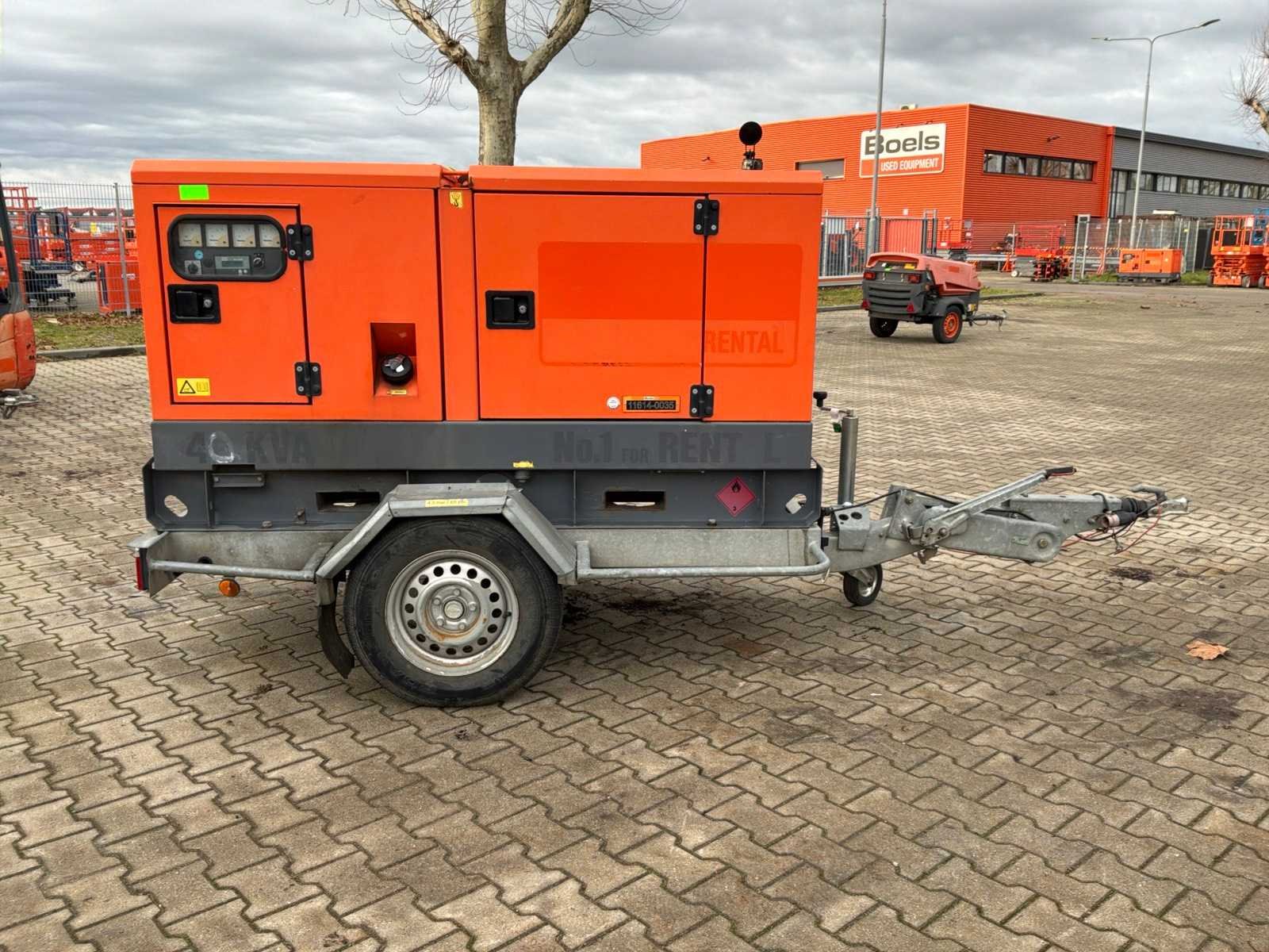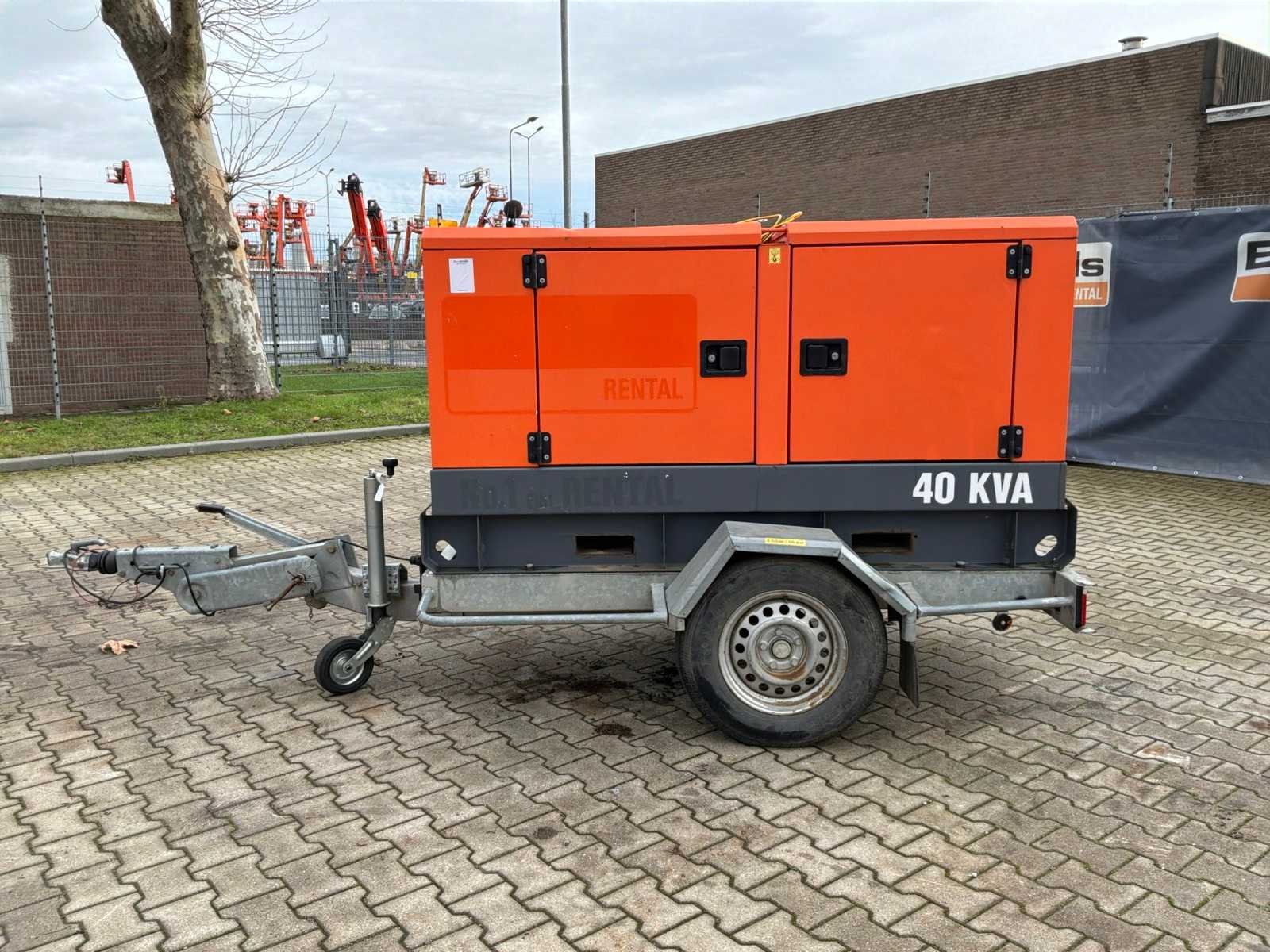 Gemonteerd op staal onderstel; geluidgedempt; aansluiting: 1x 230 Volt - 16 Ampère; 1x 400 Volt - 16 Ampère; 1x 400 Volt - 32 Ampère; 1x 400 Volt - 63 Ampère; inhoud brandstoftank 257 liter; aansluiting externe brandstoftank; verbruik bij maximale belasting 8,4 liter / uur; working condition; chassisnummer VV4152109DMG40081 ; neuswiel / neussteun; (de koper dient bij transport over de weg zelf te voorzien in een geldig kenteken; een 7 of 9 polige aansluitstekker of verloopstuk met kabel (verlengsnoer kan ter plaatse tegen betaling aangekocht worden); eventueel extra lichtbalk; Nederlandse kentekenpapieren; zonder gelijkvormigheidsattest; (67-WK-LS); afgelezen urenstand vanaf 15-10-2024, hiervoor urenstand 10813; Nee Merk: Atlas Copco Type: QAS 40 Bouwjaar: 2013 Serienummer: ESF334627 Capaciteit.: 40kVA Motor merk: Kubota Generator merk: Leroy-Somer Generator capaciteit: 57A Afgelezen urenstand: 11076 Machinegewicht: 1050kg Totale afmeting L: 2100mm Totale afmeting Breedte: 950mm Totale afmeting Hoogte: 1400mm