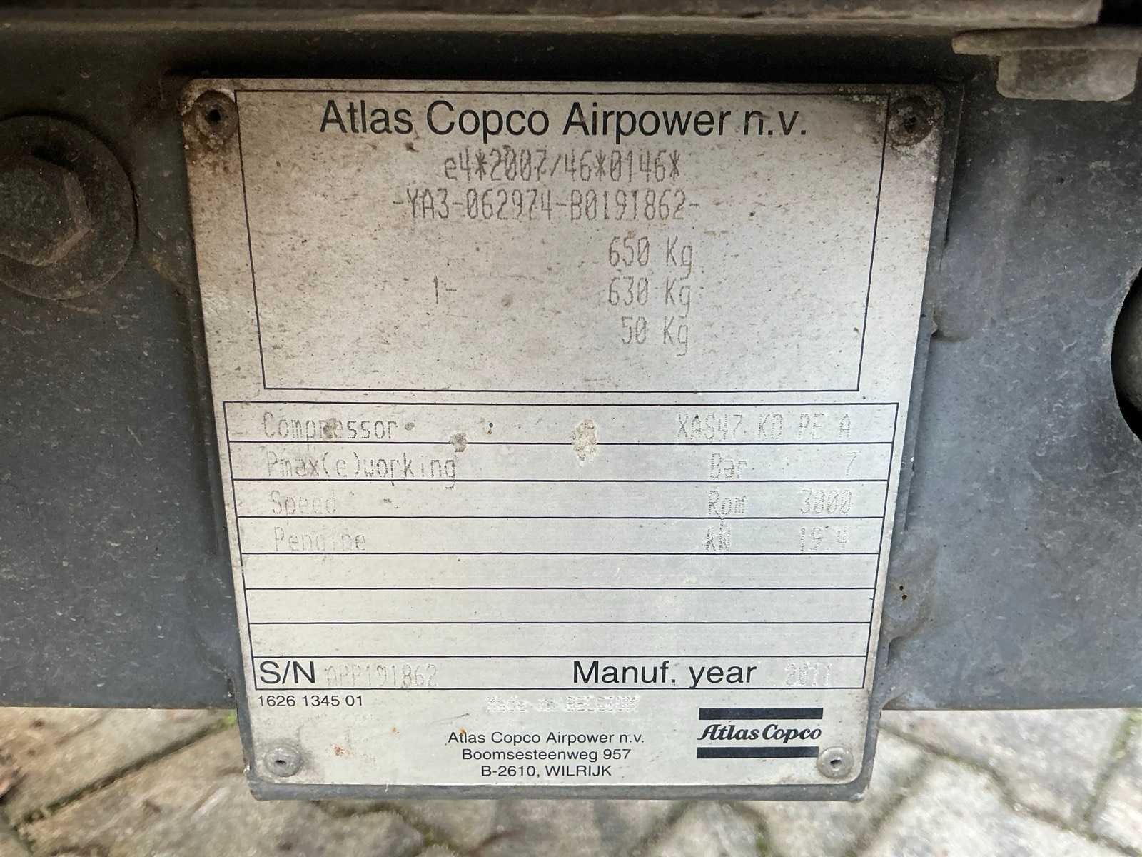 Chassisnummer YA3062974B0191862; afgelezen urenstand 1506 uur; Kubota 3 cilinder dieselmotor; werkdruk 7 bar; kunststof kap; opklapbare trekboom; neussteun; working condition; (de koper dient bij transport over de weg zelf te voorzien in een geldig kenteken; een 7 of 9 polige aansluitstekker of verloopstuk met kabel (verlengsnoer kan ter plaatse tegen betaling aangekocht worden); eventueel extra lichtbalk); zonder kentekenpapieren; zonder gelijkvormigheidsattest; Nee Merk: Atlas Copco Type: XAS47 KD Bouwjaar: 2011 Serienummer: APP191862 Luchtstroom: 2400l/min Vermogen: 18.5kW Afgelezen urenstand: 1510hr Totale afmeting L: 3350mm Totale afmeting Breedte: 1250mm Totale afmeting Hoogte: 1300mm