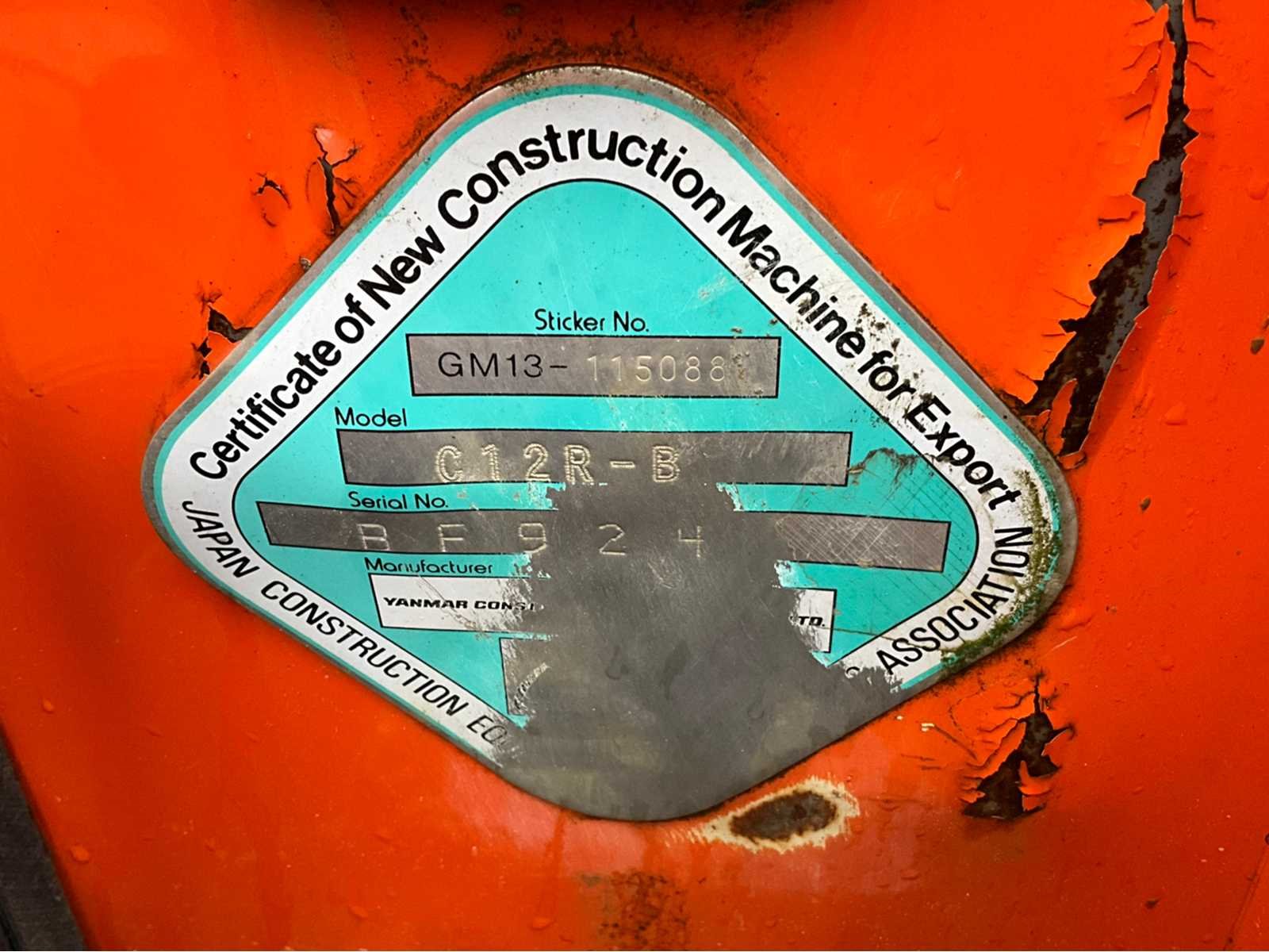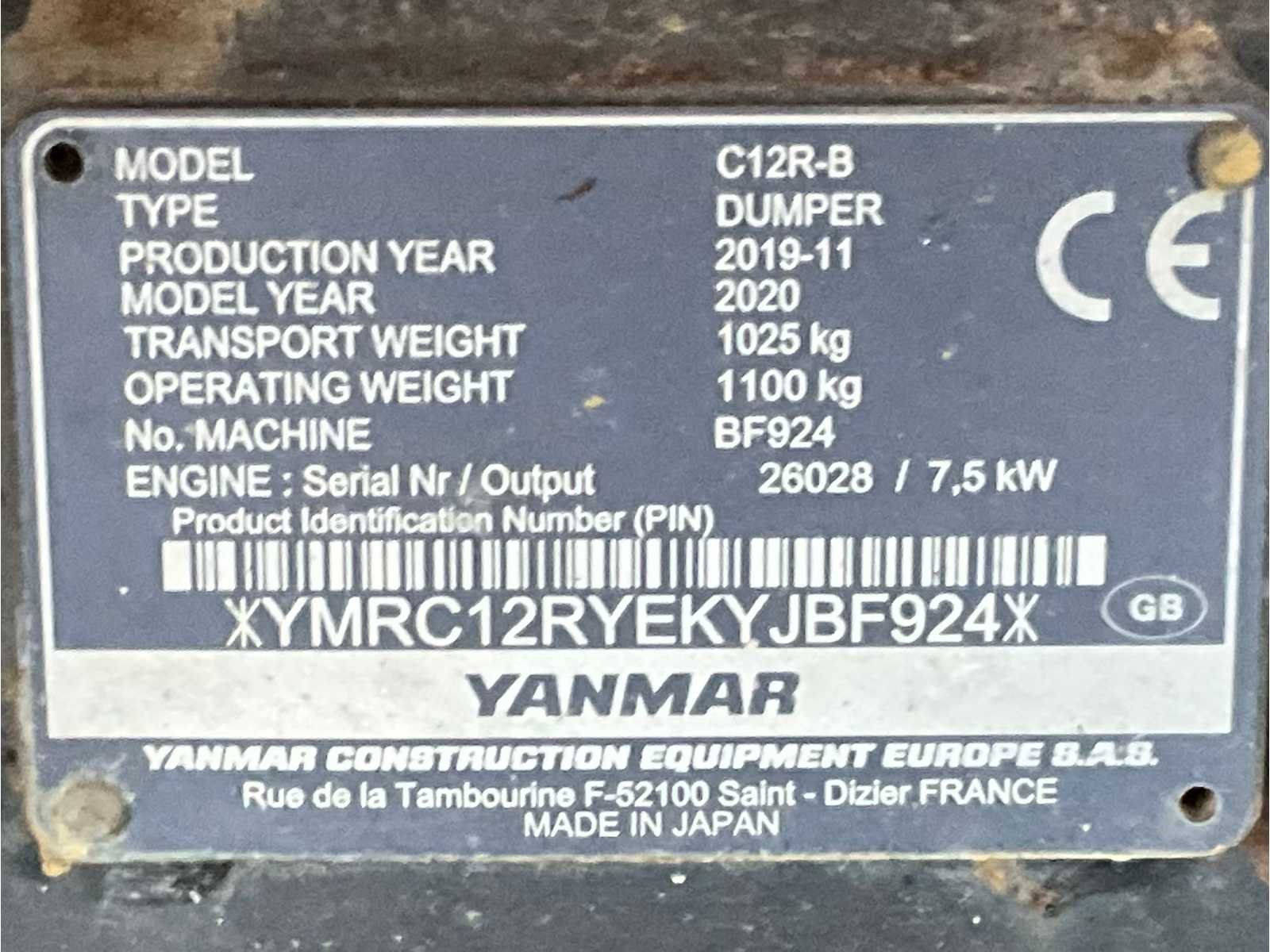 Driezijdig kiepen; inhoud opgehoopt 0,5 m3; kiephoogte 325 mm; rupsbreedte 230 mm; neerklapbare beugel; transporthoogte 1500 mm; maximale capaciteit brandstoftank 14,5 liter; working condition; Nee Merk: Yanmar Type: C12R-B Serienummer: YMRC12REYKYJBF924 Bouwjaar: 2019 Merk motor: Yanmar Motorvermogen (kW): 7.5kW Brandstof: Diesel Laadvermogen: 990kg Afgelezen urenstand: 390 Eigen gewicht: 1150kg Totale afmeting L: 2700mm Totale afmeting Breedte: 1000mm Totale afmeting Hoogte: 2250mm