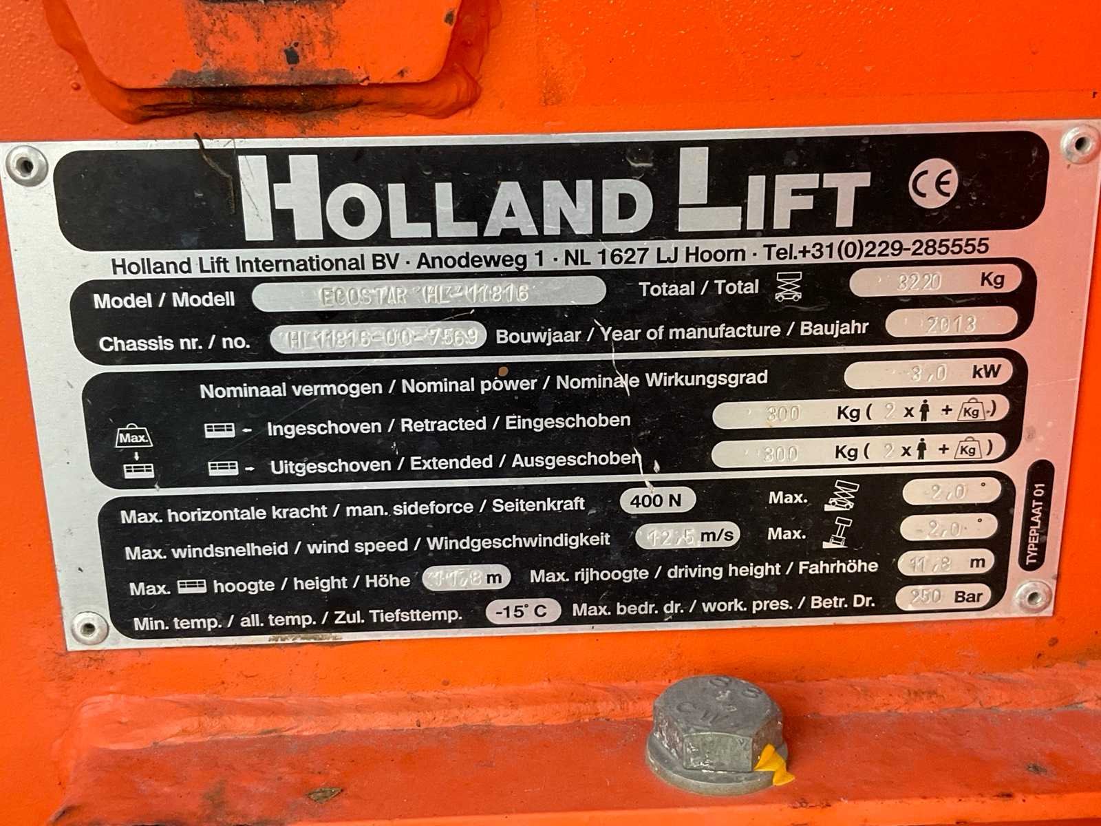 Gebruik: binnen en buiten; platform vloerhoogte 11800 mm; uitschuifbaar platform afmeting circa 3240x1400 mm; interne acculader 230 Volt; kooibediening; working condition Nee Merk: Holland Lift Type: HL-11816 Bouwjaar: 2013 Serienummer: HL11816.00.7569 Elektrisch: true Schaarhoogwerker: true Werkhoogte: 13800mm Plateau afm. l: 2340mm Plateau afm. b: 1400mm Platform capaciteit: 300kg Accu lader: true Afgelezen urenstand: 658 Eigen gewicht: 3300kg Totale afmeting L: 2500mm Totale afmeting Breedte: 1650mm Totale afmeting Hoogte: 2650mm