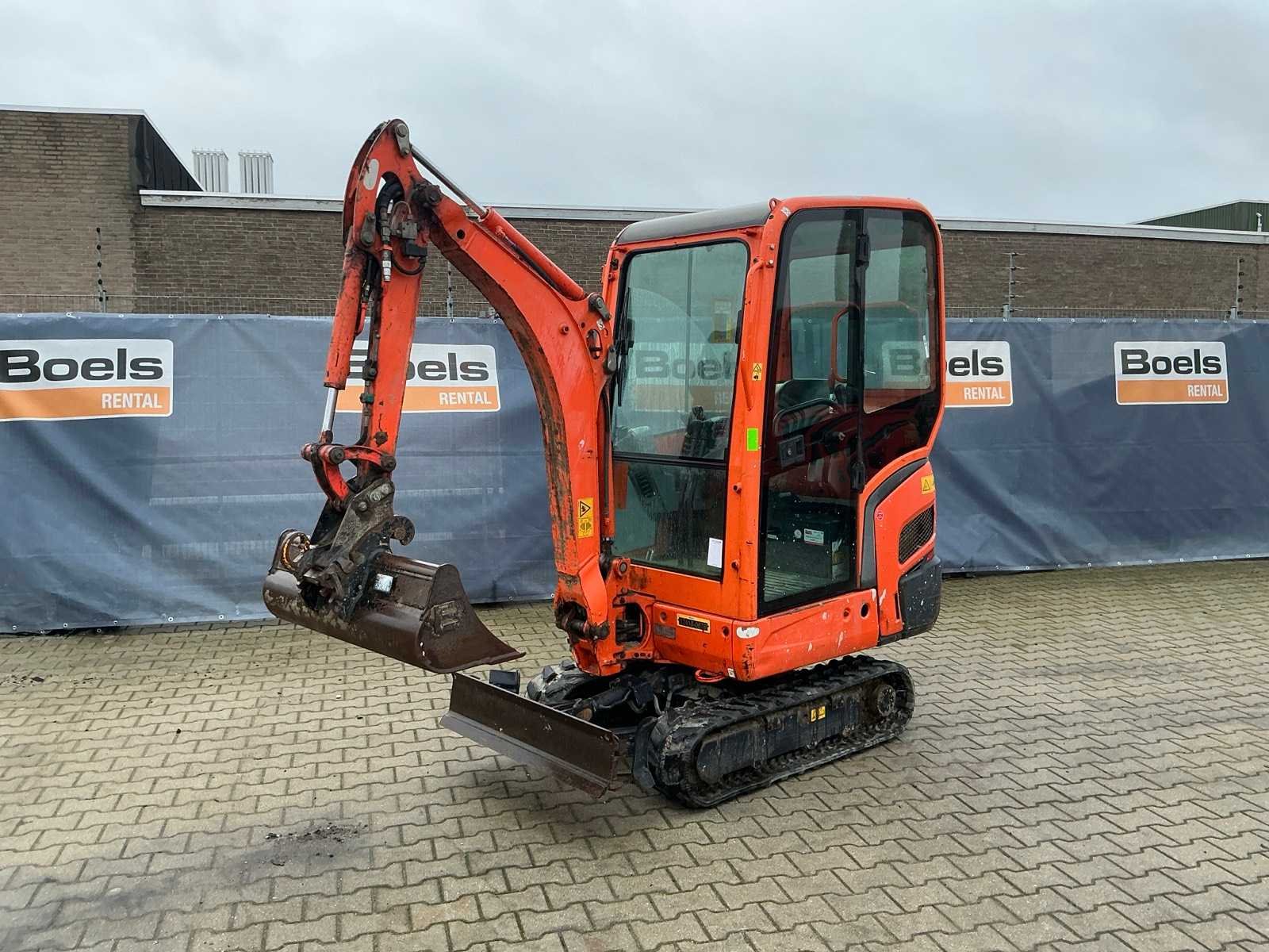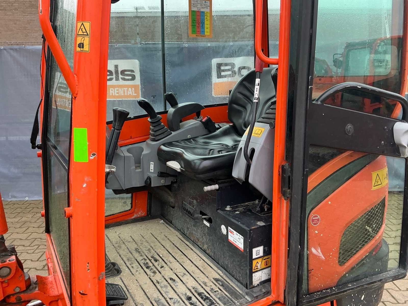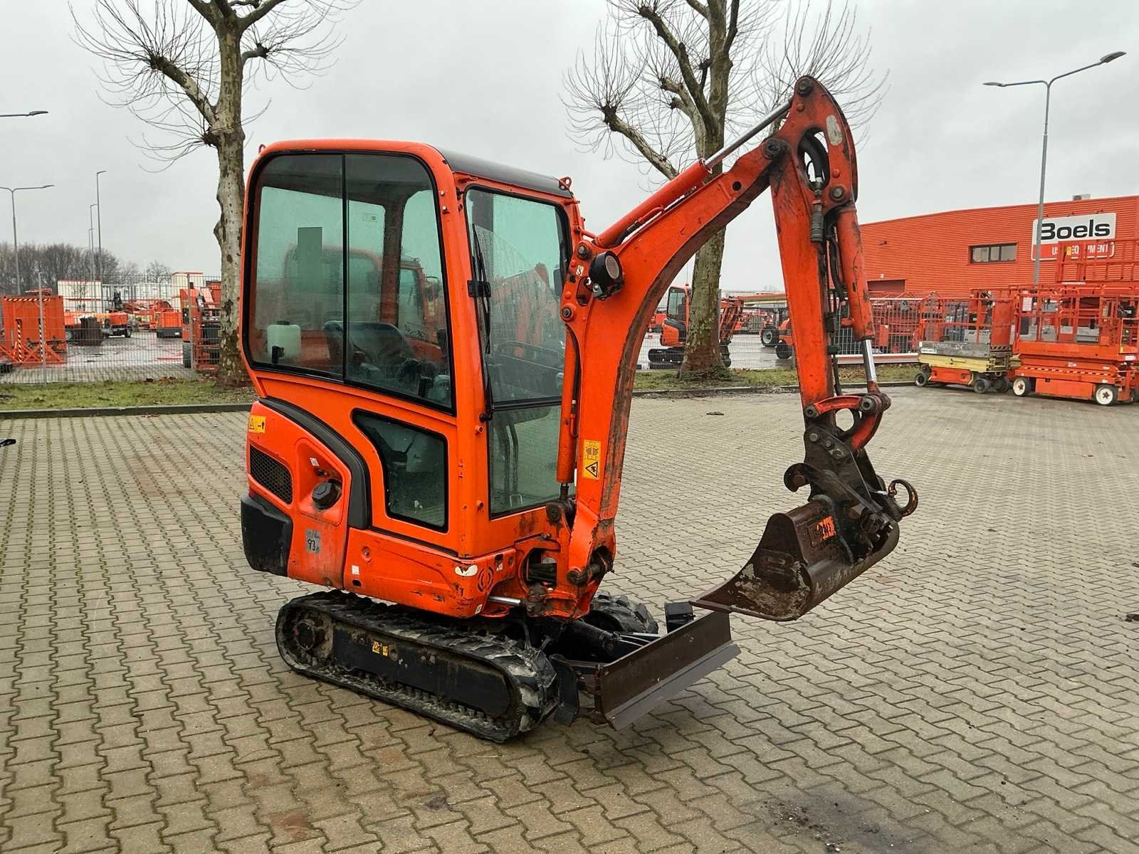 Gesloten cabine; rubber rupsbanden; rupsen hydraulisch in breedte verstelbaar 990 - 1240 mm; maximale uitstorthoogte 2250 mm; extra hydraulische functie; snelwissel; dozerblad breedte 1250 mm voorzien van verlengstuk; working condition; Nee Merk: Kubota Type: KX016-4 Bouwjaar: 2016 Serienummer: WKFRGB1200Z060029 / 60029 Merk motor: Kubota Motorvermogen (kW): 9.6kW Aantal cilinders: 3 Brandstof: Diesel Max. werkbereik: 3730mm Max. graafdiepte: 2250mm Inclusief graafbak: Yes Graafbak afm. l: 340mm Graafbak afm. b: 1010mm Graafbak afm. h: 260mm Rups breedte: 230mm Afgelezen urenstand: 2195 Eigen gewicht: 1615kg Totale afmeting L: 3750mm Totale afmeting Breedte: 1250mm Totale afmeting Hoogte: 2350mm