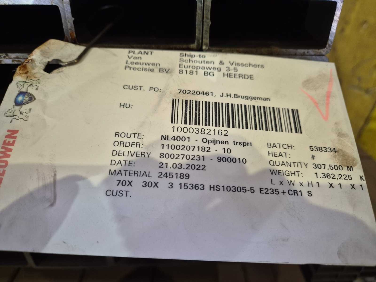- Stalen kokerprofielen E235 - afmeting 70x30x3mm Lengte 6150mm - leverancier van Leeuwen Precisie BV - gewicht per bundel ca 1307kg Nee