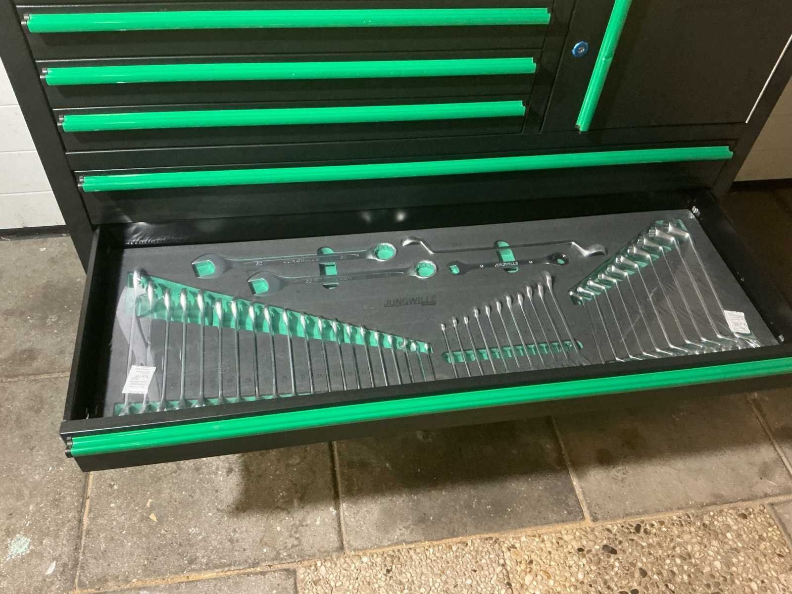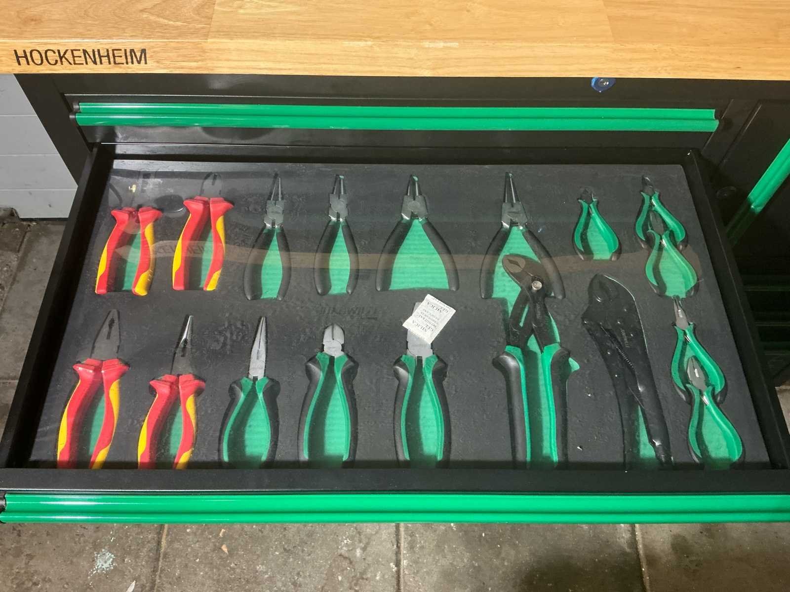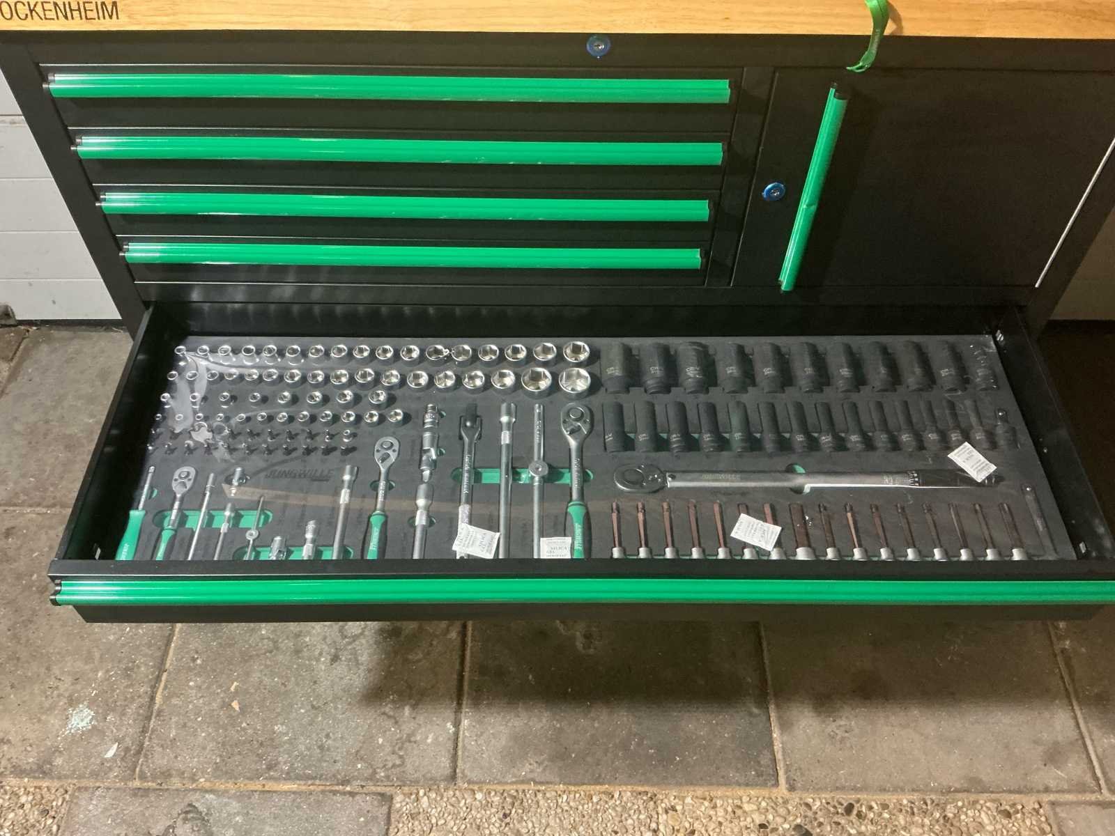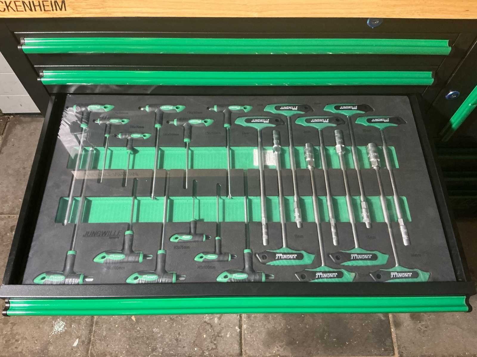 Schroevendraaierset, tangenset, dopsleutels en inbussleutels, torx, algemeen handgereedschap, doppenset, doppenset met bit, steeksleutelset en beugels. Staat: nieuw, nooit gebruikt. Nee Merk: Jungwille Model: Jw48XXL Type: Hockenheim Kleur: Zwart Lengte: 49cm Breedte: 122cm Hoogte: 106cm