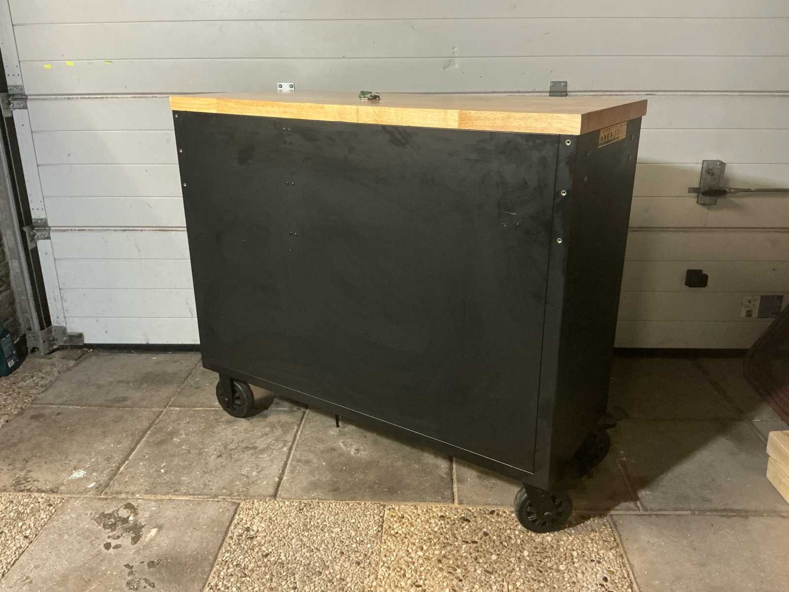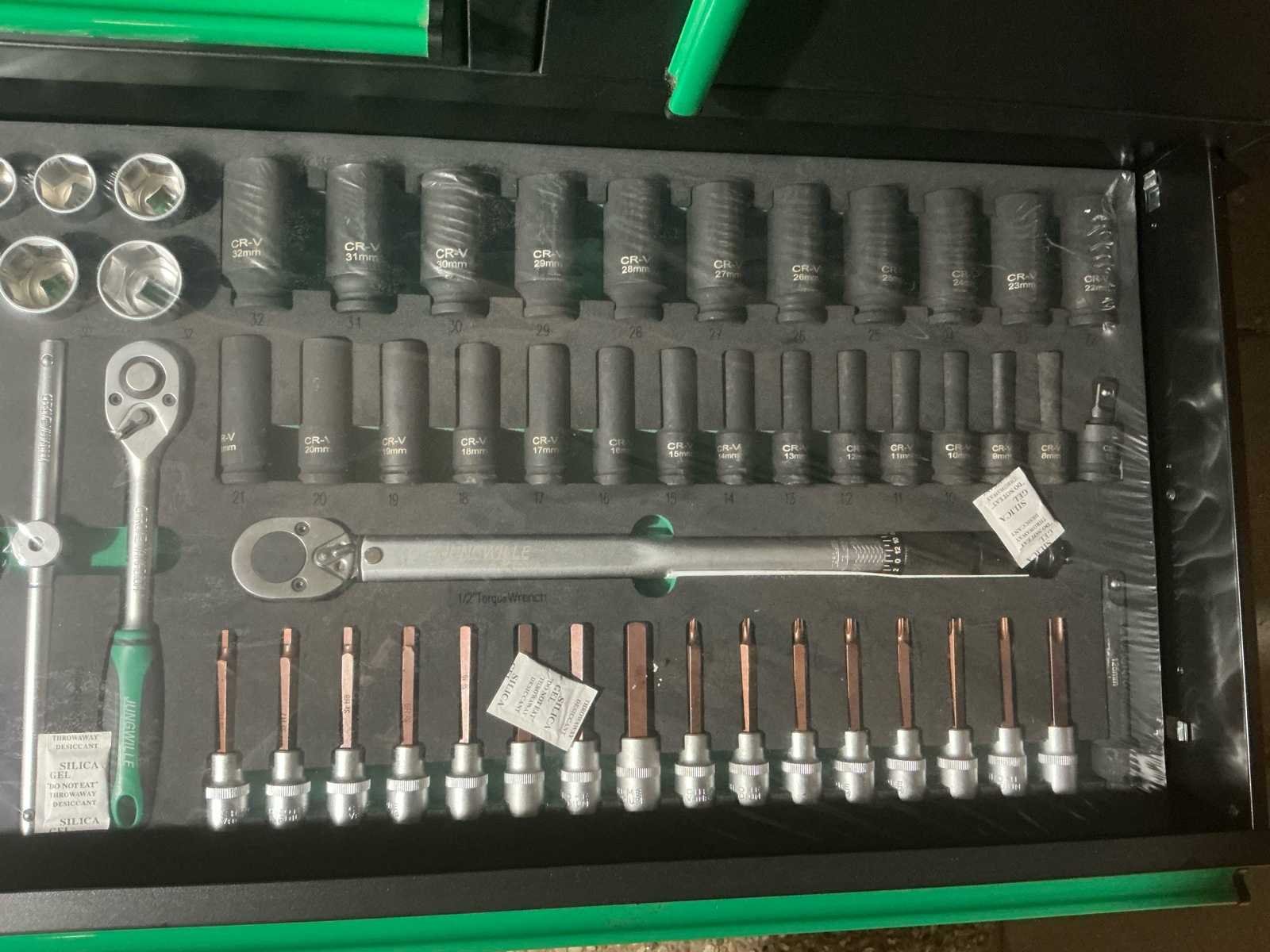 Schroevendraaierset, tangenset, dopsleutels en inbussleutels, torx, algemeen handgereedschap, doppenset, doppenset met bit, steeksleutelset en beugels. Staat: nieuw, nooit gebruikt. Nee Merk: Jungwille Model: Jw48XXL Type: Hockenheim Kleur: Zwart Lengte: 49cm Breedte: 122cm Hoogte: 106cm
