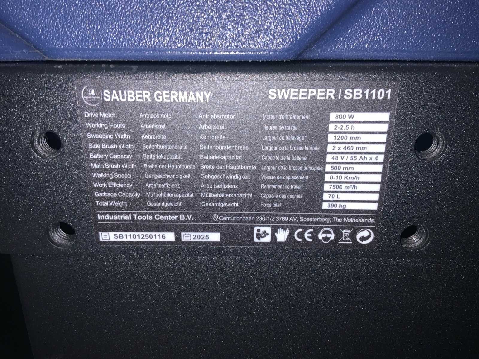 Borstel breedte 460mm * voorzien van 48V lader * inhoud vuilwatertank 70 liter * max snelheid 10km/h * geschikt voor circa 7500m2/h * vermogen 800 watt Nee Merk: Sauber Germany Type: Sweeper SB1101 Bouwjaar: 2025 Serienummer: SB1101250116 Werkbreedte: 1200mm Elektrisch: true Afgelezen urenstand: 0hr Accu lader: true Aansluiting: 230V Eigen gewicht: 390kg Totale afmeting L: 1350mm Totale afmeting Breedte: 800mm Totale afmeting Hoogte: 1300mm Leveringsvoorwaarden: Gratis op vrachtwagen