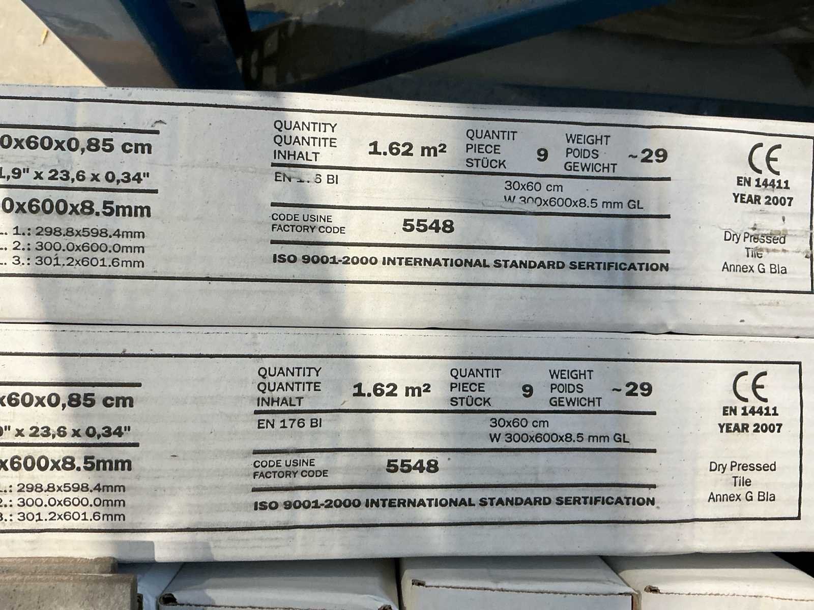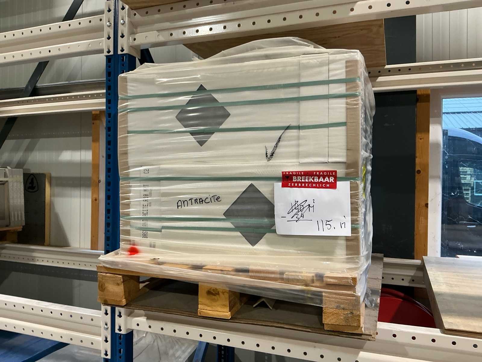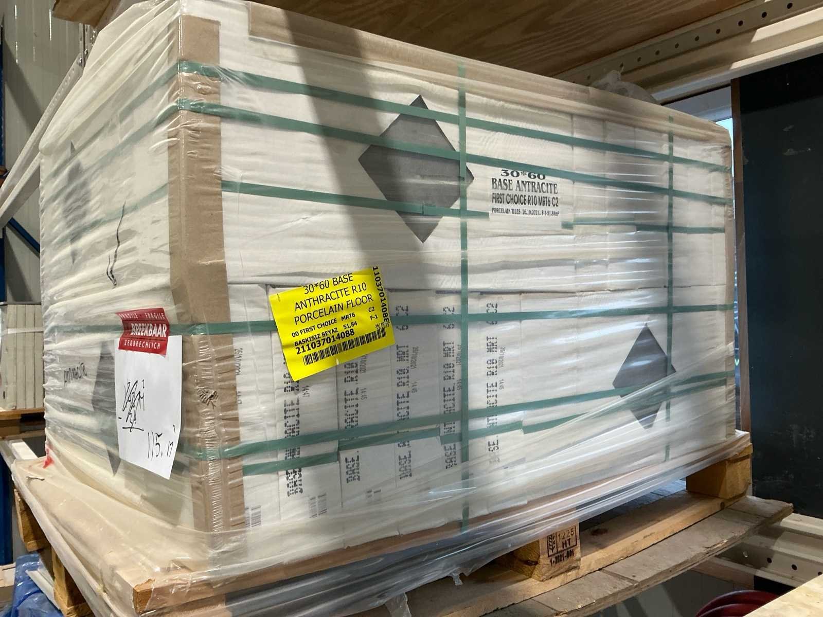Bestaat uit: 2 1/2 pallet tegels, Nee Merk: Base Antraciet Kleur: Antraciet Lengte: 600mm Breedte: 300mm Dikte: 85mm Materiaal: Keramiek Type: 5548 base antraciet rio Aantal m² per verpakking: 162m² Totaal oppervlakte: 115m²