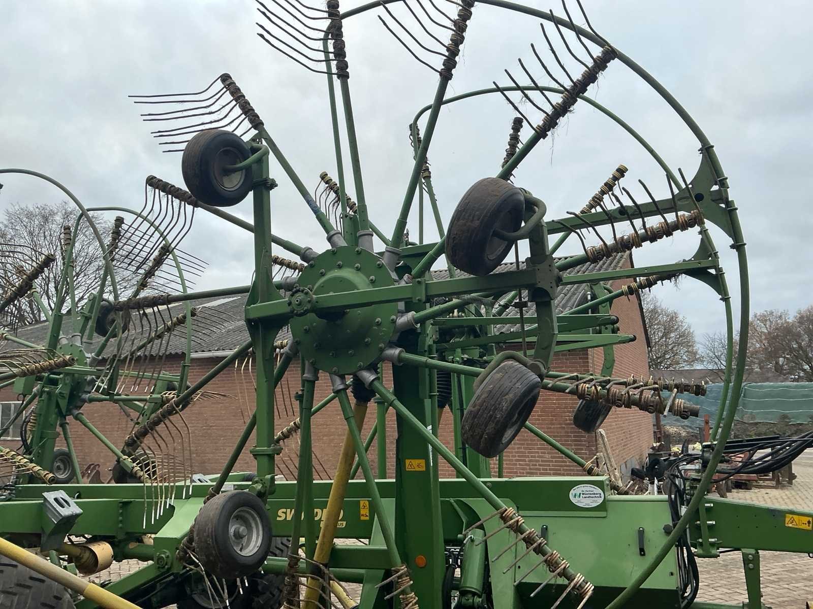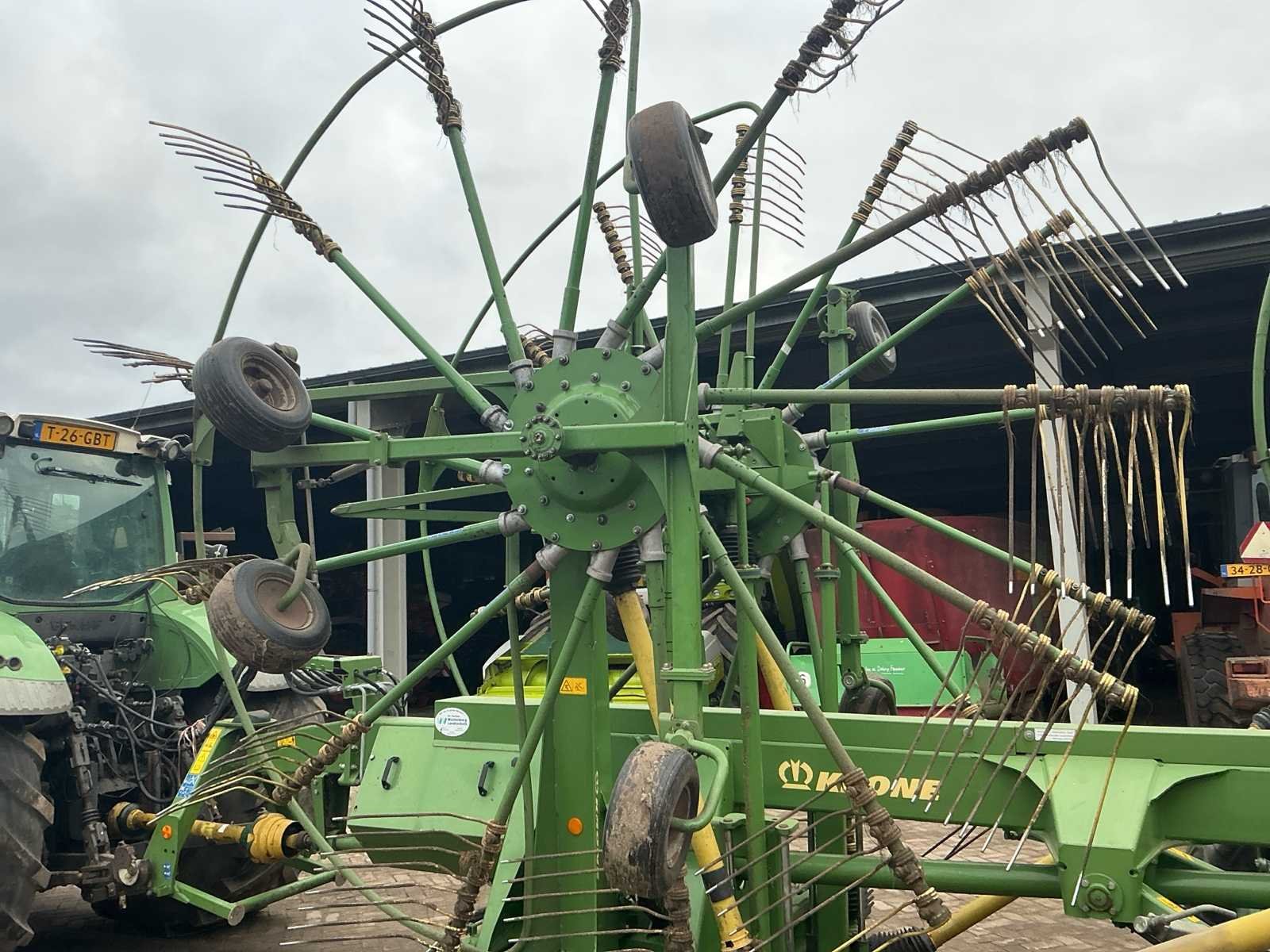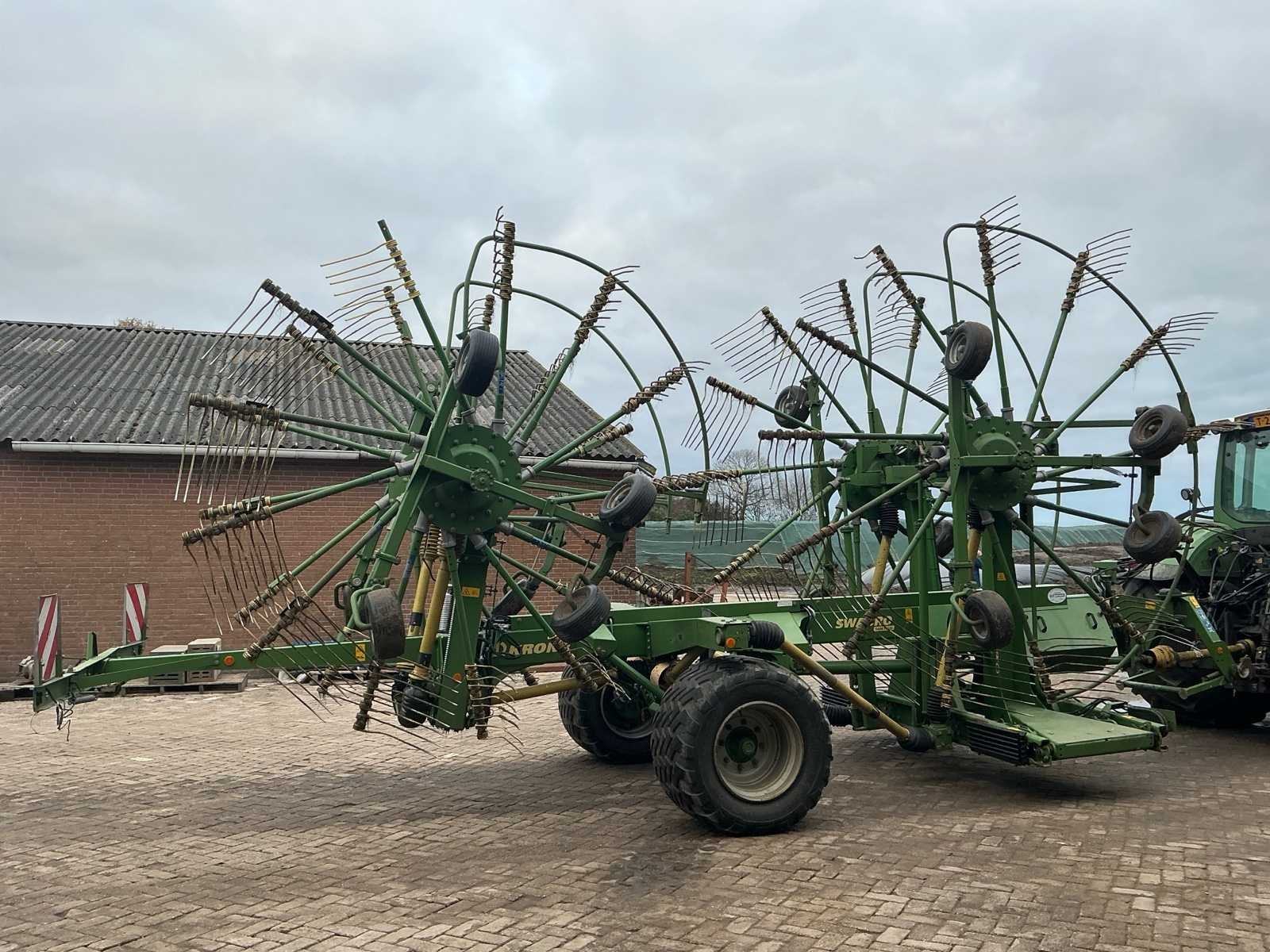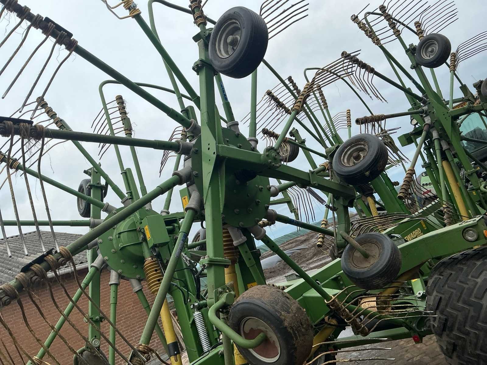 Voorzien van: De Krone Swadro 1400 Plus SW2E heeft een werkbreedte van 9,80–13,50 m, een zwadenbreedte van 1,40–2,20 m, 4 rotoren met 13–15 armen per rotor en 4 tanden per arm, en een capaciteit tot circa 15–20 hectare per uur afhankelijk van gewas en rijsnelheid. Instelbare curvebanen, vernieuwt in 2024. Elektrisch in hoogte te verstellen, rotors. Lucht remmen. Loadsensing en tractorhydroliek bediening. Werklampen. De Krone Swadro 1400 Plus is een vierrotor-zwadhark met een werkbreedte van 9,80–13,50 m, zwadenbreedte van 1,40–2,20 m, 4 rotoren met 13–15 armen en 4 tanden per arm, een capaciteit van 15–20 ha/uur, een eigen gewicht van circa 4.800–5.000 kg, transportafmetingen van ongeveer 3,0 m breed, 4,0 m hoog en 6,5–7,0 m lang, en een aanbevolen tractorvermogen van 120–150 pk. De Krone Swadro 1400 Plus heeft een transportbreedte van circa 3,0 meter, een transporthoogte van ongeveer 4,0 meter, een transportlengte van 6,5–7,0 meter en een eigen gewicht van circa 4.800–5.000 kg. Nee Merk: Krone Type: Swadro 1400 Plus Bouwjaar: 2016 Serienummer: SWE945233 Bouwjaar: 2016 Eigen gewicht: 5900kg Werkbreedte: 14000mm
