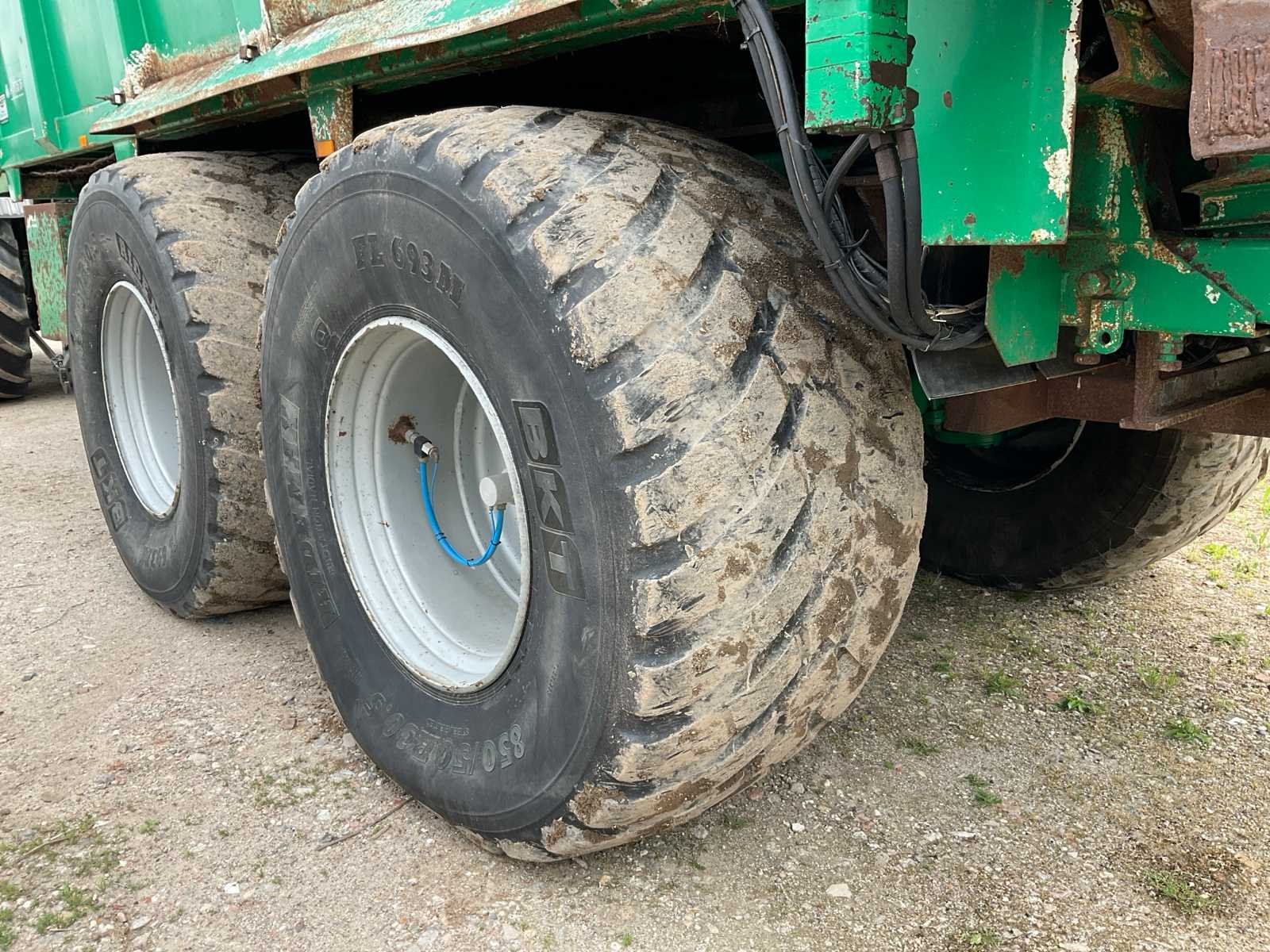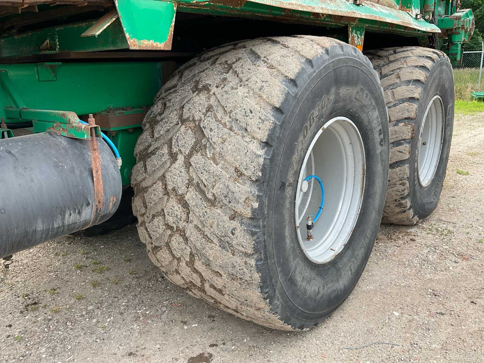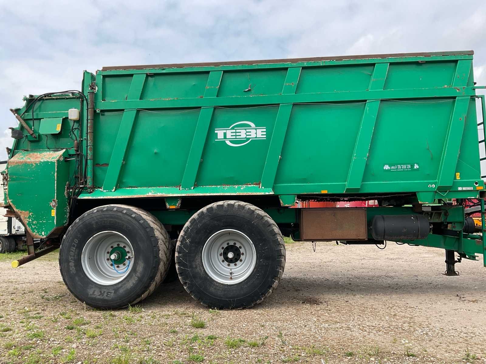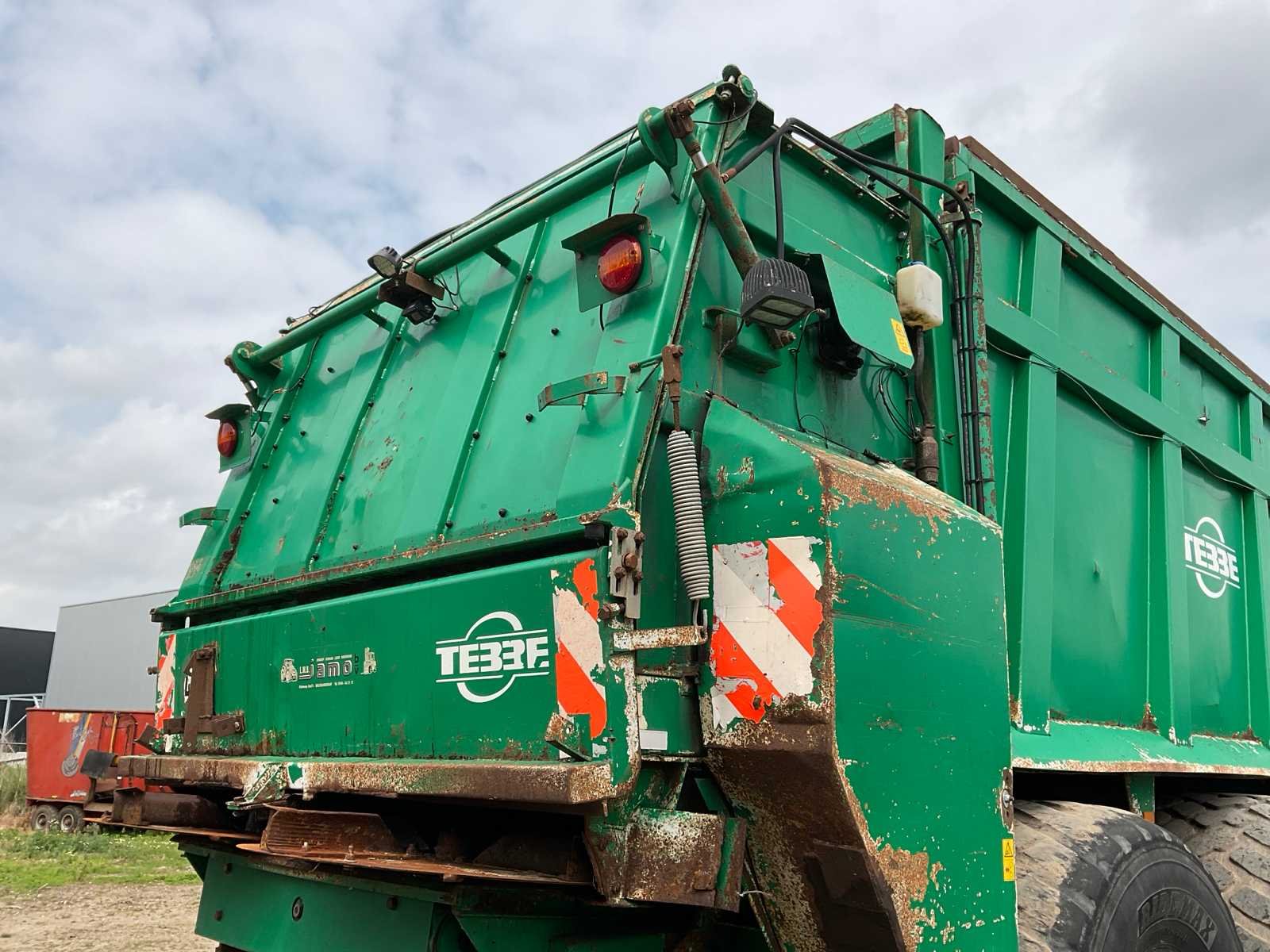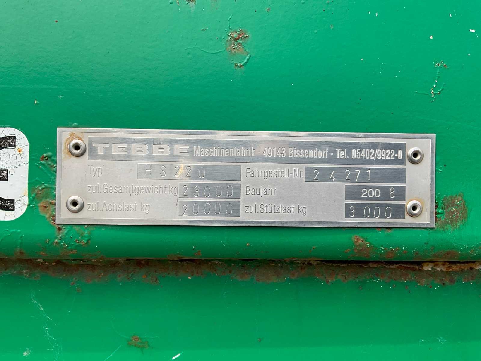 Voorzien van: electro-hydraulische bediening (load-sensing), MDT geikt weegsysteem, luchtdrukwisselsysteem, toerentalbewaking, hydraulisch gedwongen gestuurde achteras, K80 aanspan, automatisch smeersysteem, mechanische steunpoot, luchtremmen, geveerde dissel, hydraulische vering, liftas voor, aftakas aangedreven strooischijven, hydraulische achterklep, hydraulisch doseerschuif, kunststof stootranden, trekhaak achter, bodemketting (HV100 zwaar type vervangen) (stuurcilinder links achter defect, nu vastgezet) Nee Merk: Tebbe Type: HS220 Bouwjaar: 2008 Serienummer: 24271 Bandenmaat: BKT 850/50R30.5 (Alliance rechts/voor) Totale afmeting L: 8700mm Totale afmeting Breedte: 2980mm Totale afmeting Hoogte: 3800mm