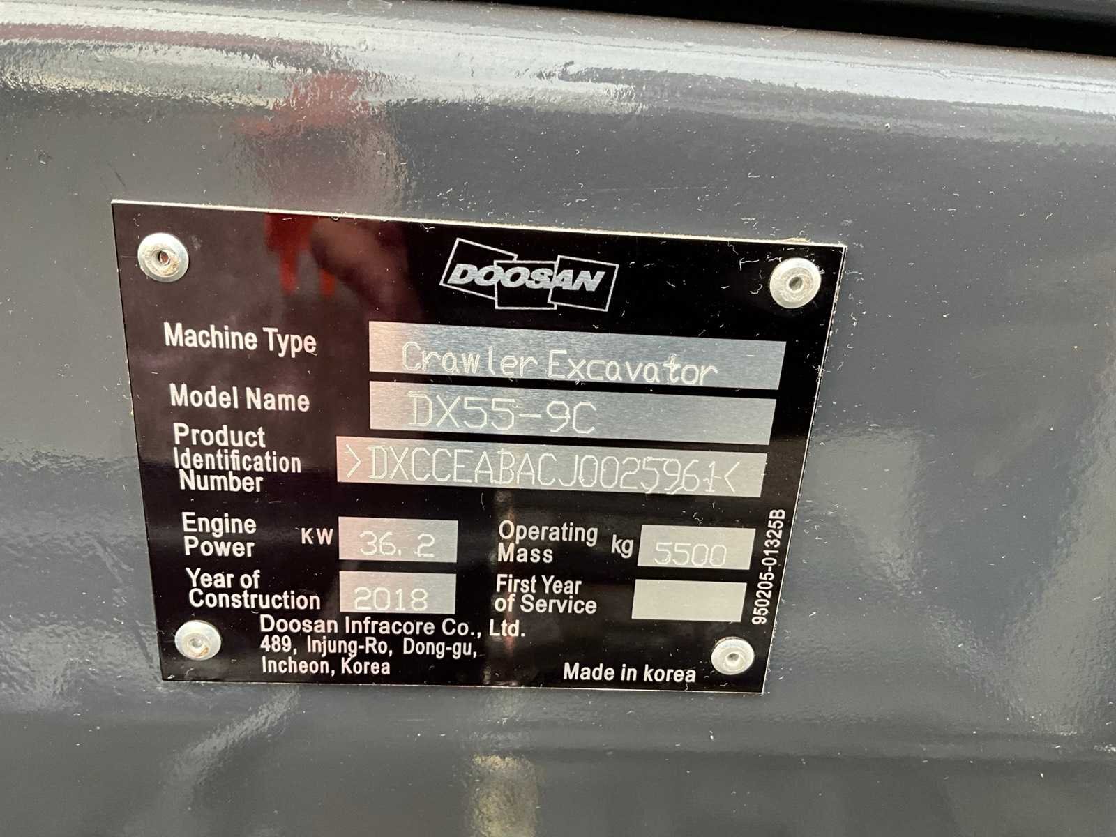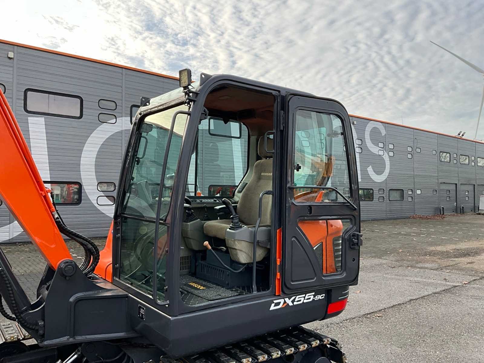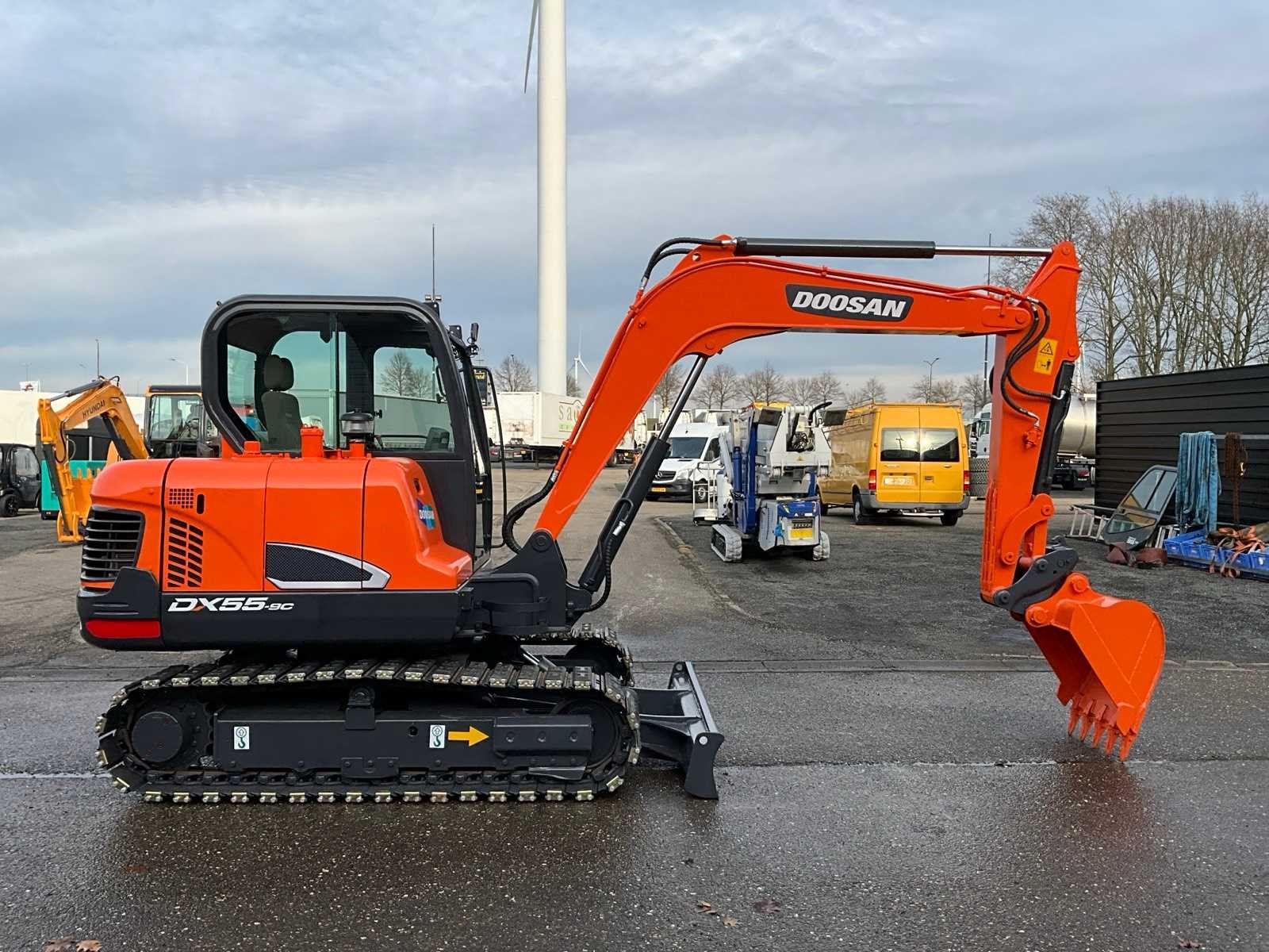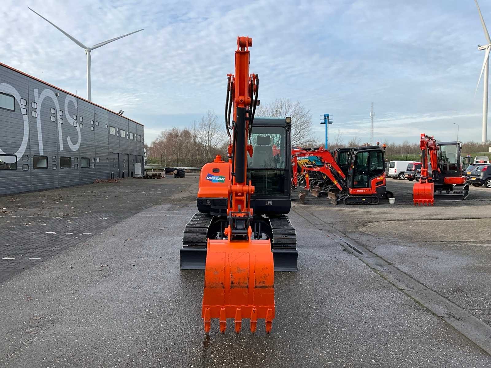 Dieplepelbak met tanden 700mm, mechanische snelwissel, extra hydraulische functie, schuifblad, 2e rijsnelheid Nee Merk: Doosan Type: DX55-9C Bouwjaar: 2018 Serienummer: 25961 Merk motor: Yanmar Motorvermogen (kW): 36kW Aantal cilinders: 4 Brandstof: Diesel Bedrijfsgewicht: 5500kg Met graafbak: true Graafbak afm. b: 700mm Rups breedte: 380mm Cabine: true Afgelezen urenstand: 4900 Totale afmeting L: 6500mm Totale afmeting Breedte: 1900mm Totale afmeting Hoogte: 2700mm