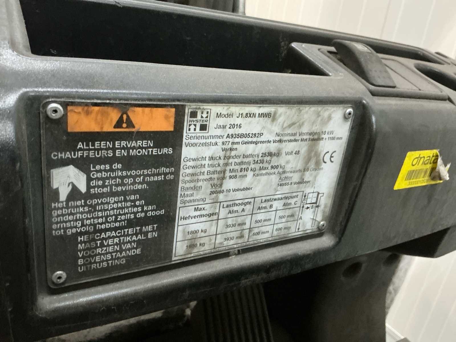 Voorzien van: bluespot, verlichting, rijrichtingschakelaar op hefhendel, werkverlichting, Nee Merk: Hyster Type: J1.8XN MWB Bouwjaar: 2016 Serienummer: A935B05282P Mast: Duplex Aantal wielen: 4 Afgelezen urenstand: 25794 Accu lader: true Side-shift: true Hydraulisch verstelbare lepels: true Duplex mast: true Eigen gewicht: 3430kg Hefvermogen: 1800kg Lepellengte: 1100mm Max. hefhoogte: 3930mm Vol rubber banden: true Minimale doorrijhoogte: 2500mm Totale afmeting L: 3000mm Totale afmeting Breedte: 1050mm Totale afmeting Hoogte: 2500mm