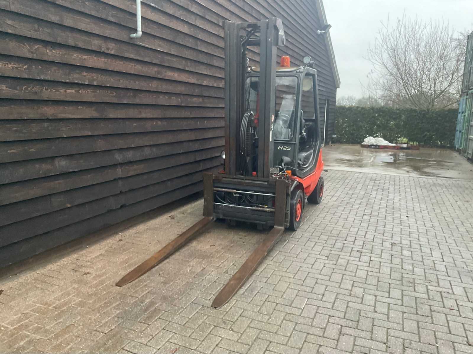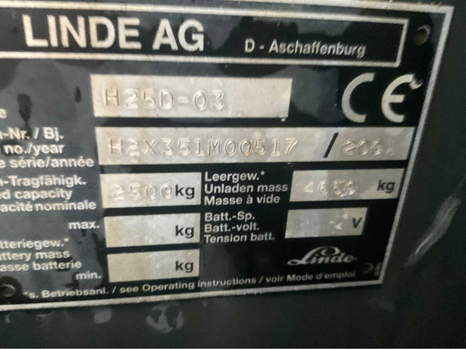 Nee Merk: Linde Type: H 25 d Bouwjaar: 2001 Brandstof: Diesel Mast: Triple Soort band: Volrubber banden Aantal wielen: 4 Afgelezen urenstand: 11026 Free-lift: true Side-shift: true Hydraulisch verstelbare lepels: true Eigen gewicht: 4050kg Hefvermogen: 2500kg Lepellengte: 2800mm Max. hefhoogte: 6000mm Hefhoogte: 6000mm Vol rubber banden: true Minimale doorrijhoogte: 2600mm Totale afmeting L: 3200mm Totale afmeting Breedte: 1300mm Totale afmeting Hoogte: 2600mm Diesel: true