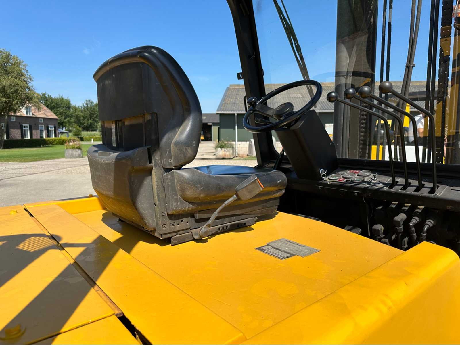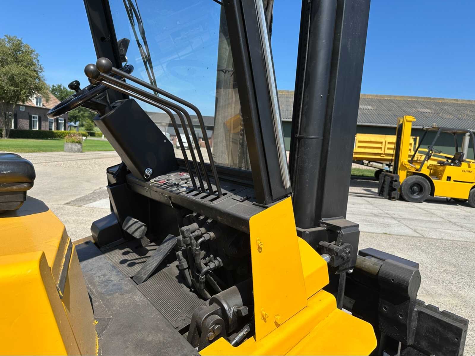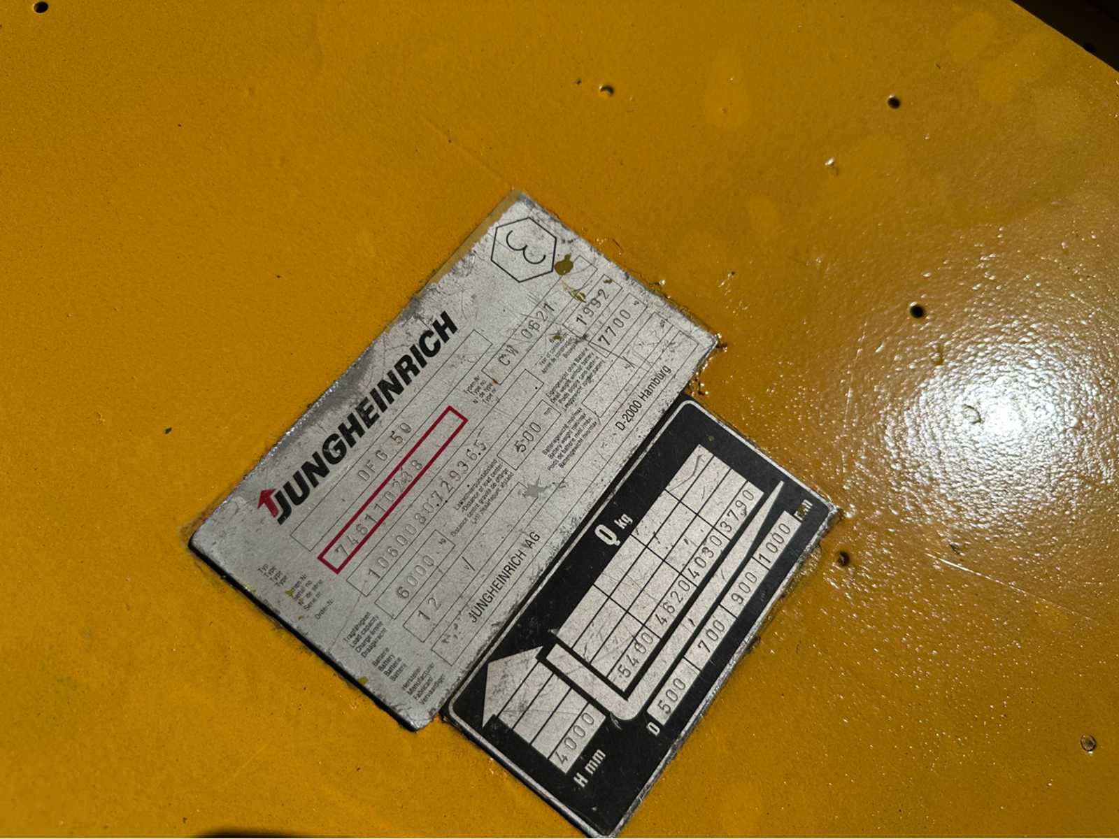 Motor: Perkins 1004.42 dieselmotor met een vermogen van 60 kW, Gewicht: 7,08t, Draaicirkel: circa: 2,75 m, Rijsnelheid: ± 22–24 km/h, Hefsnelheid: ± 0,53–0,55 m/s, Daalsnelheid: ± 0,51/0,39 m/s (met/zonder last) Nee Merk: Jungheinrich Type: DFG50 Bouwjaar: 1992 Serienummer: 74611023x8 Brandstof: Diesel Aantal wielen: 4 Afgelezen urenstand: 4288 Duplex mast: true Hefvermogen: 5000kg Lepellengte: 1200mm Max. hefhoogte: 5000mm Vol rubber banden: true Minimale doorrijhoogte: 2700mm Totale afmeting Breedte: 4530mm Totale afmeting Hoogte: 3290mm Diesel: true