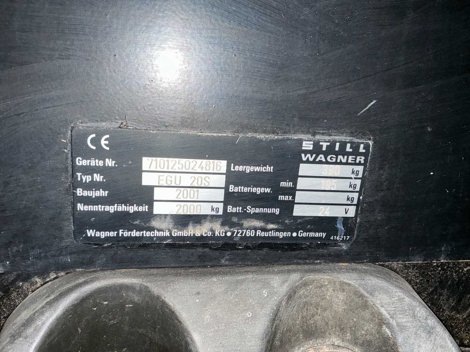 Voorzien van: acculader, enkelrol No Merk: Still Type: EGU20S Bouwjaar: 2001 Serienummer: 710125024816 Hefvermogen: 2000kg Lepellengte: 1140mm Meerij palletwagen: true Accu lader: true Afgelezen urenstand: 3277 Eigen gewicht: 390kg Totale afmeting L: 1700mm Totale afmeting Breedte: 7050mm Totale afmeting Hoogte: 1270mm