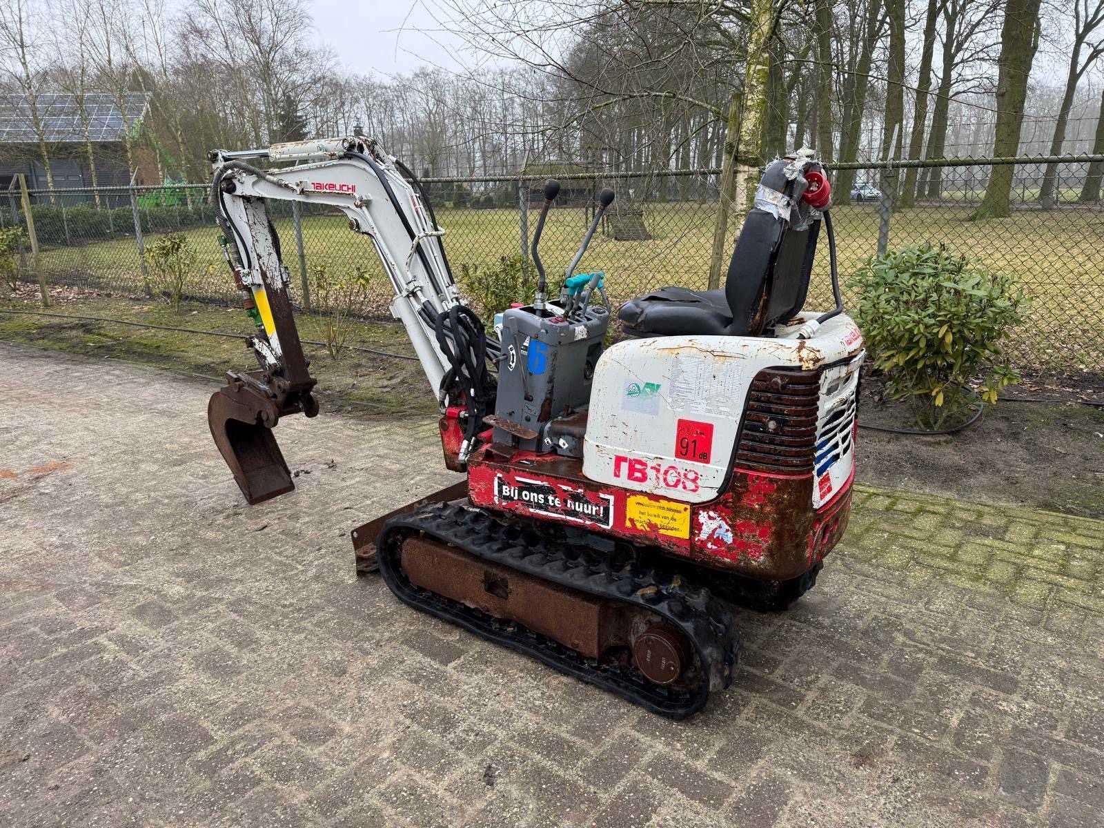 Werkend, voorzien van mechanische snelwissel & extra hydraulische functies No Merk: Takeuchi Type: TB108 Bouwjaar: 2006 Merk motor: Yanmar Motorvermogen (kW): 7kW Brandstof: Elektrisch Bedrijfsgewicht: 860kg Inclusief graafbak: Ja Rups breedte: 180mm Totale afmeting L: 2710mm Totale afmeting Breedte: 680mm Totale afmeting Hoogte: 2110mm