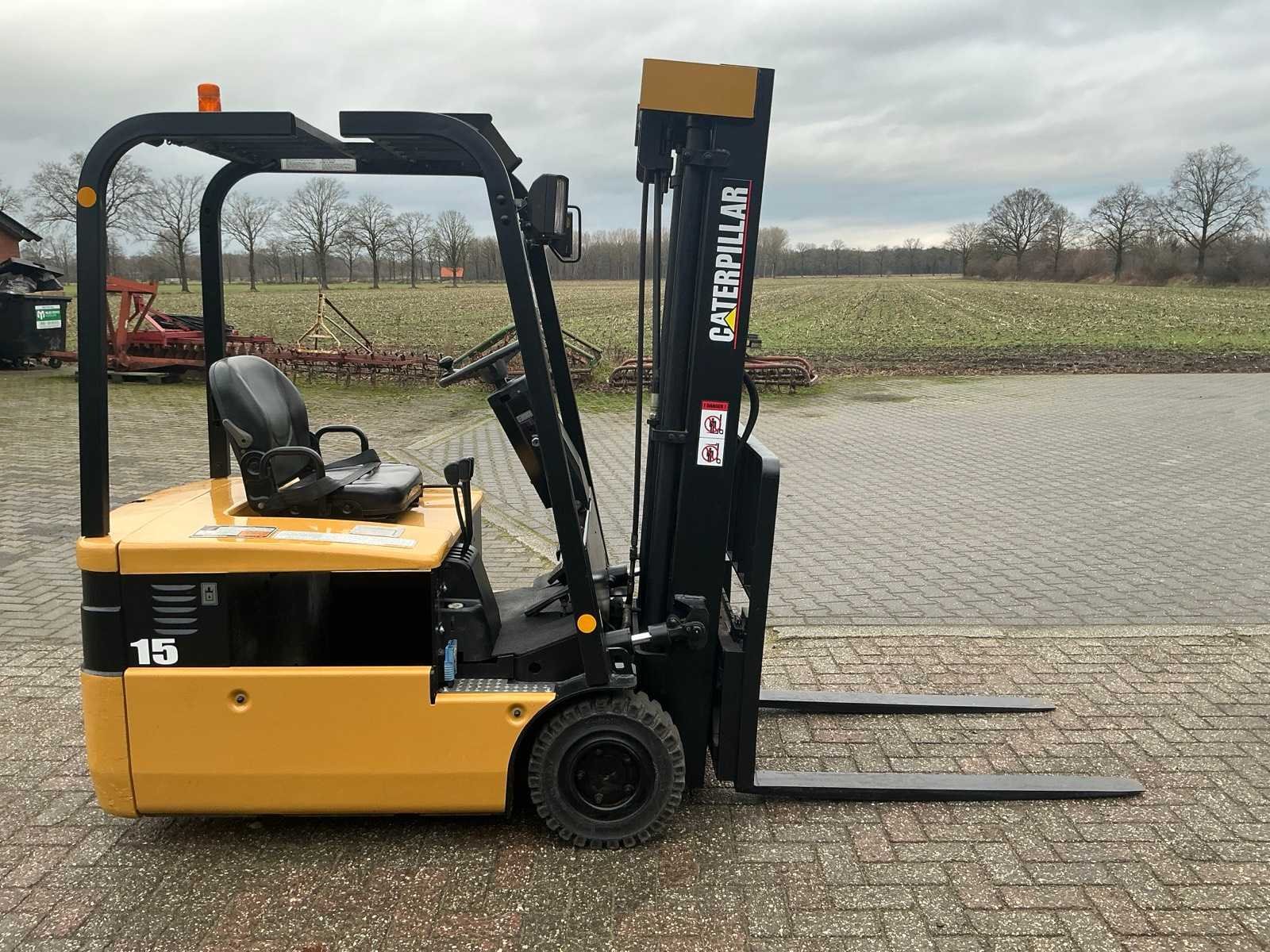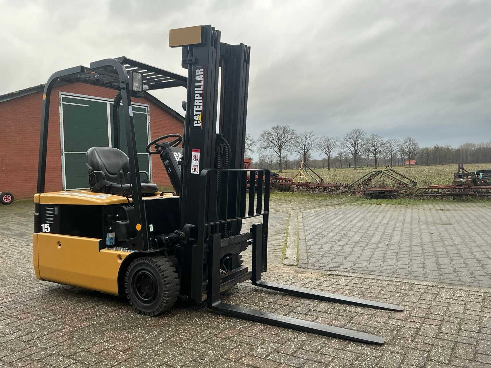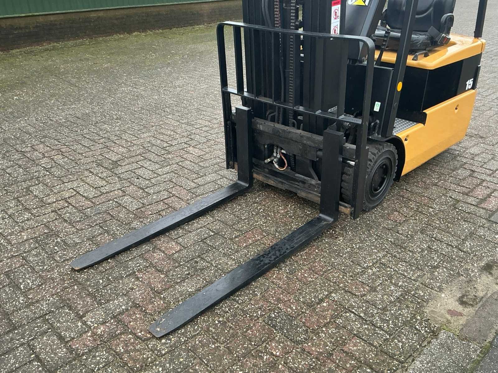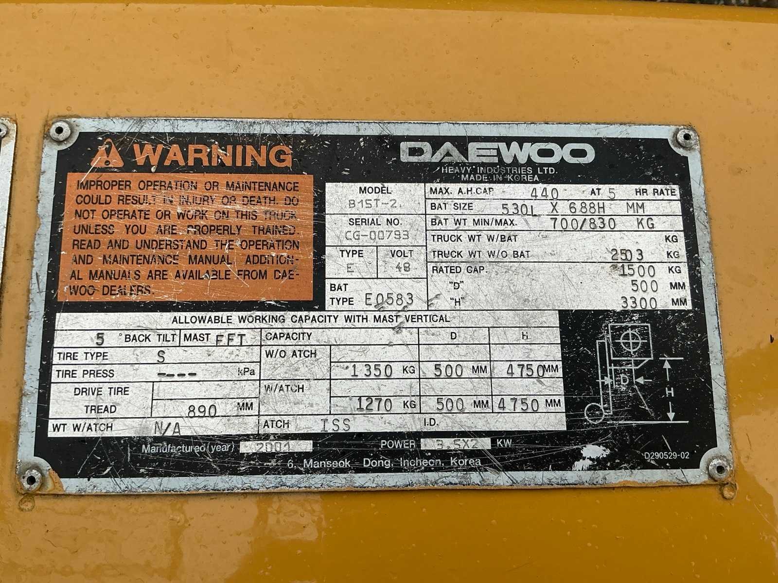 Let op: geen accupakket en lader aanwezig. 48V. No Merk: Caterpillar/Deawoo Type: B15T-2 Bouwjaar: 2001 Serienummer: CG-00793 Brandstof: Elektrisch Mast: Triple Soort band: Volrubber banden Aantal wielen: 4 Afgelezen urenstand: 5449 Free-lift: true Side-shift: true Hydraulisch verstelbare lepels: true Triple mast: true Eigen gewicht: 2503kg Hefvermogen: 1500kg Lepellengte: 1200mm Max. hefhoogte: 4750mm Vol rubber banden: true Totale afmeting L: 3080mm Totale afmeting Breedte: 1100mm Totale afmeting Hoogte: 2100mm