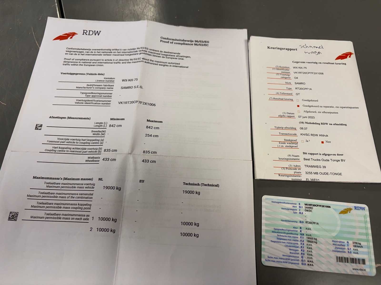 Max gewicht: 19.000kg, voorzien van: Luchtvering, trekoog 40mm, verlichting, onderbouw Nee Merk: Samro Type: Schamelwagen Model: 19t Bouwjaar: 2007 Chassisnummer: RT20CP7F2X1006 Aantal assen: 2 Laadbak afmeting l: 610cm Laadbak afmeting b: 245cm Ledig gewicht: 3790kg Laadvermogen: 15210kg Datum eerste toelating: 2007-05-21 Datum eerste toelating (NL): 2007-05-30 Kenteken: wxnx75 Kentekenpapieren compleet?: true Nationaliteit documenten: Nederlands