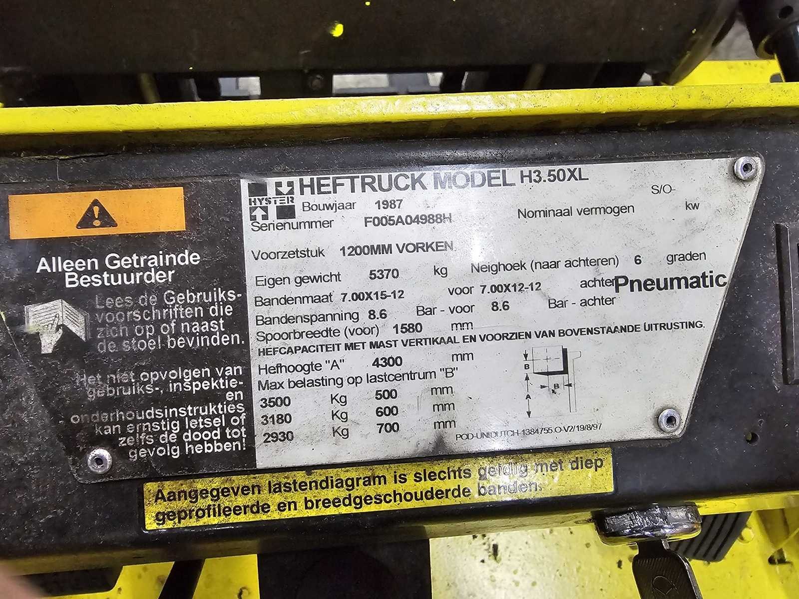 Extra verzwaard met contragewicht Nee Merk: Hyster Type: 3.50XL Brandstof: LPG Mast: Duplex Aantal wielen: 4 Duplex mast: true Eigen gewicht: 5370kg Hefvermogen: 3500kg Lepellengte: 1000mm Hefhoogte: 4300mm Vol rubber banden: true LPG: true