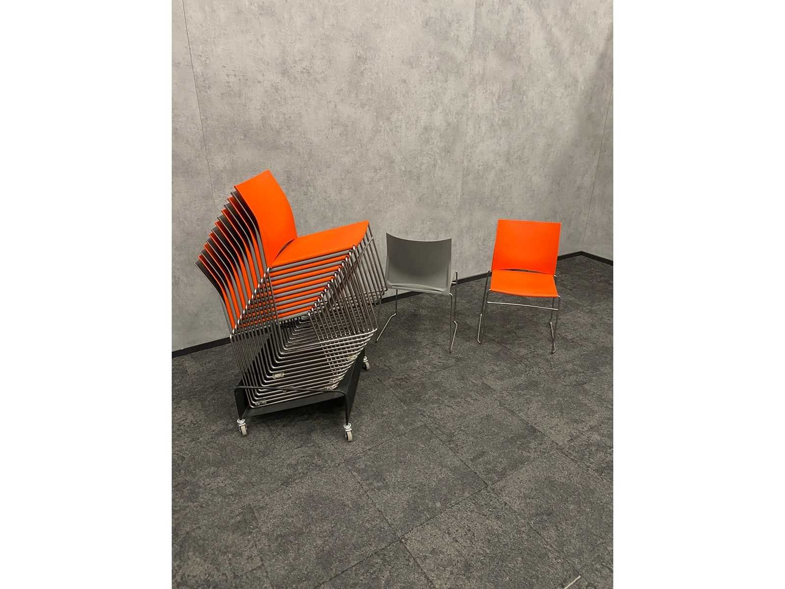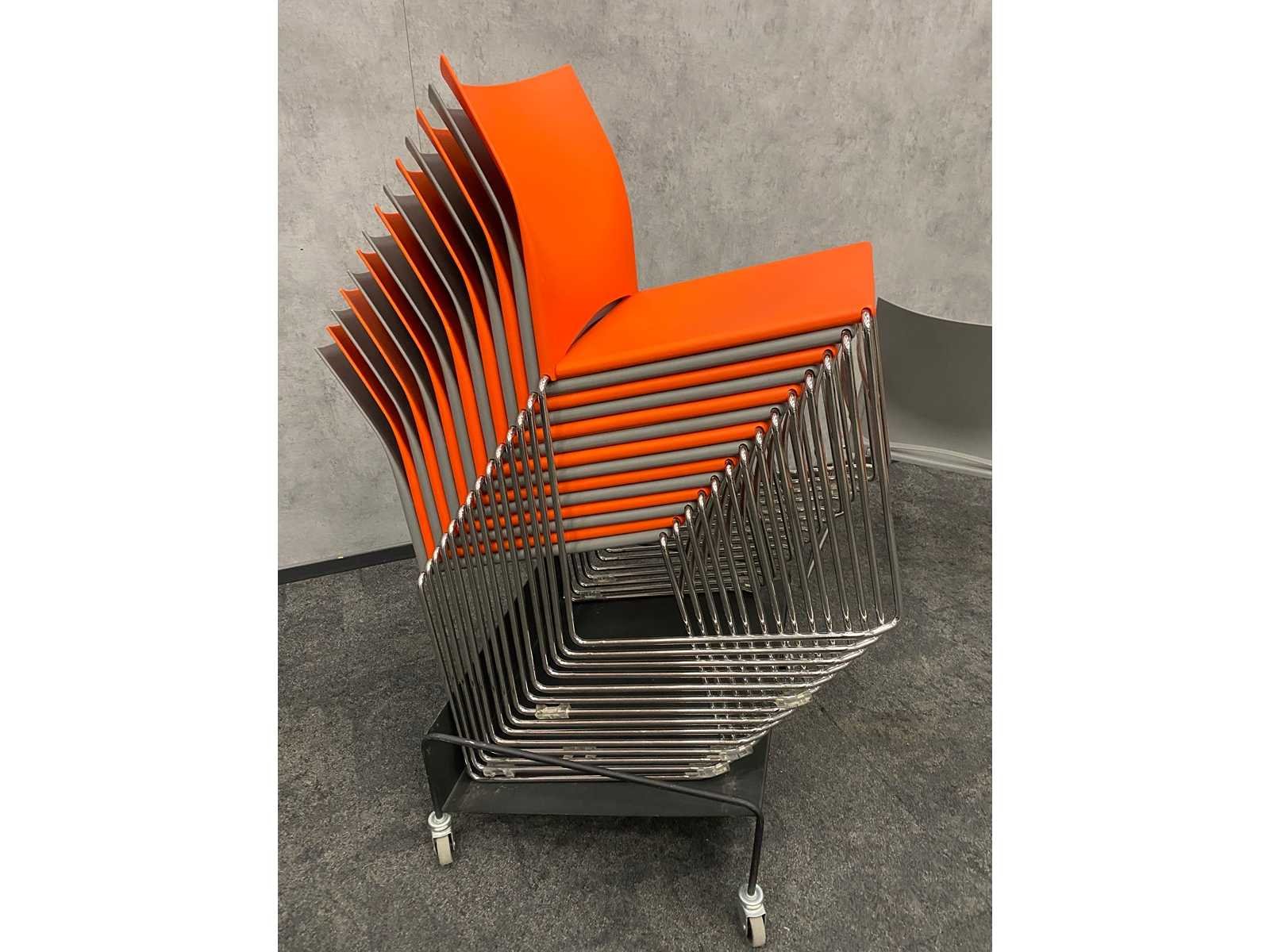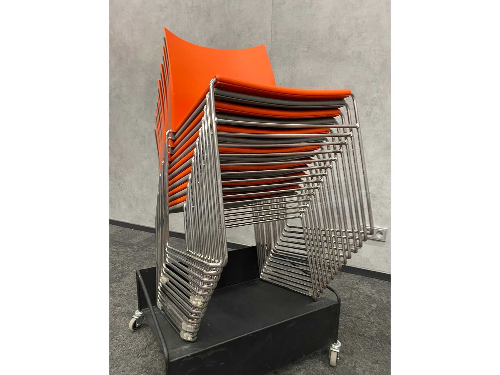 Zithoogte ca. 44 cm. -- v.v. sledeframe Nee Stapelbaar: true Kleur: grijs/ oranje/ chroom Materiaal: metaal, kunststof