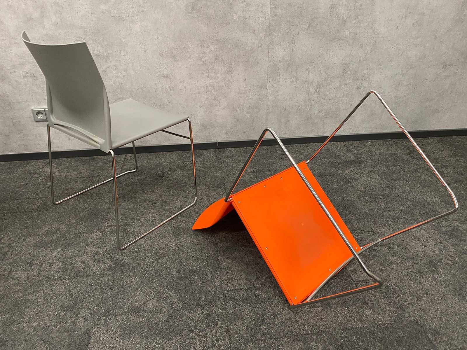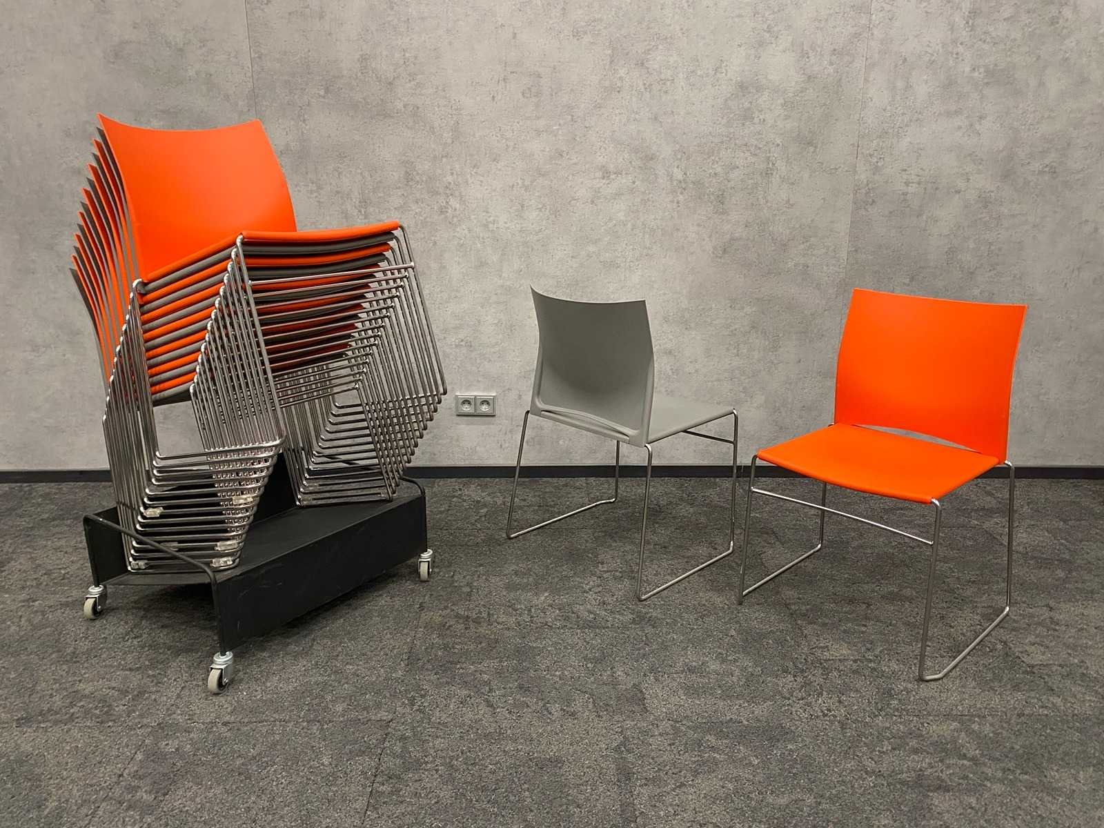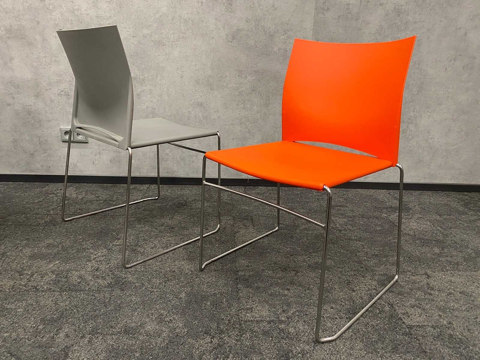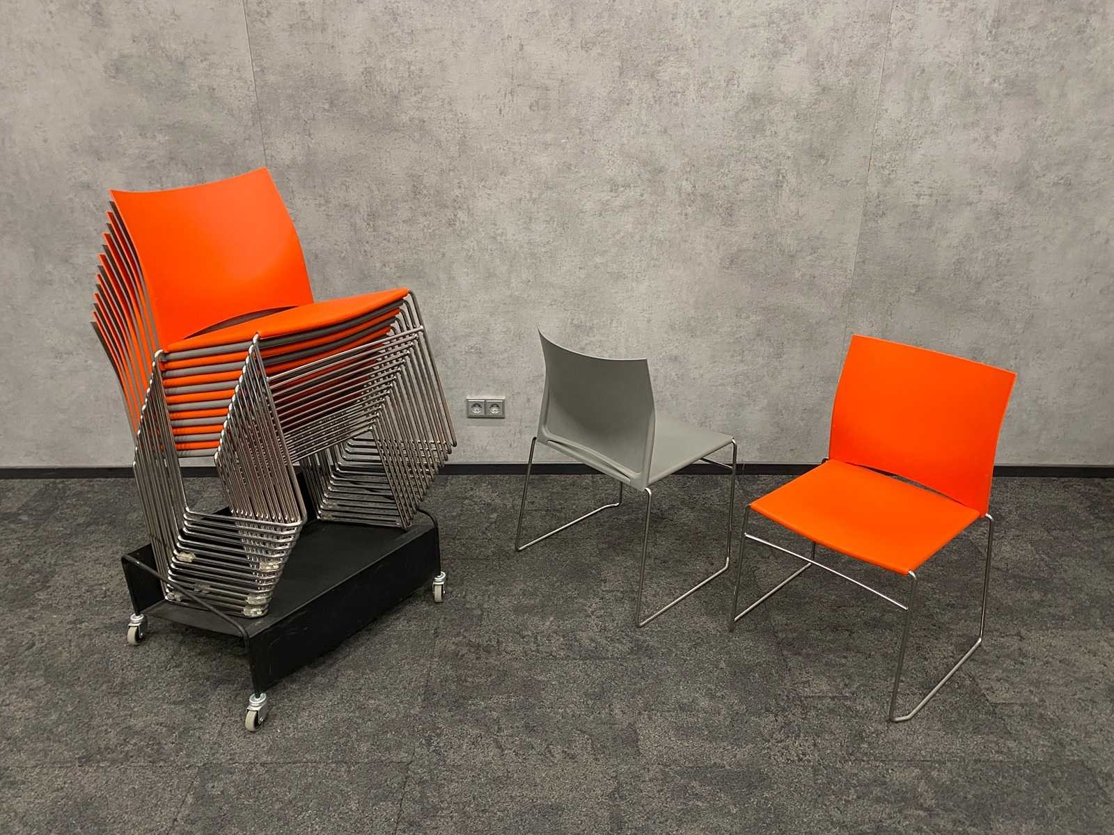 Zithoogte ca. 44 cm. -- v.v. sledeframe Nee Stapelbaar: true Kleur: grijs/ oranje/ chroom Materiaal: metaal, kunststof