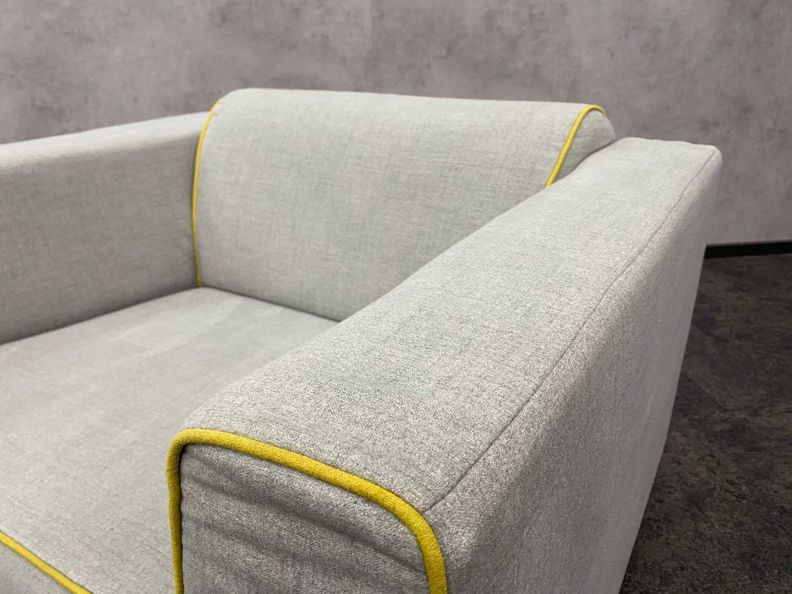 Afm. ca. hxbxd 74x100x92 cm. Nee Merk: 2x X5 Home Kleur: blauw/grijs, mosterd, zwart Zithoogte: 44cm Materiaal: metaal, textiel